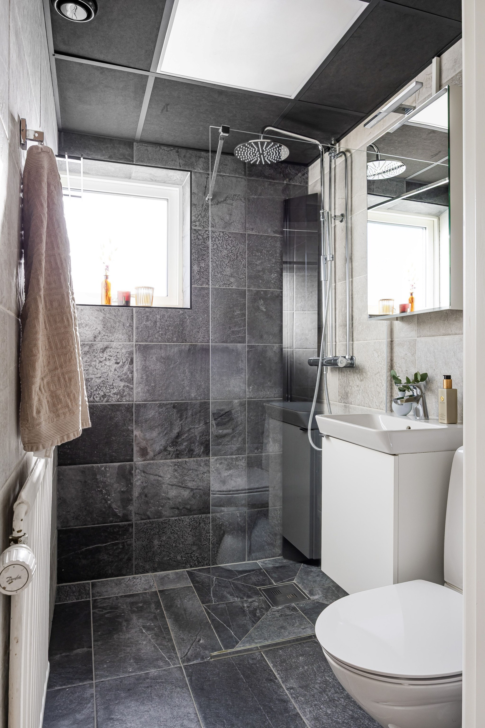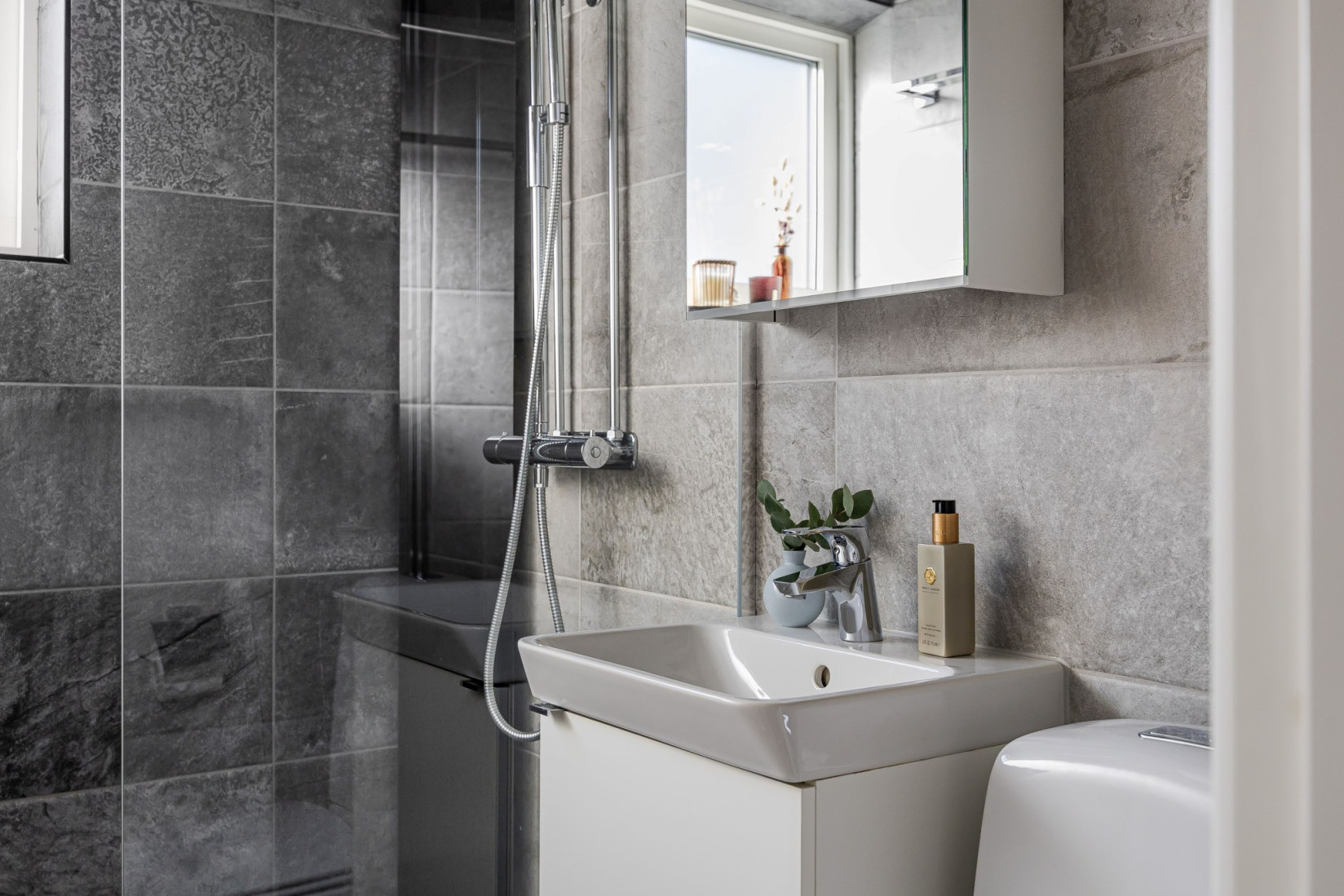 Badrummet ligger rakt fram från hallen och är renoverat, till skillnad från många andra i föreningen. Här finns ett genomtänkt belysningssystem, glasvägg, dusch, handfat med kommod, spegelskåp med belysning samt ett smart förvaringsskåp i duschen. Ett fönster gör det enkelt att vädra.
