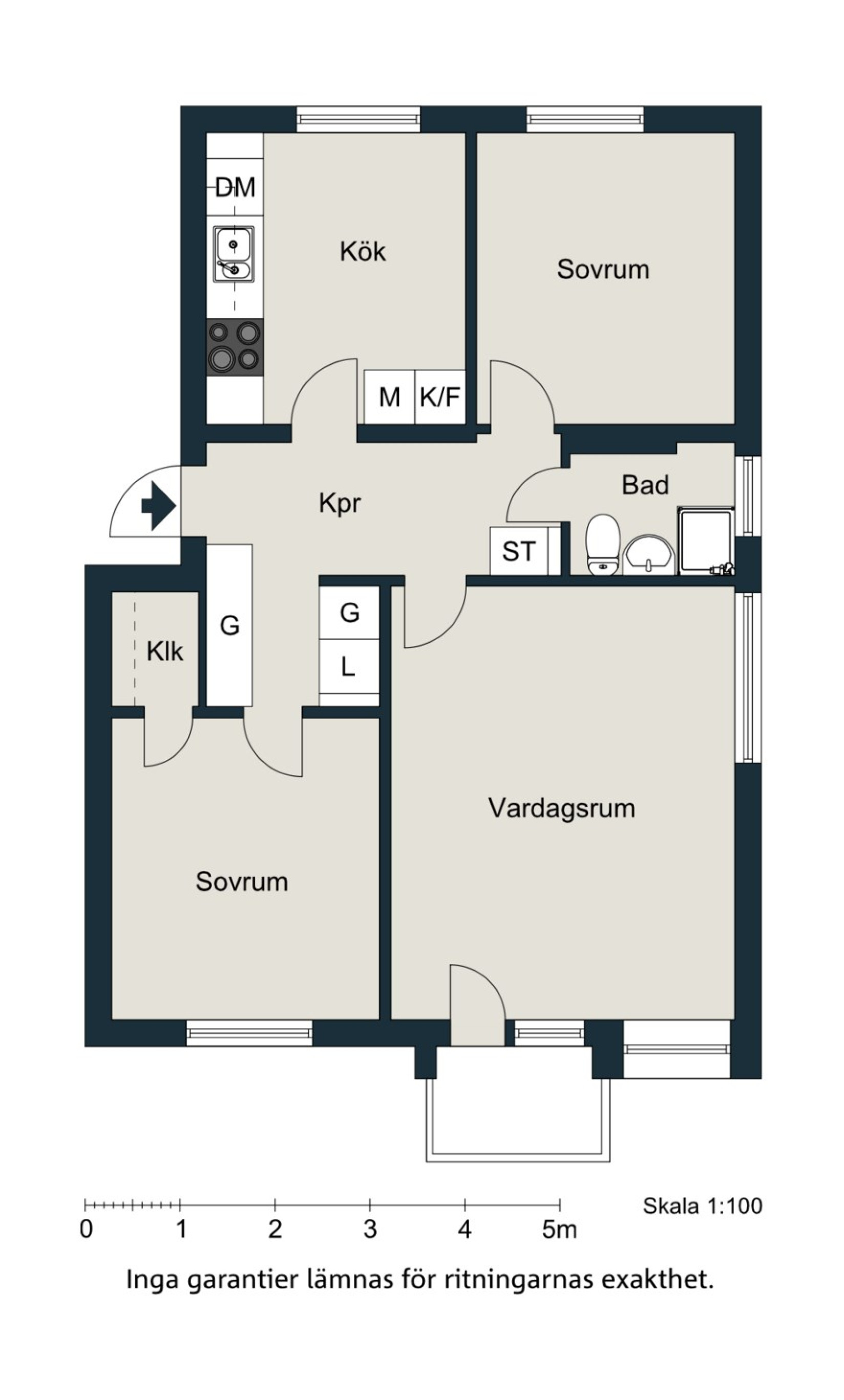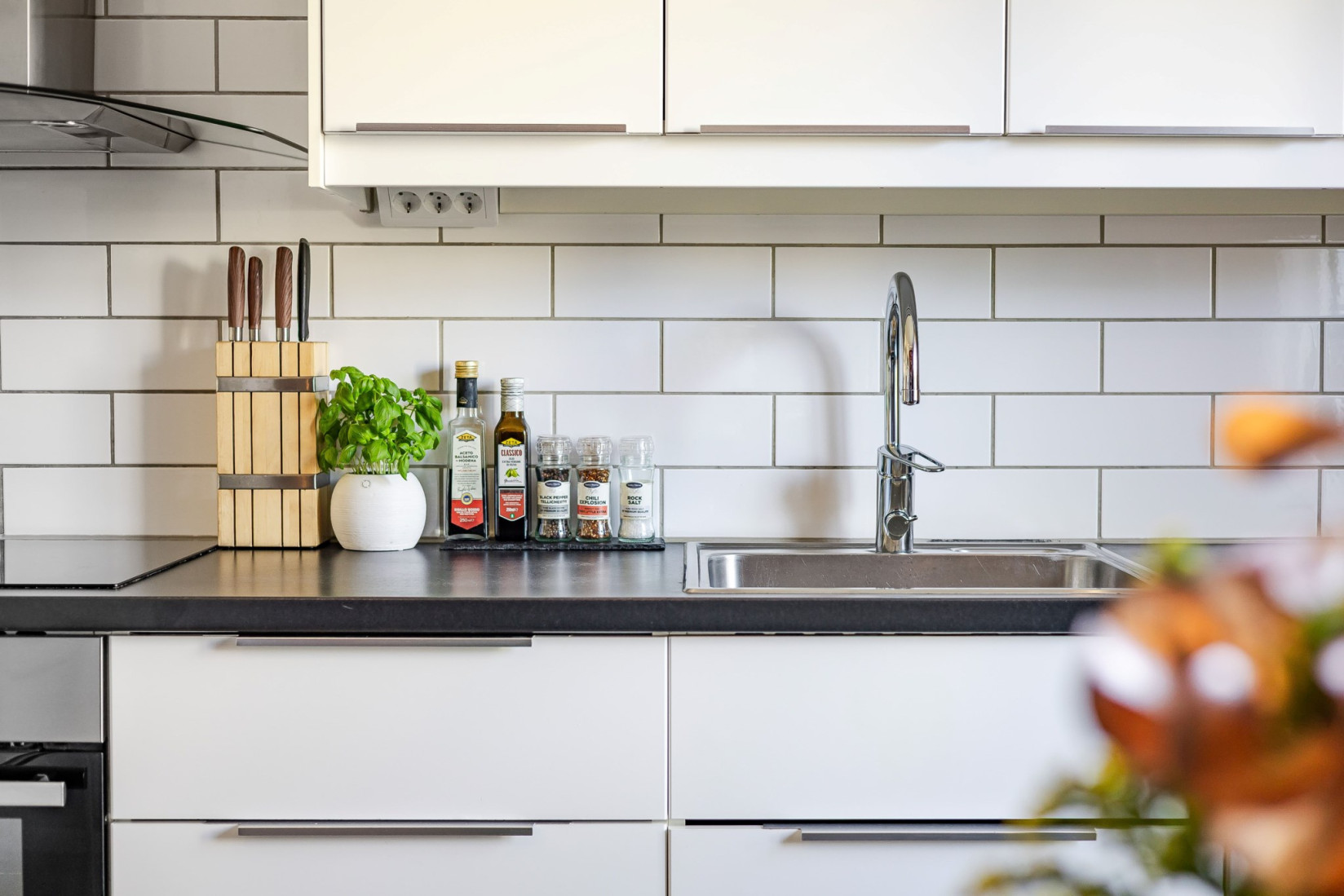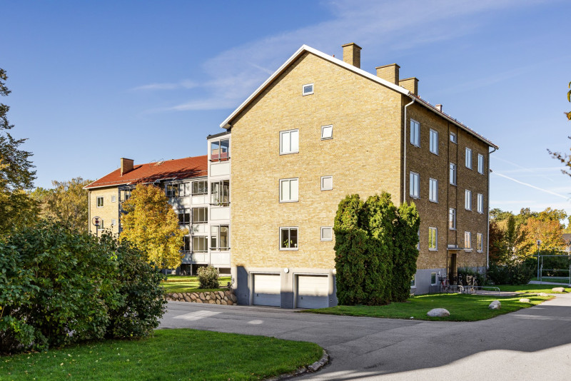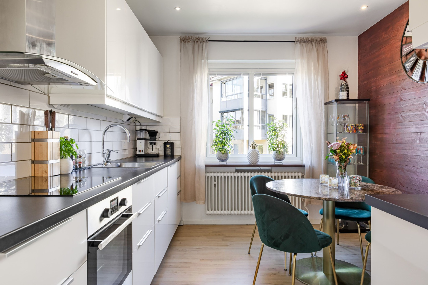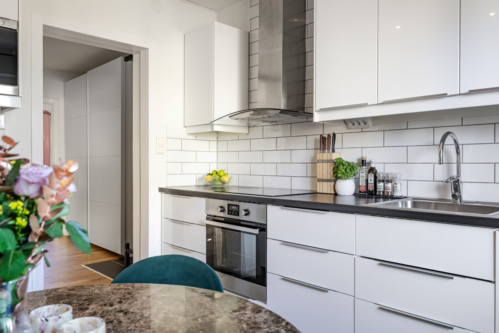 Till vänster från hallen ligger det renoverade köket med generösa arbets- och förvaringsytor. Ljuset flödar in genom fönstret där en naturlig plats för matbord finns. Köket är utrustat med kyl och frys, häll, ugn, fläkt, inbyggd mikro samt diskmaskin.