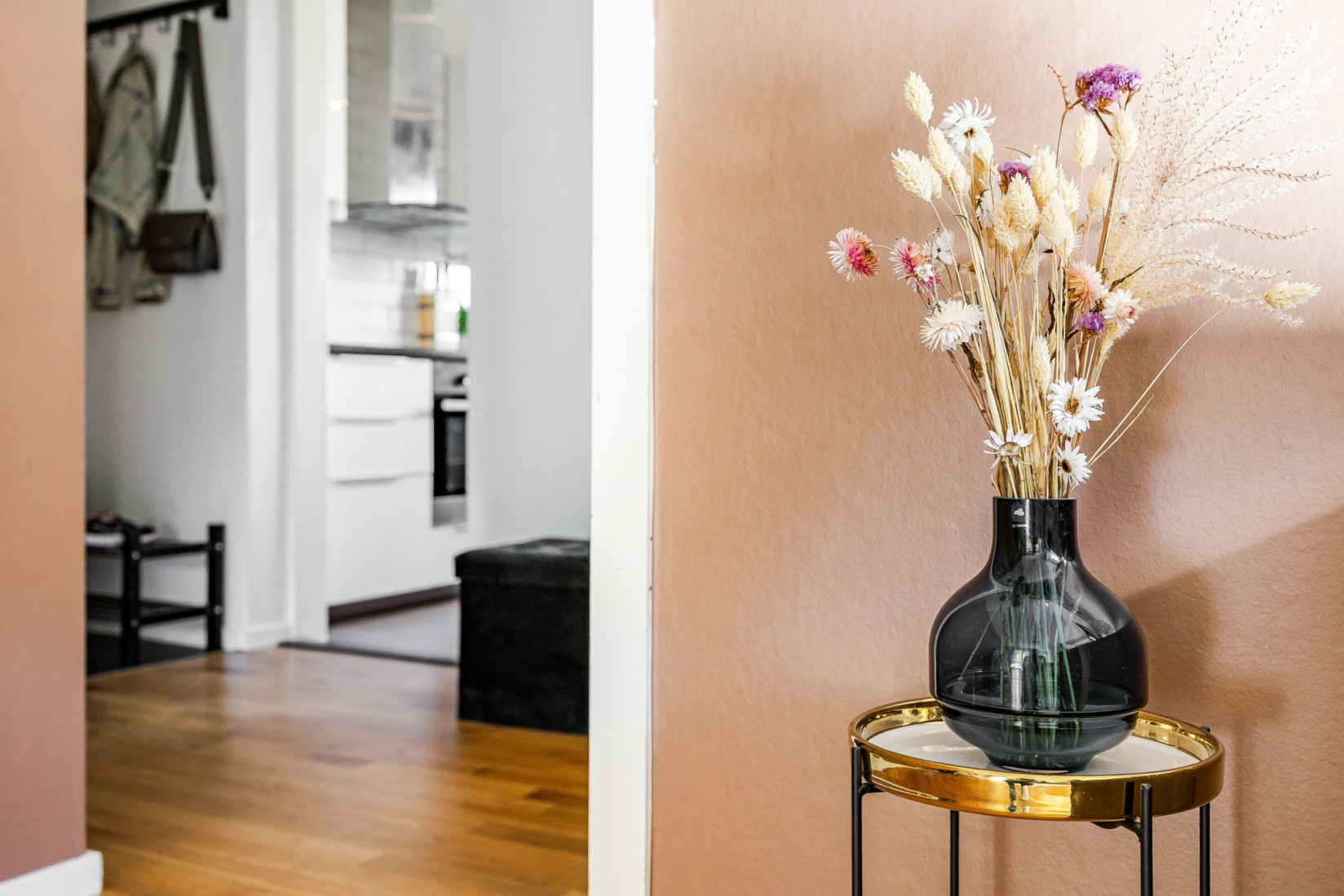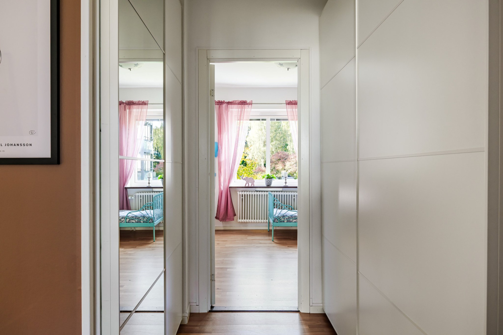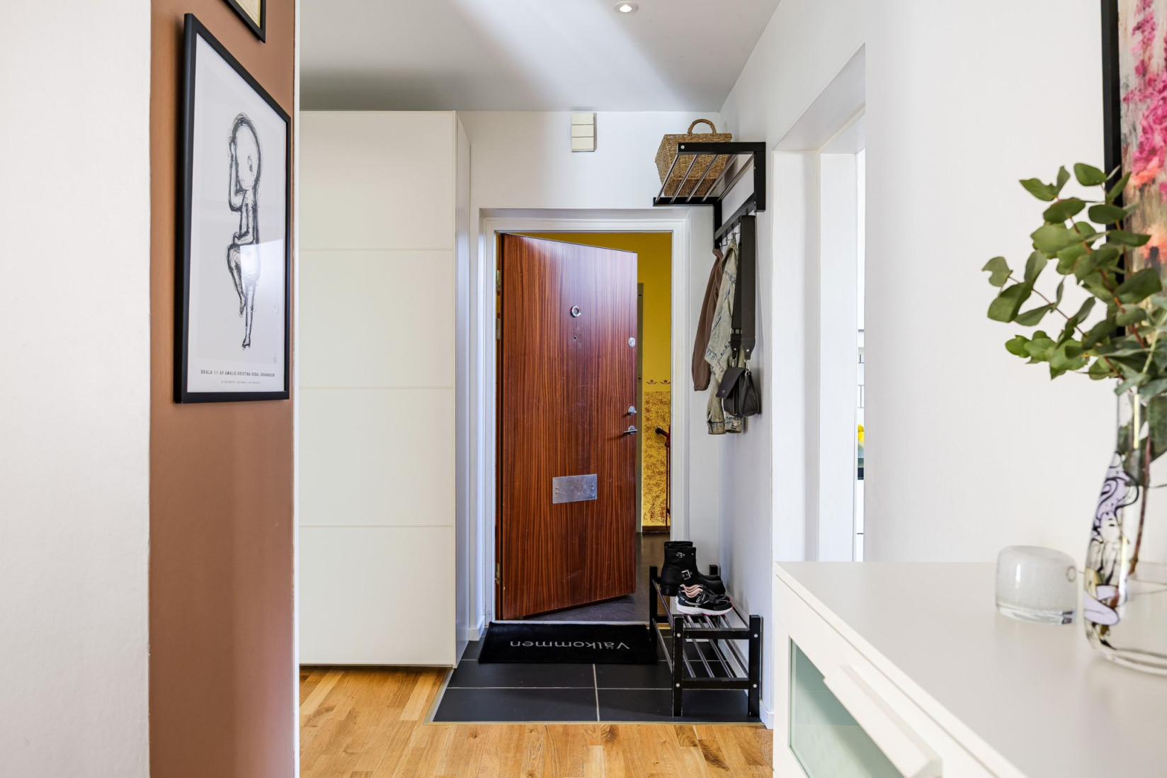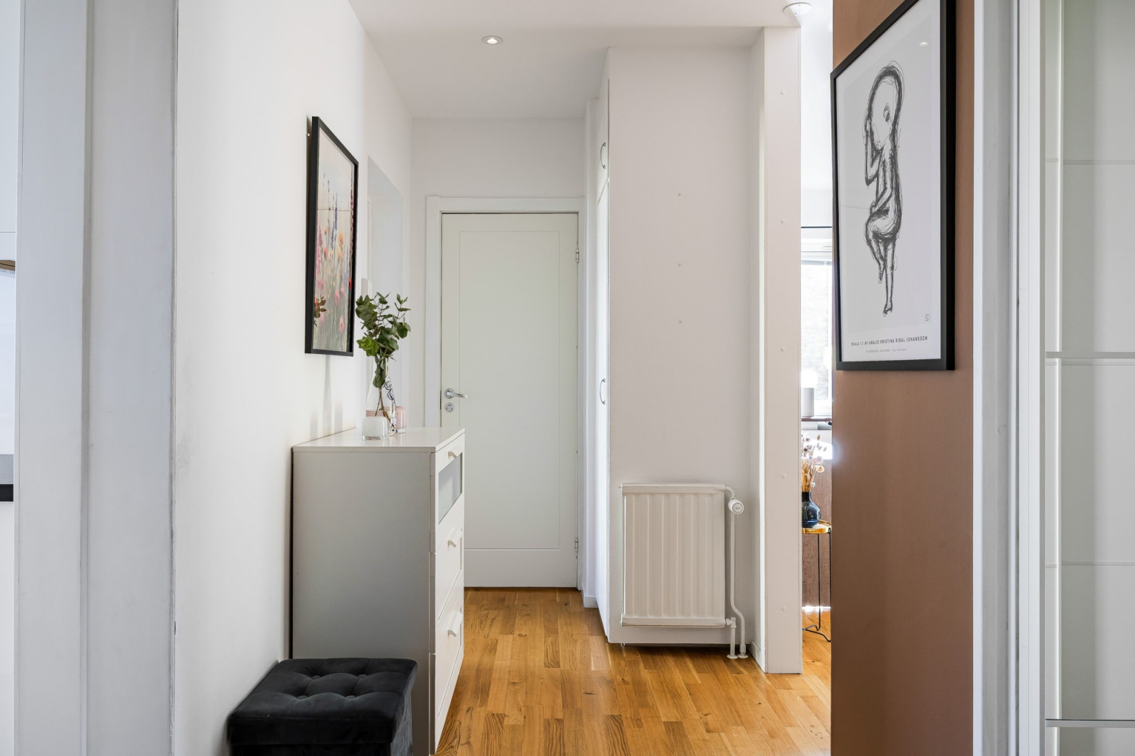 Slå in portkoden till Ståthållaregatan 60D och kliv in i en ljus och inbjudande hall med smidig access till hemmets alla rum. Här finns ett garderobsparti med skjutdörrar på båda sidor och infällda LED-spotlights i taket som ger ett behagligt ljus.