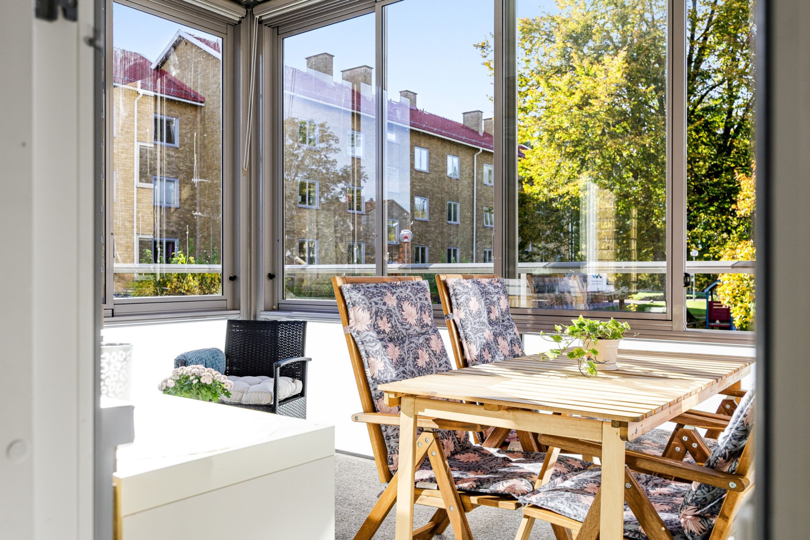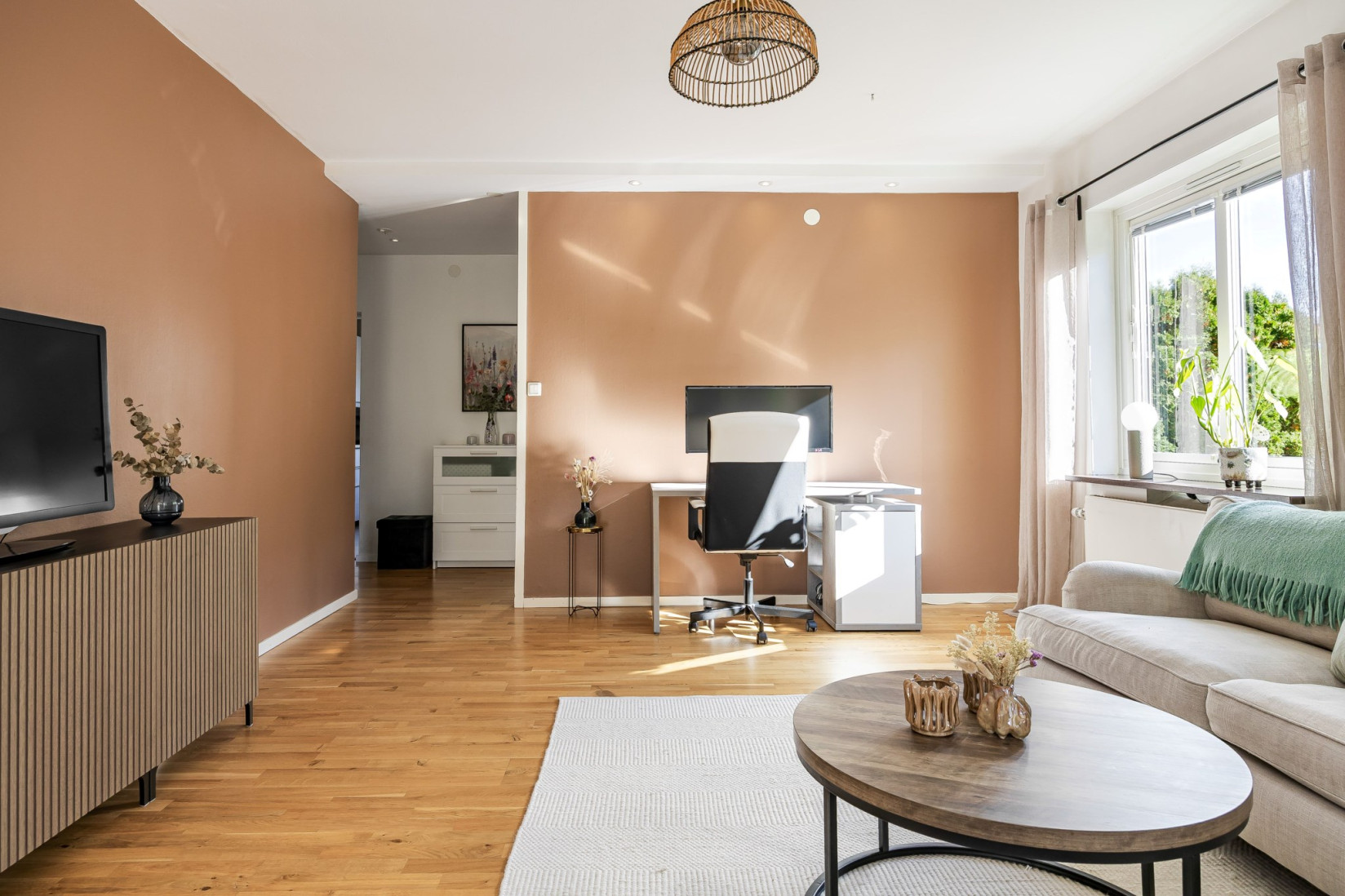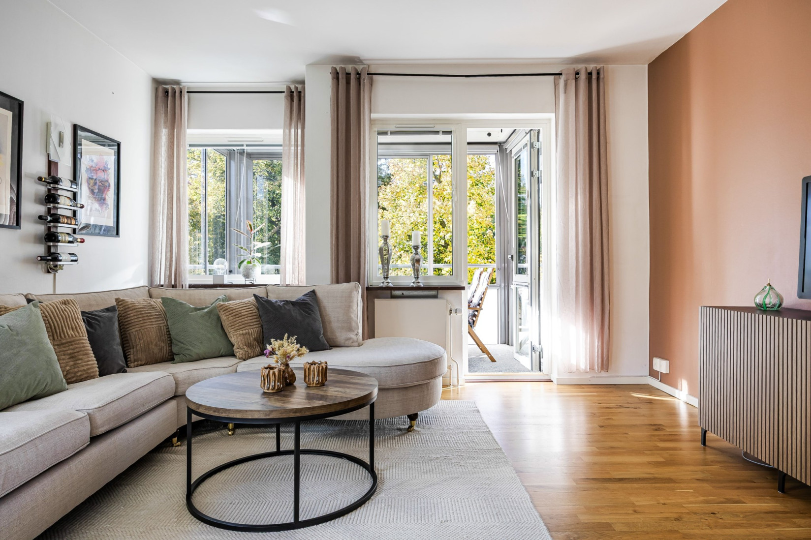 Öppet från hallen, i bostadens hörn, ligger vardagsrummet där de infällda spotlightsen fortsätter längs väggen. Här är det fönster i två väderstreck vilket ger ett ljust och trivsamt intryck. Från vardagsrummet nås den inglasade balkongen – en välplanerad förlängning av den sociala ytan med fritt läge mot skogen.
