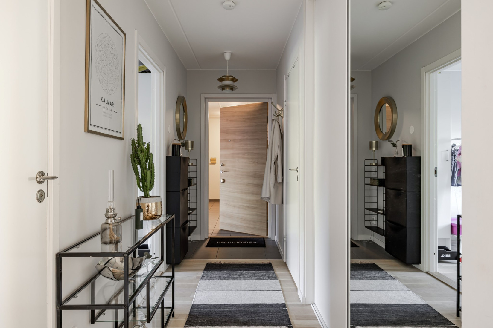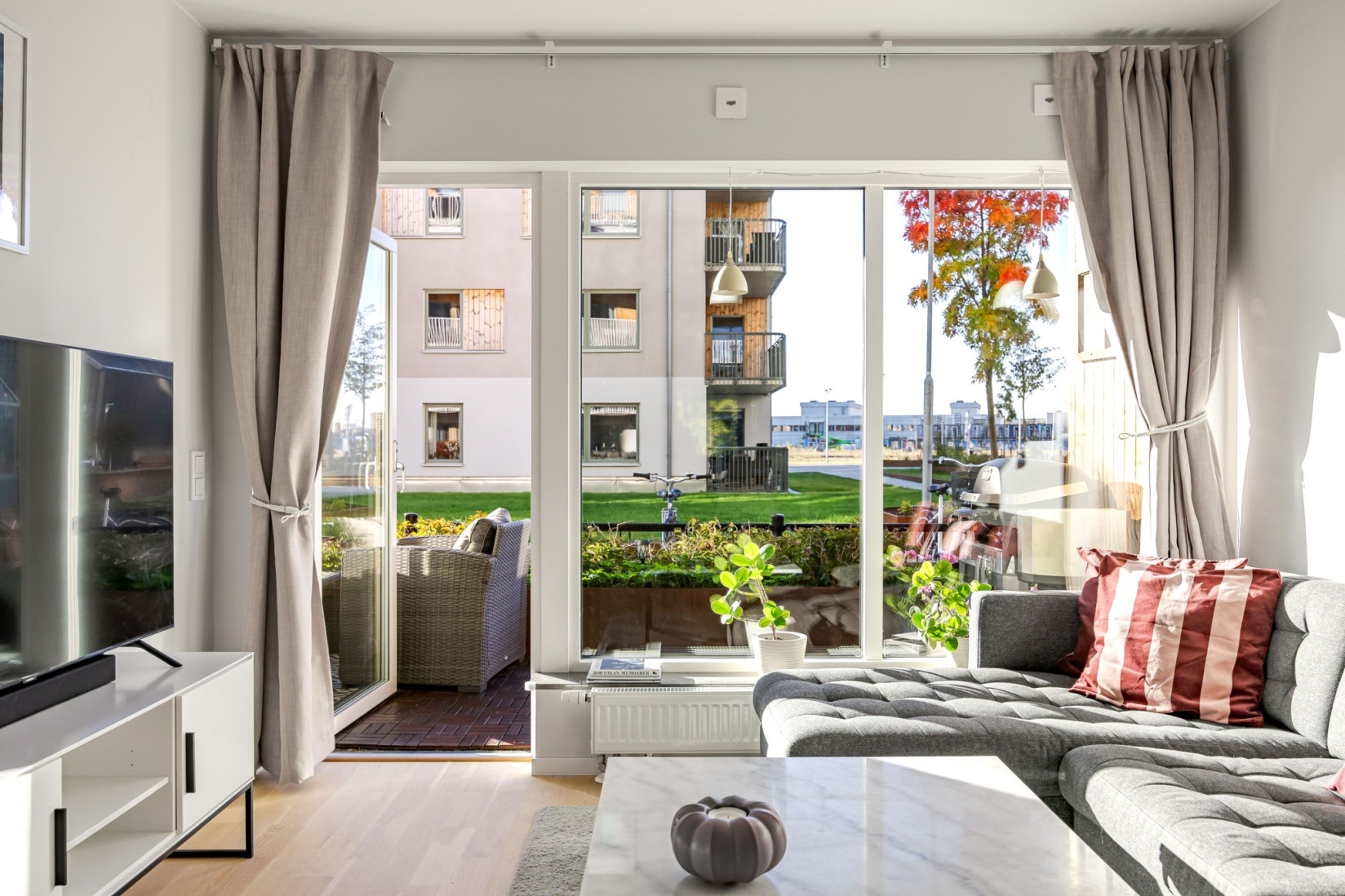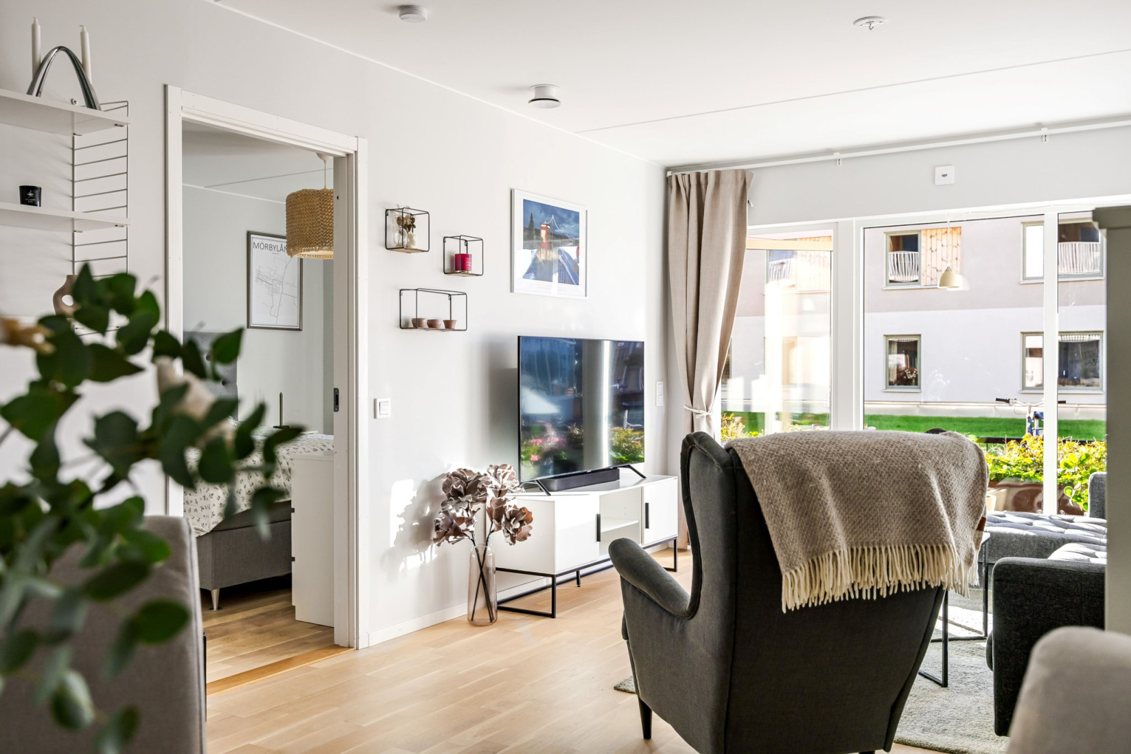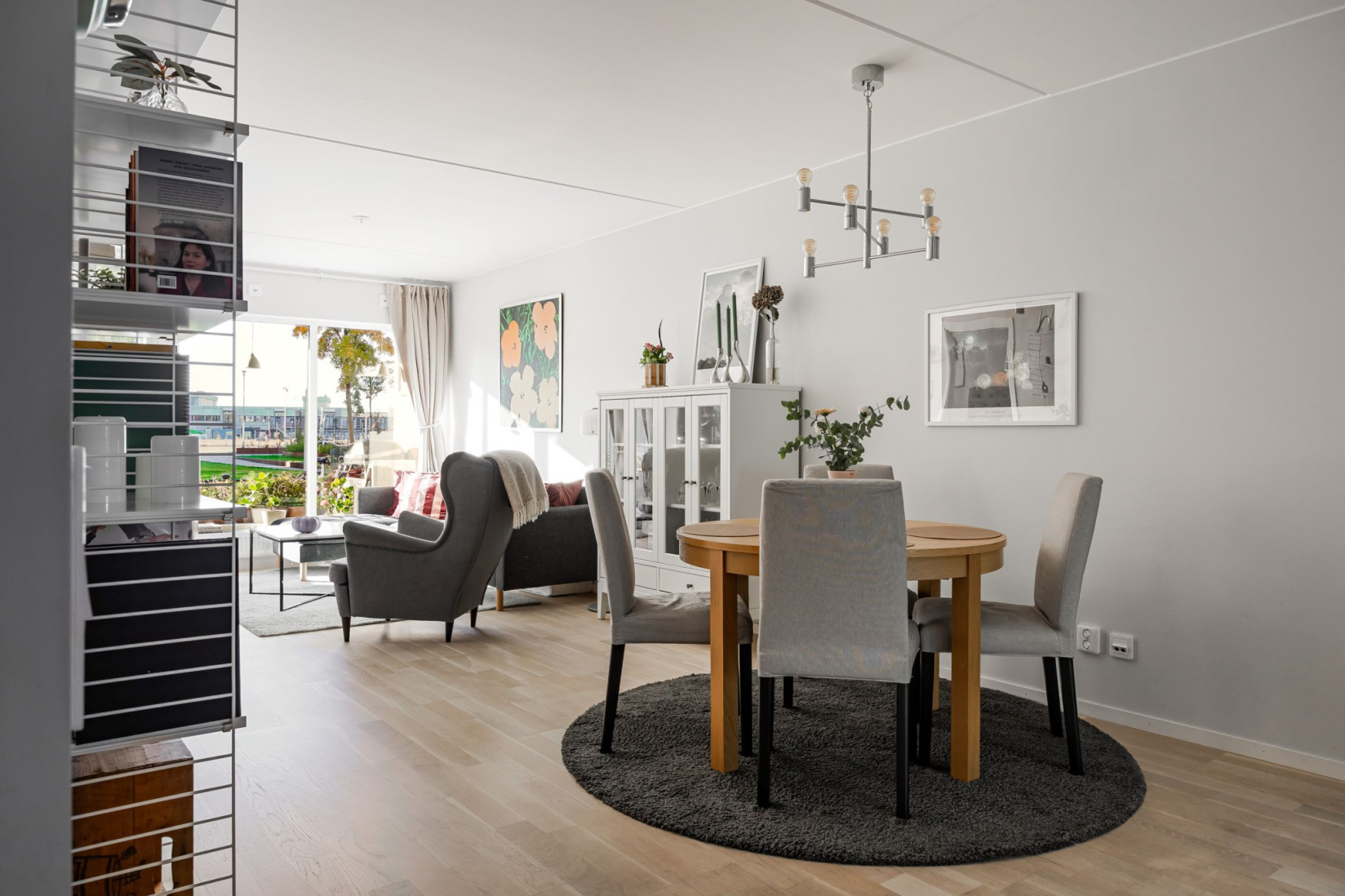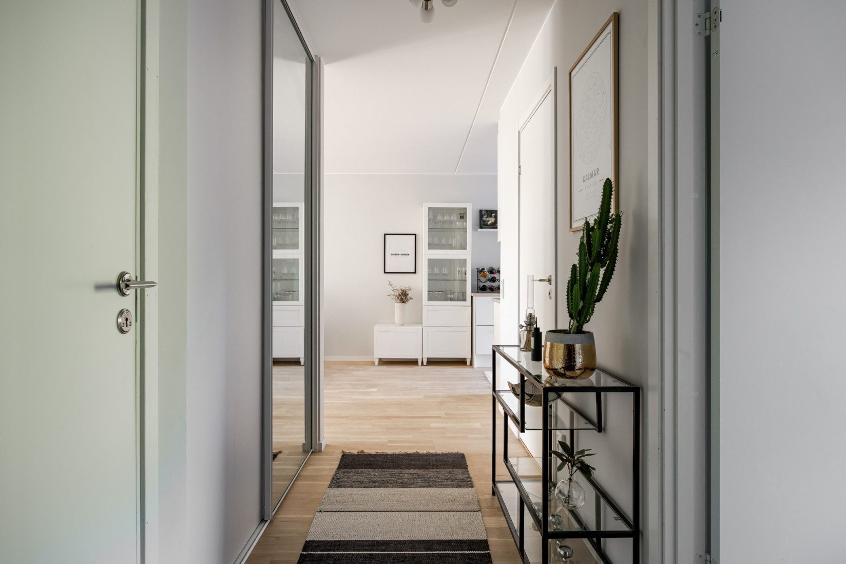Tänk dig bekvämligheten i att köra bilen rakt ner i garaget, koppla in laddningen och från samma plan ta hissen upp till bostaden. Just denna bostad väntar bekvämt på våning 1 med uteplats. Stig in och låt tre rum och kök visas. Redan i hallen möts du av ett behagligt ljusinsläpp. Här finns plats för avhängning av ytterkläder och skor i skjutdörrsgarderober samt ett stort förråd där i princip allt får plats. Fötterna har då redan mött ett slitstarkt klinkergolv som sedan övergår i vitpigmenterad ekparkett som löper enhetligt genom hela bostaden.