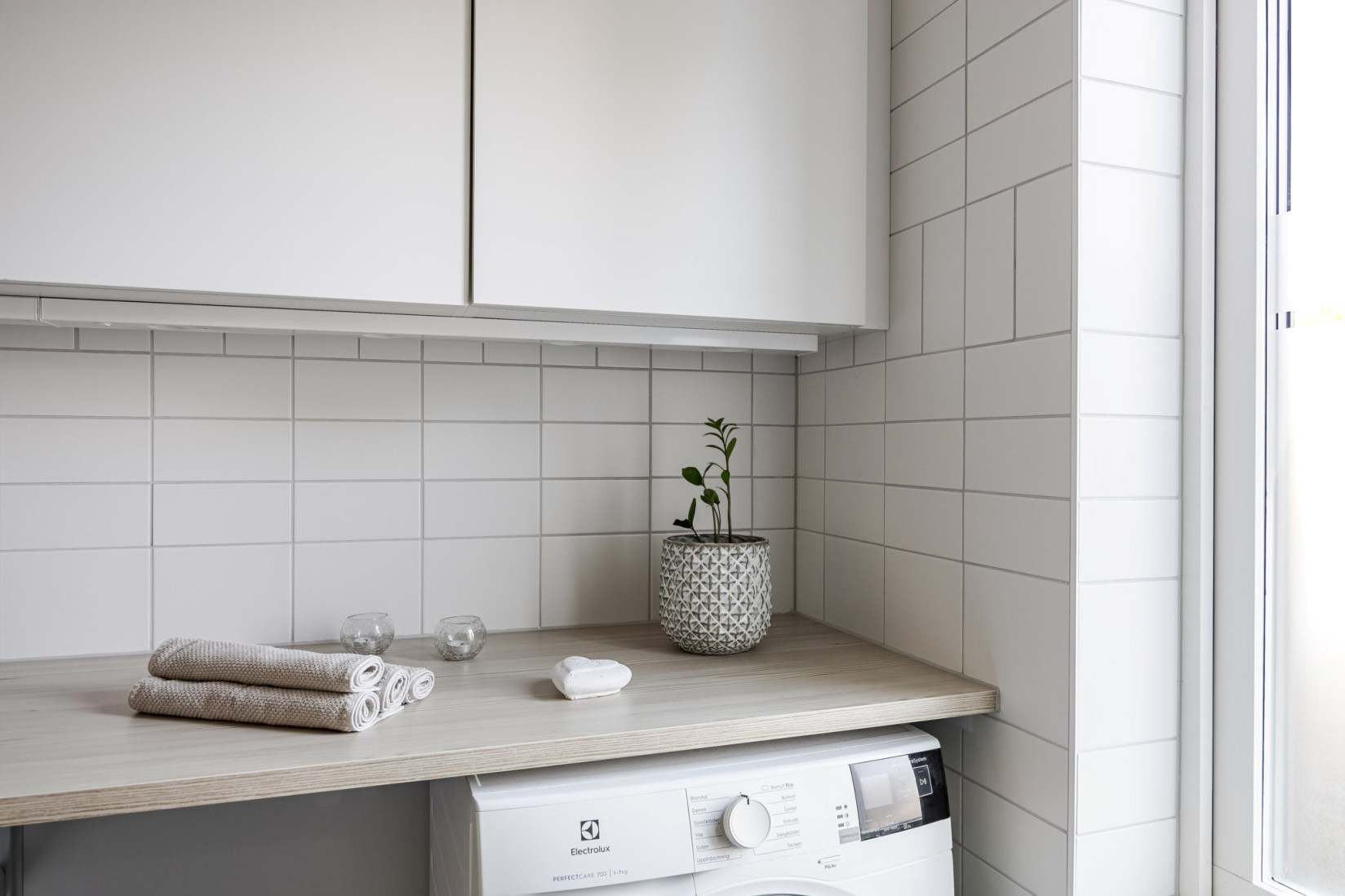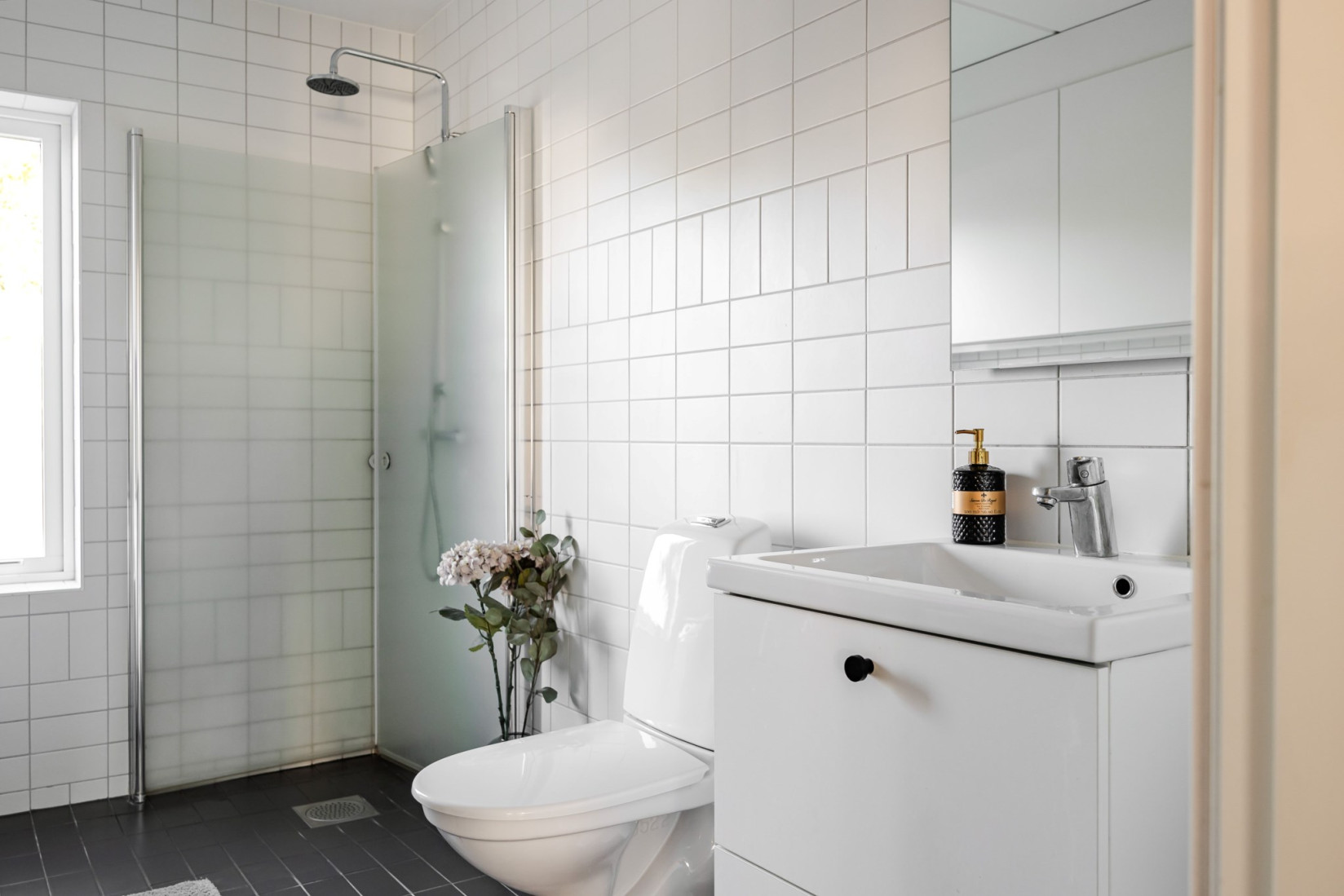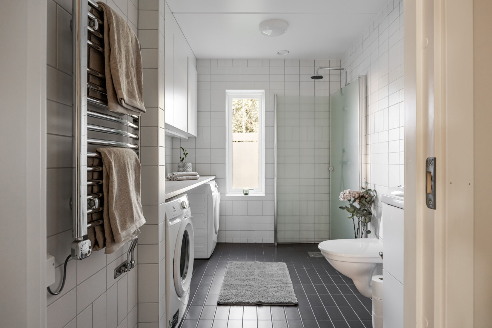 Stilrent, helkaklat badrum med golvvärme, handdukstork samt tvättmaskin och torktumlare med praktisk bänkyta och förvaringsskåp. Här finns även wc, handfat med kommod samt dusch med takdusch och glasdörrar. Ett fönster ger både ljus och möjlighet till vädring.