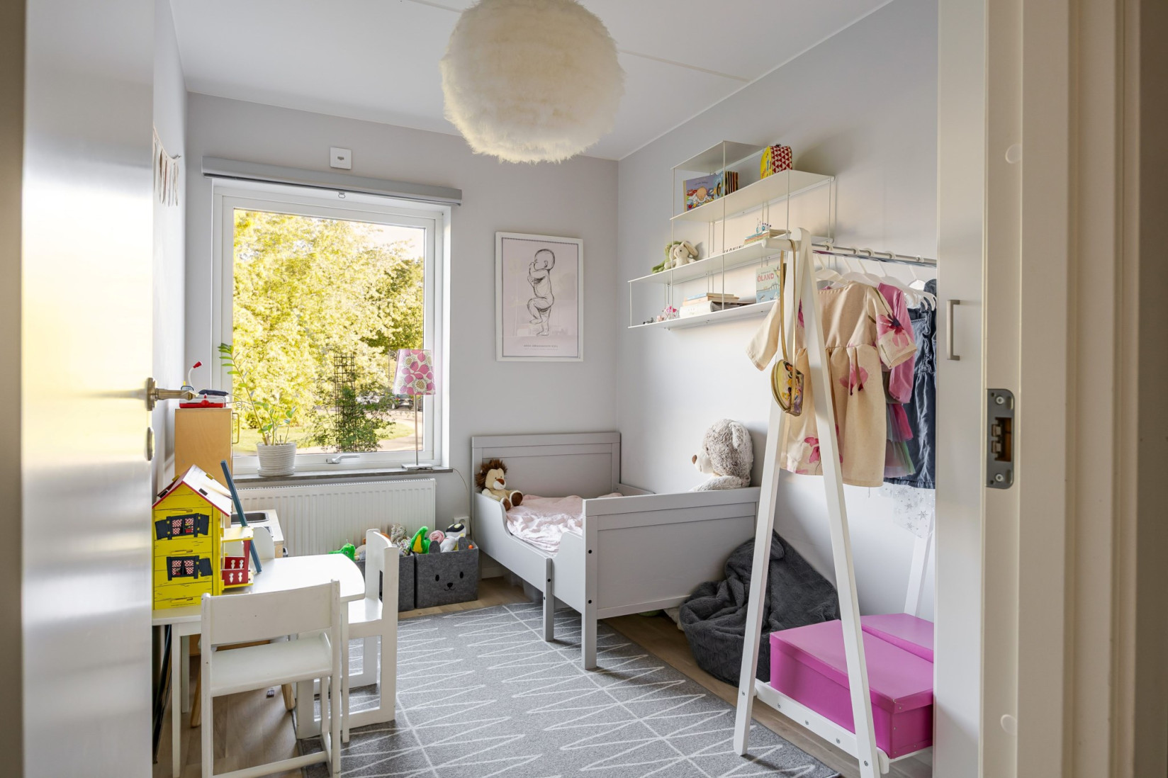 I anslutning till hallen ligger det första sovrummet som passar utmärkt som barnrum, gästrum eller kontor beroende på behov.