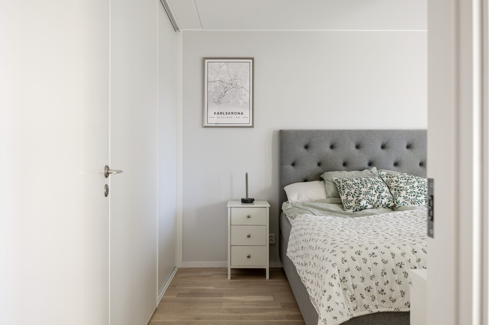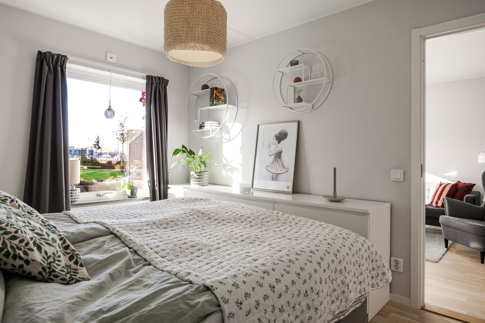 Bostadens andra sovrum nås via vardagsrummet. Det är väl tilltaget, har ett fint ljusinsläpp och generös förvaring i skjutdörrsgarderober som gör det lätt att hålla ordning.