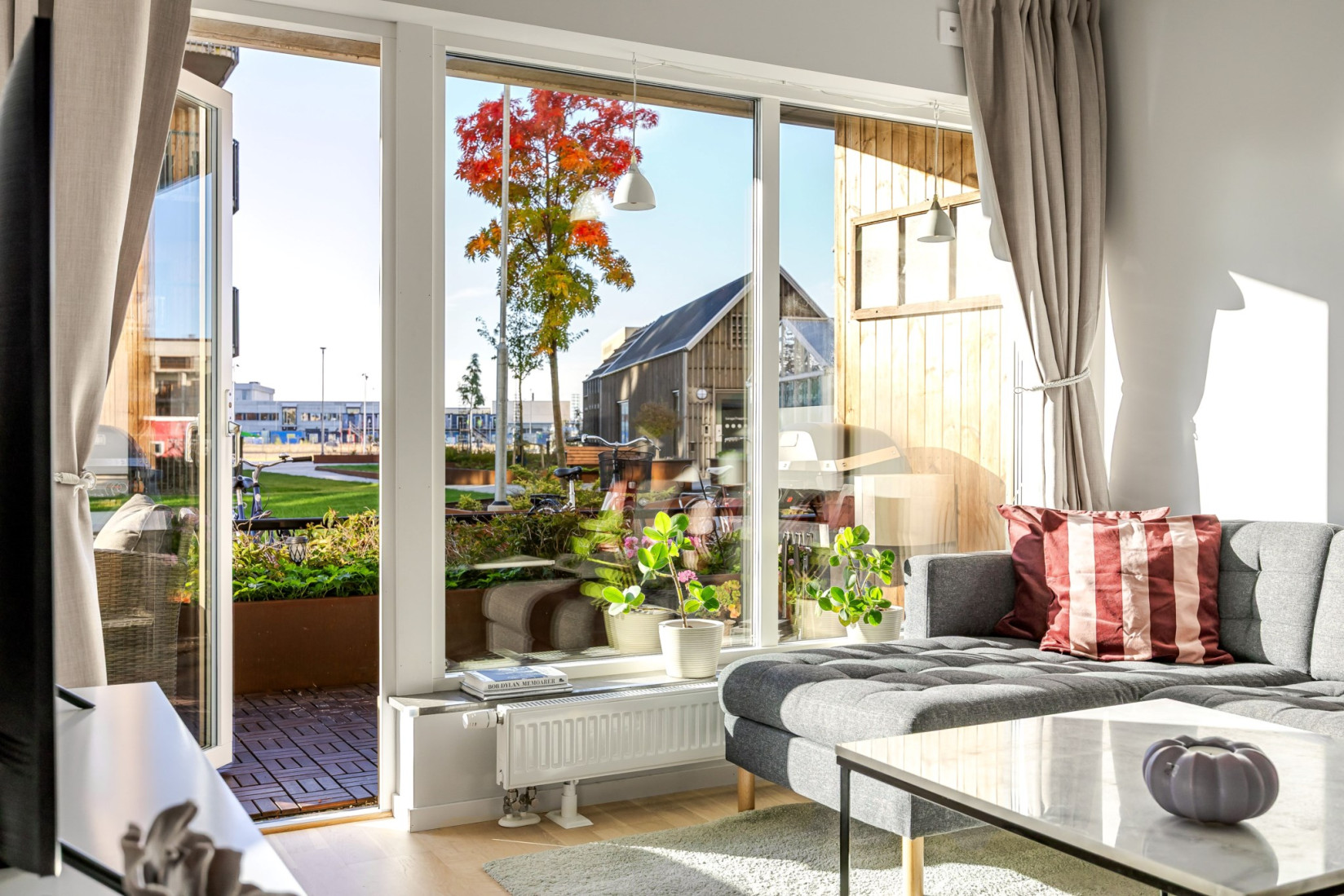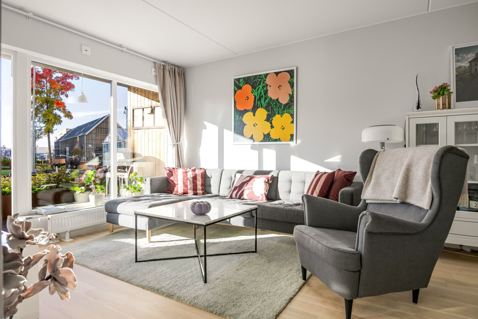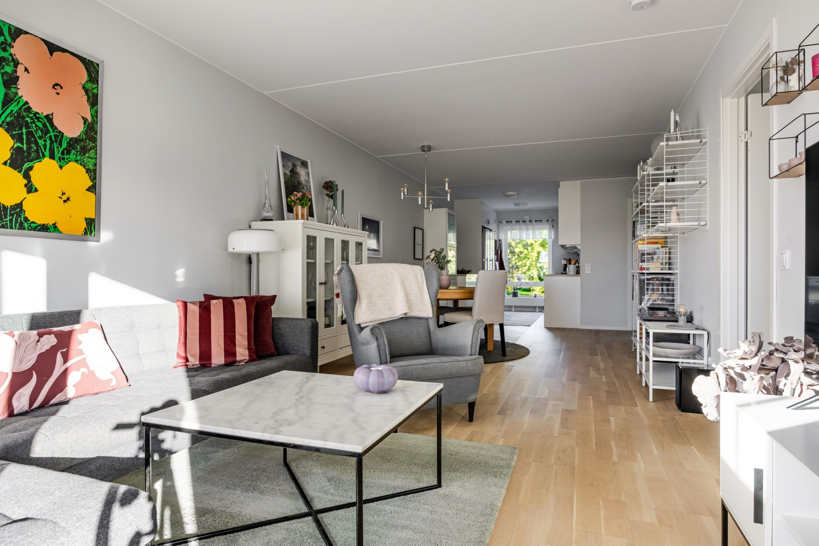 Ljuvligt vardagsrum med behagliga färgval och fantastiskt ljusinsläpp från det stora fönsterpartiet mot den generösa söderuteplatsen som suddar ut gränsen mellan ute och inne. Här kommer många timmar att tillbringas. Mellan kök och vardagsrum finns ett perfekt utrymme för det stora matbordet.