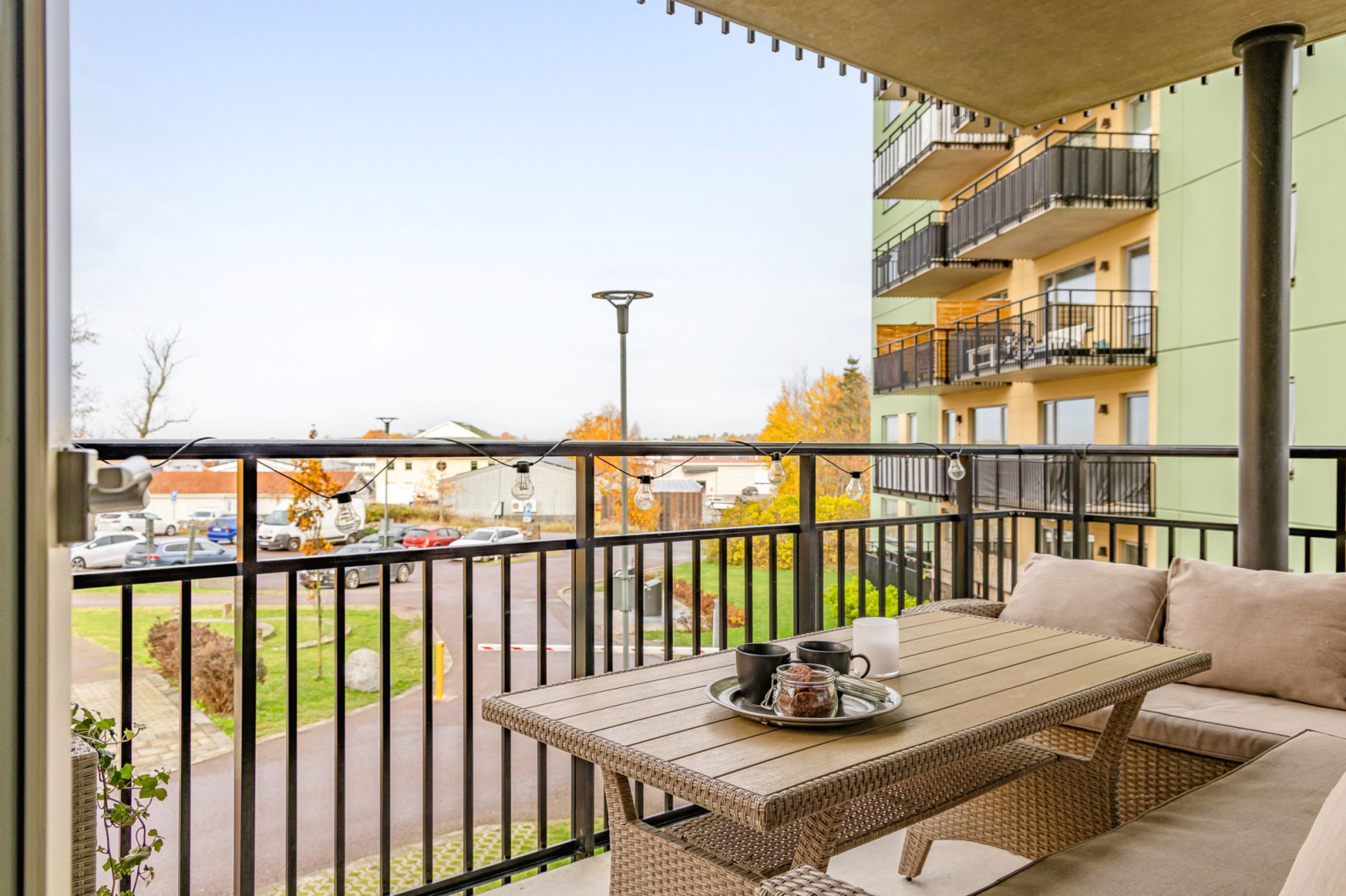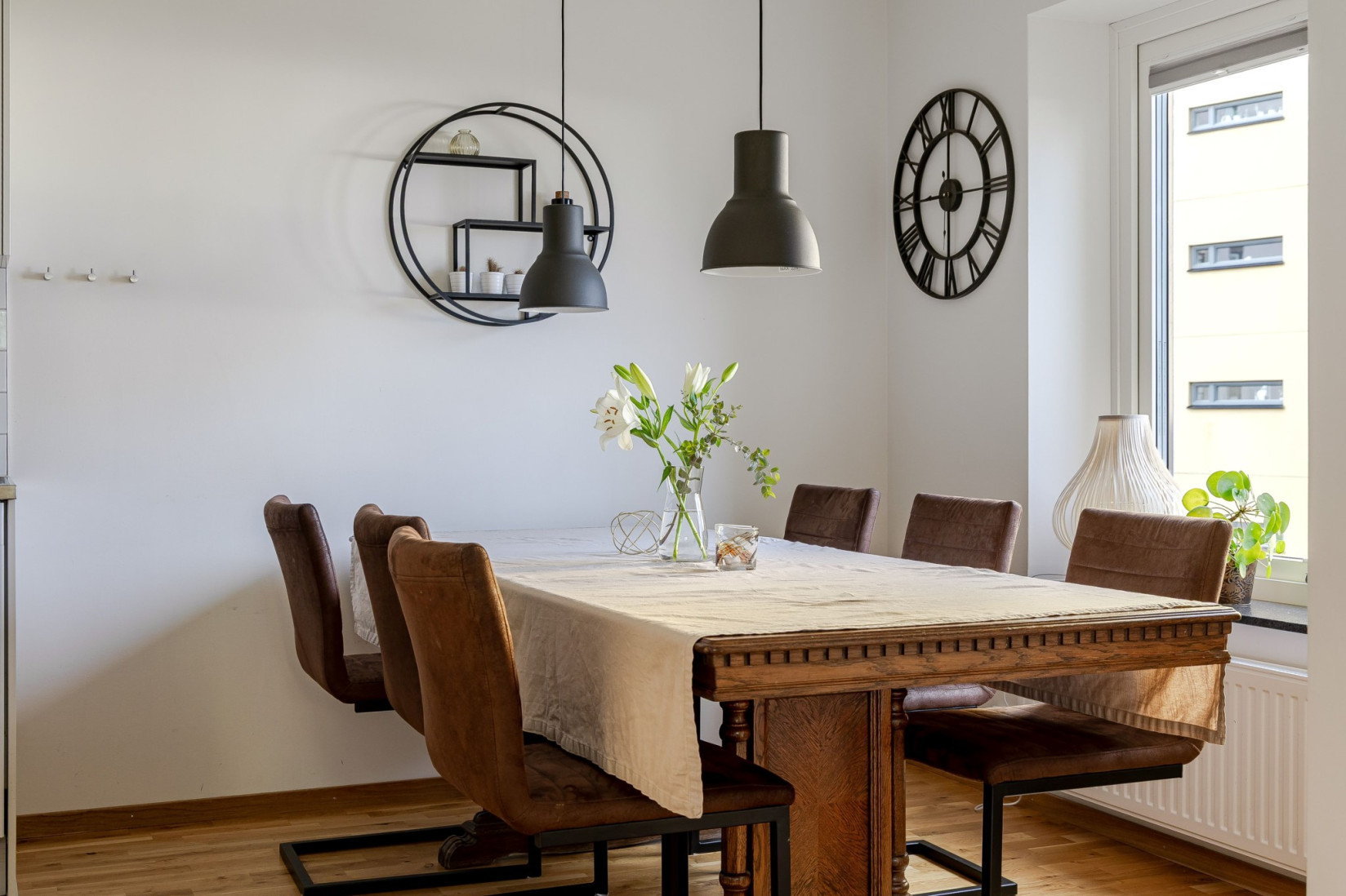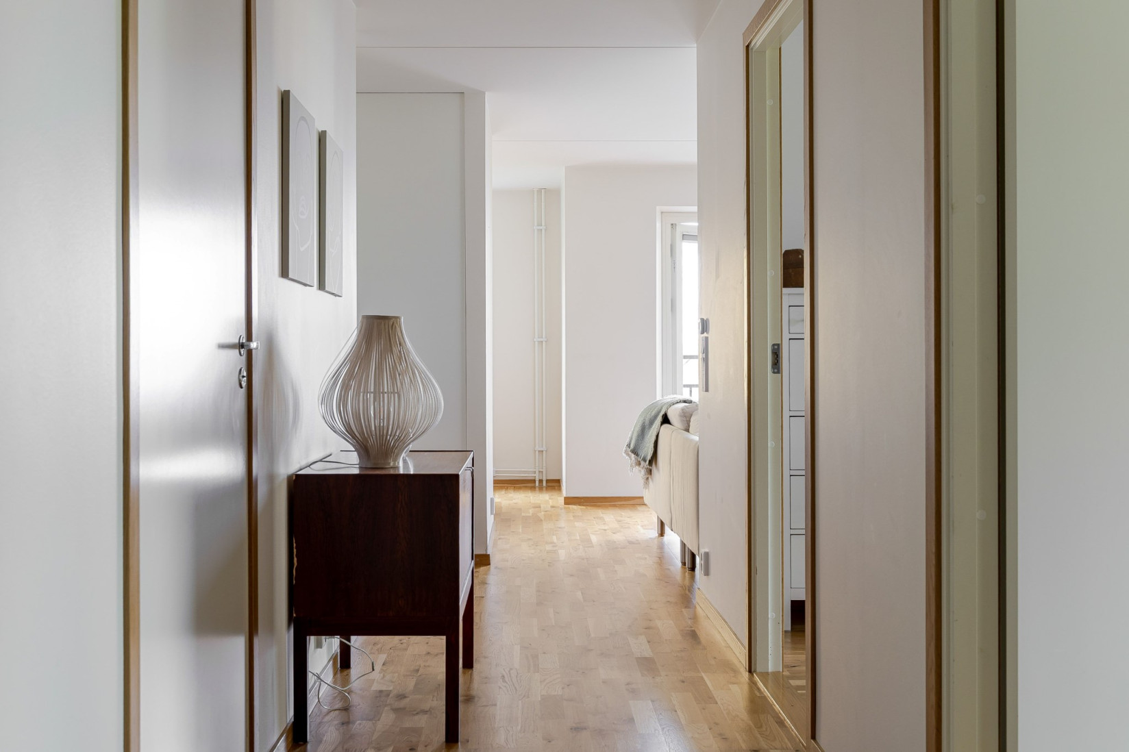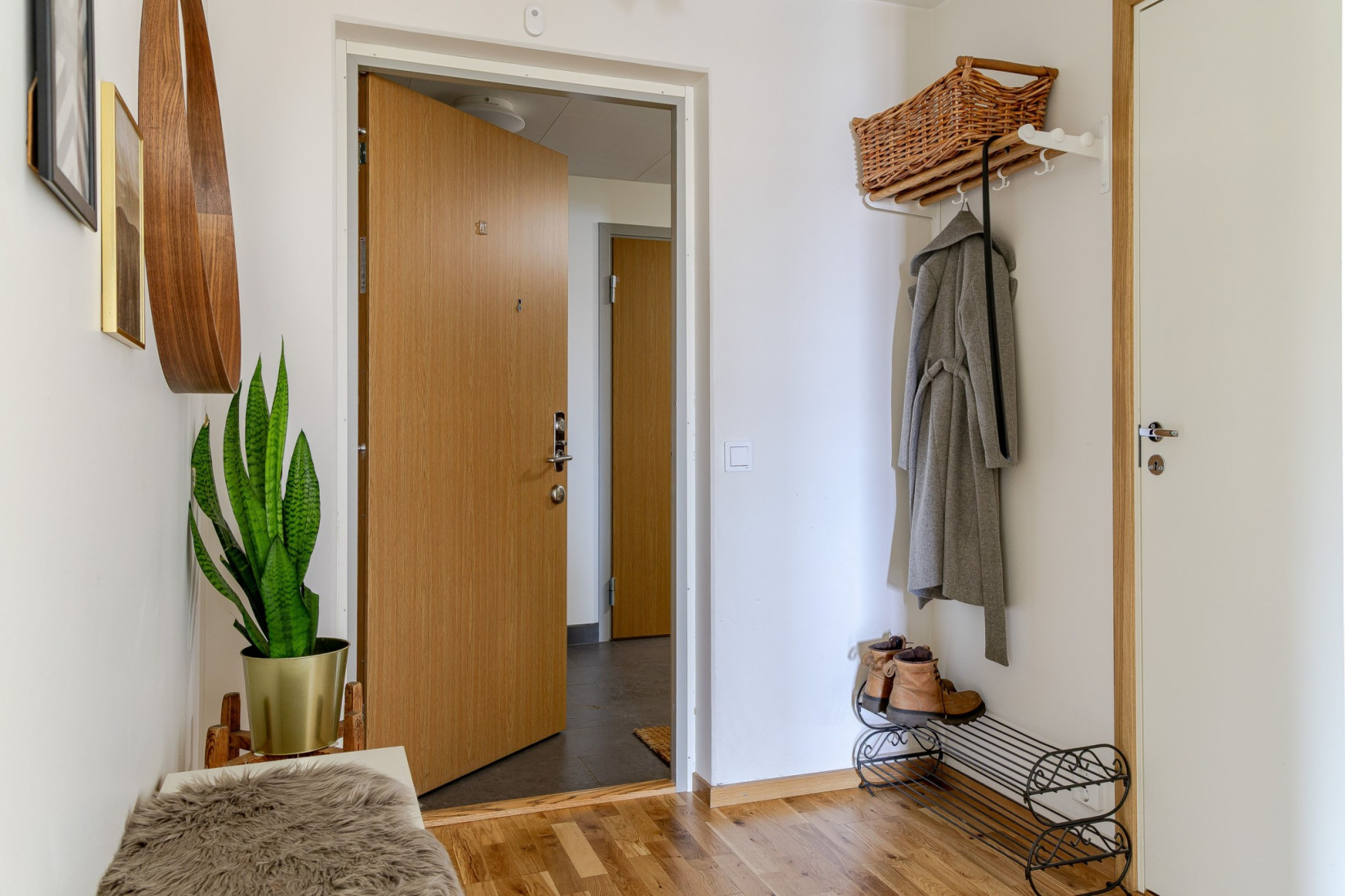 Hiss eller trappa? Valet är ditt! På andra våningen väntar denna trea. Innanför dörren möts du av ett vackert parkettgolv i ek som löper genom hela bostaden, och ett härligt ljus som sätter tonen för resten av hemmet. Hallen erbjuder plats för ytterkläder och en generös klädkammare – perfekt för ordning, förvaring eller som liten arbetsyta.