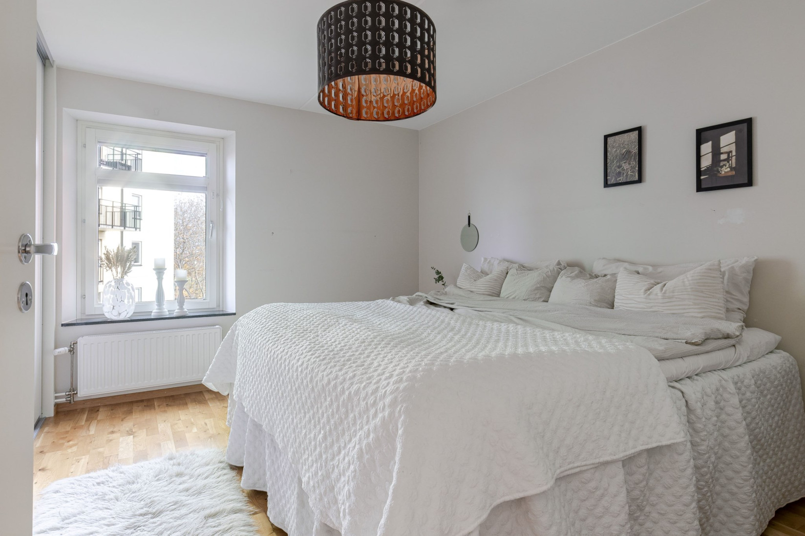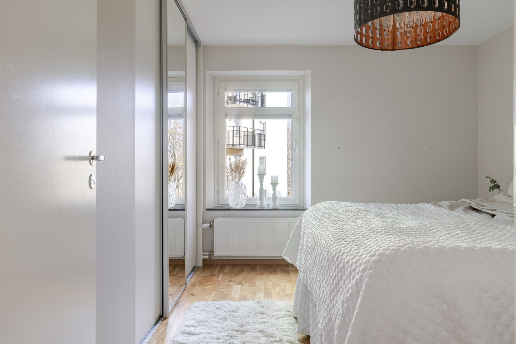 Direkt till höger från hallen ligger bostadens största sovrum med skjutdörrsgarderober med spegel. Här får en stor dubbelsäng, nattduksbord och ytterligare möblering plats utan problem.