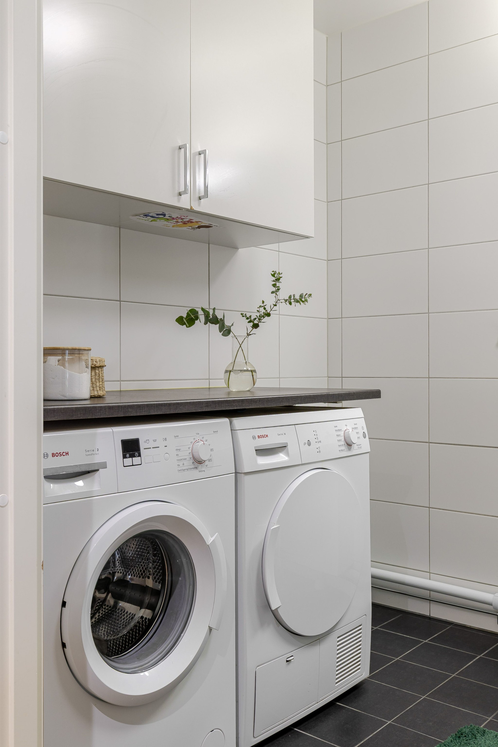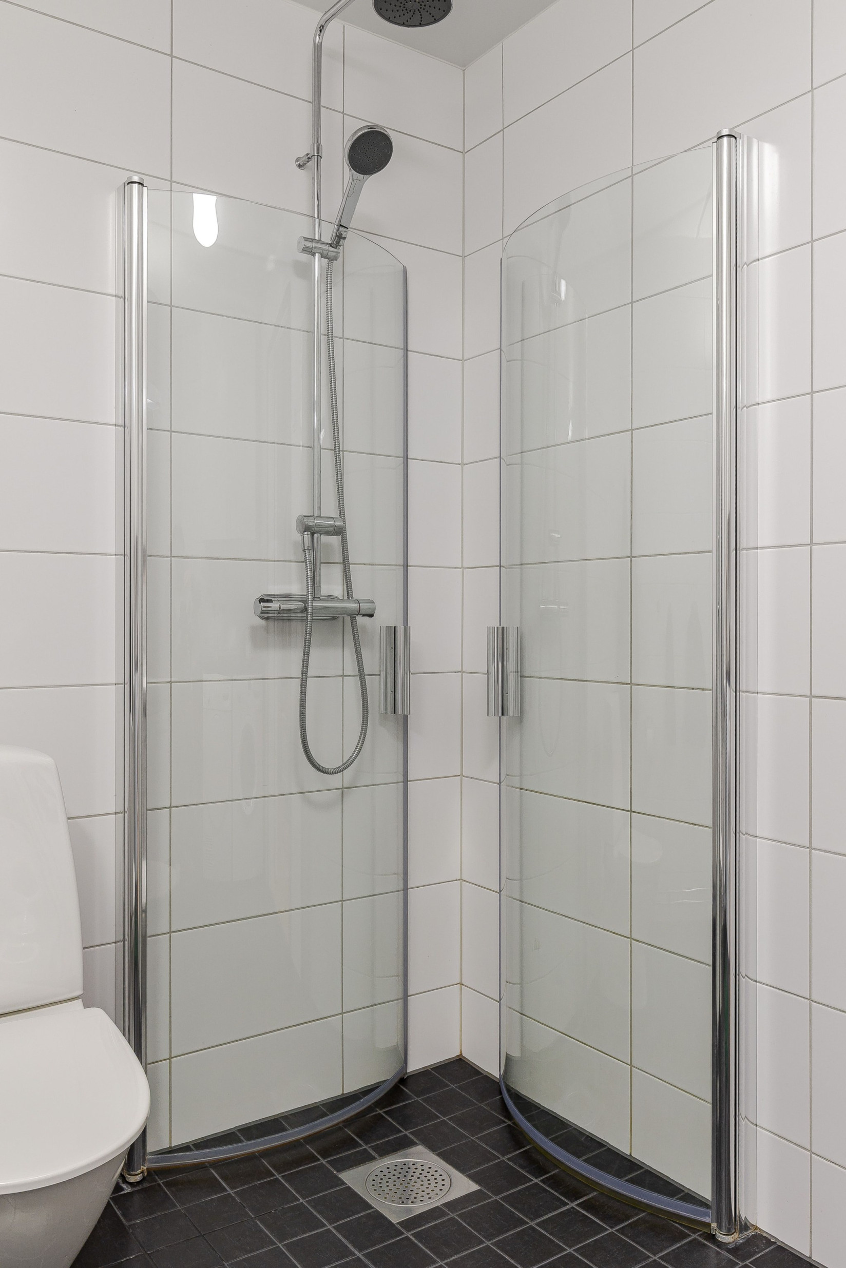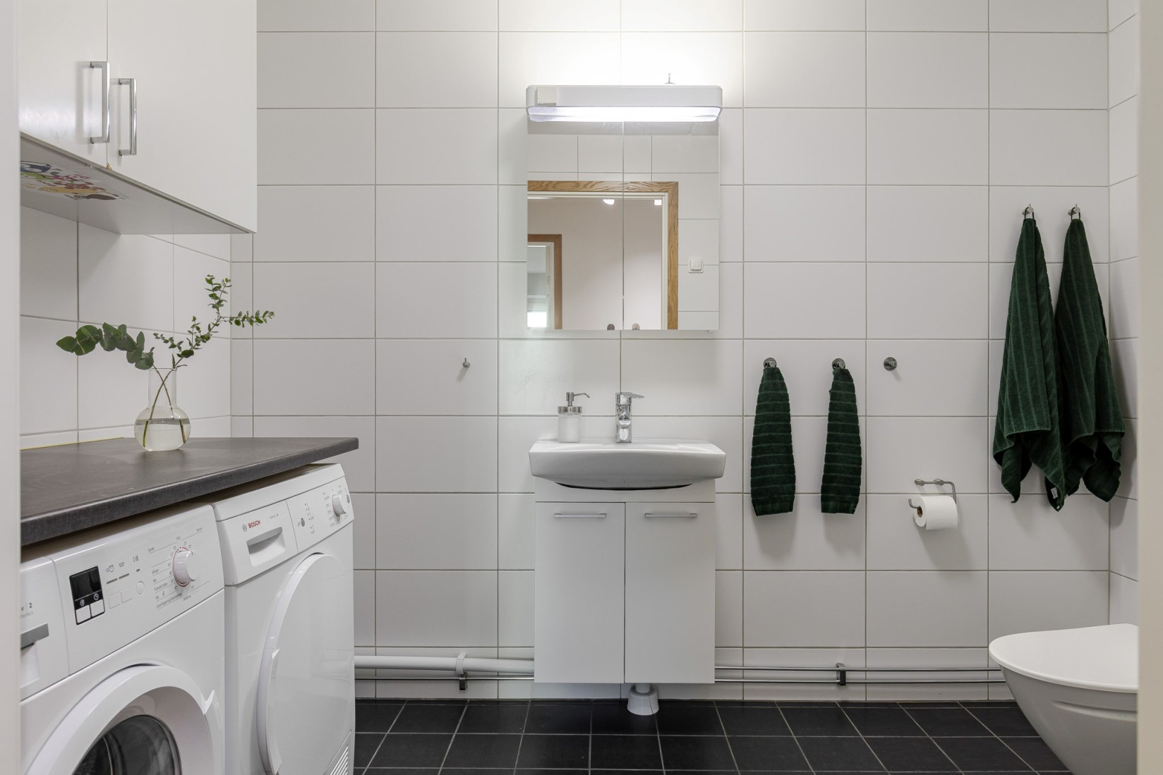Badrummet nås också från hallen och är helkaklat med vitt kakel på väggarna och grått klinker på golvet. Här finns dusch med vikbara väggar, toalett och handfat med kommod, samt tvättmaskin och torktumlare under arbetsbänk med överskåp – en praktisk lösning som förenklar vardagen.
