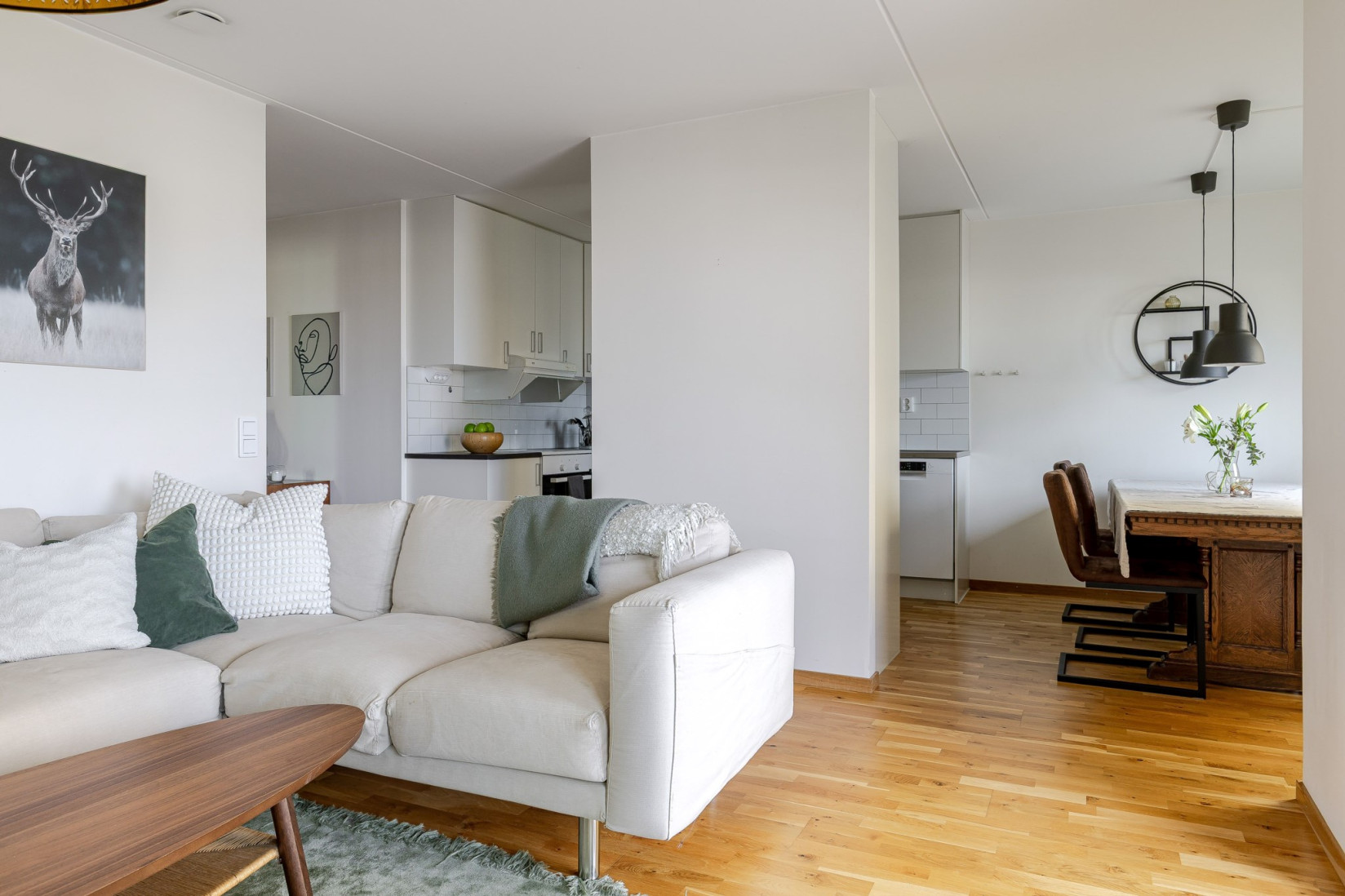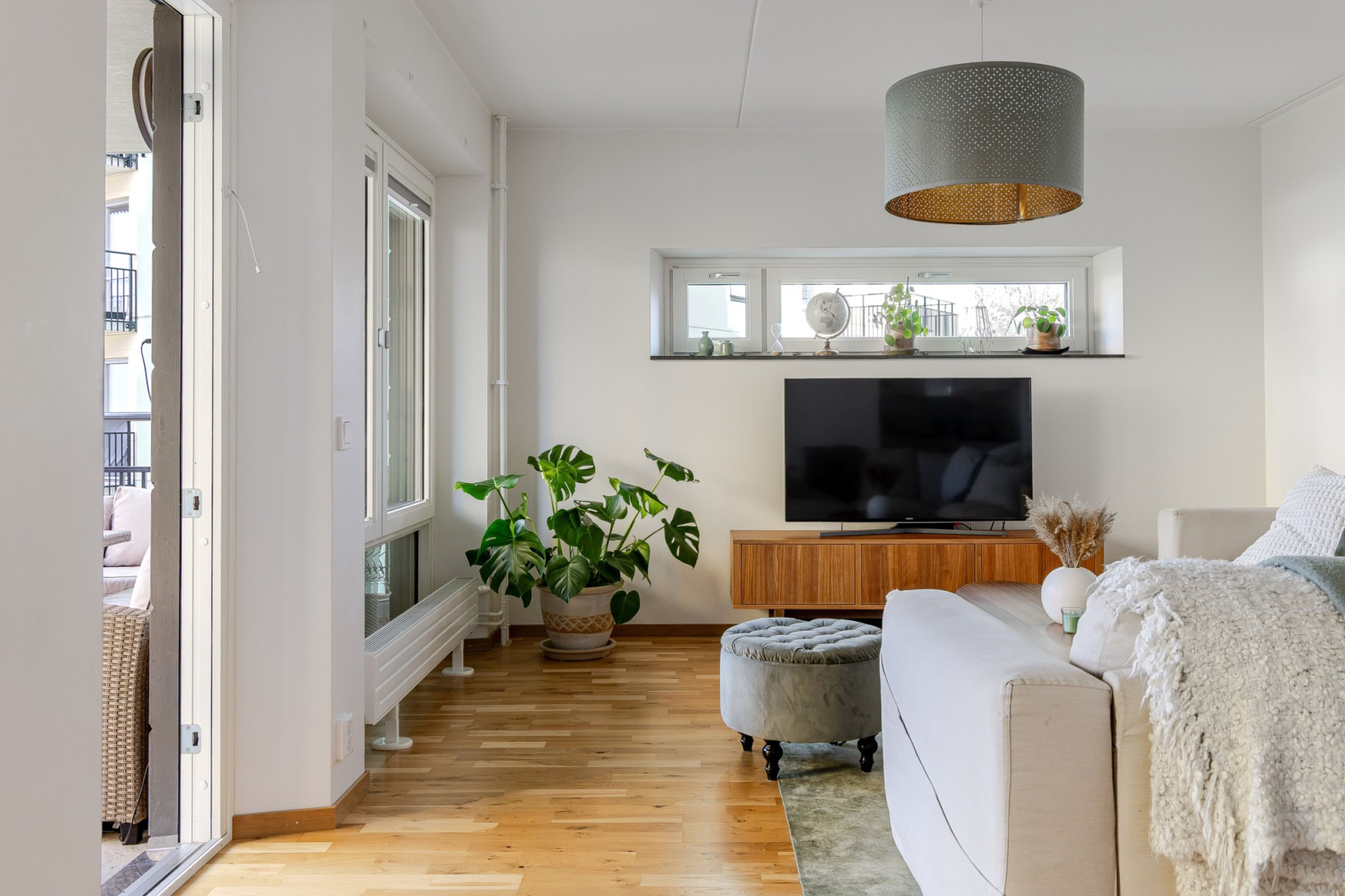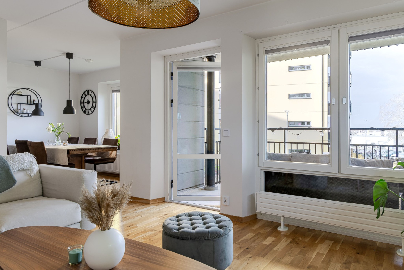 Hallen leder vidare till bostadens sociala del där kök och vardagsrum möts i en öppen, modern planlösning. Tack vare hörnläget med fönster i två väderstreck upplevs rummet både ljust och luftigt. Här finns gott om plats för soffa, tv och övrig möblering. Från vardagsrummet nås den generösa balkongen som bjuder på sol från eftermiddag till kväll.