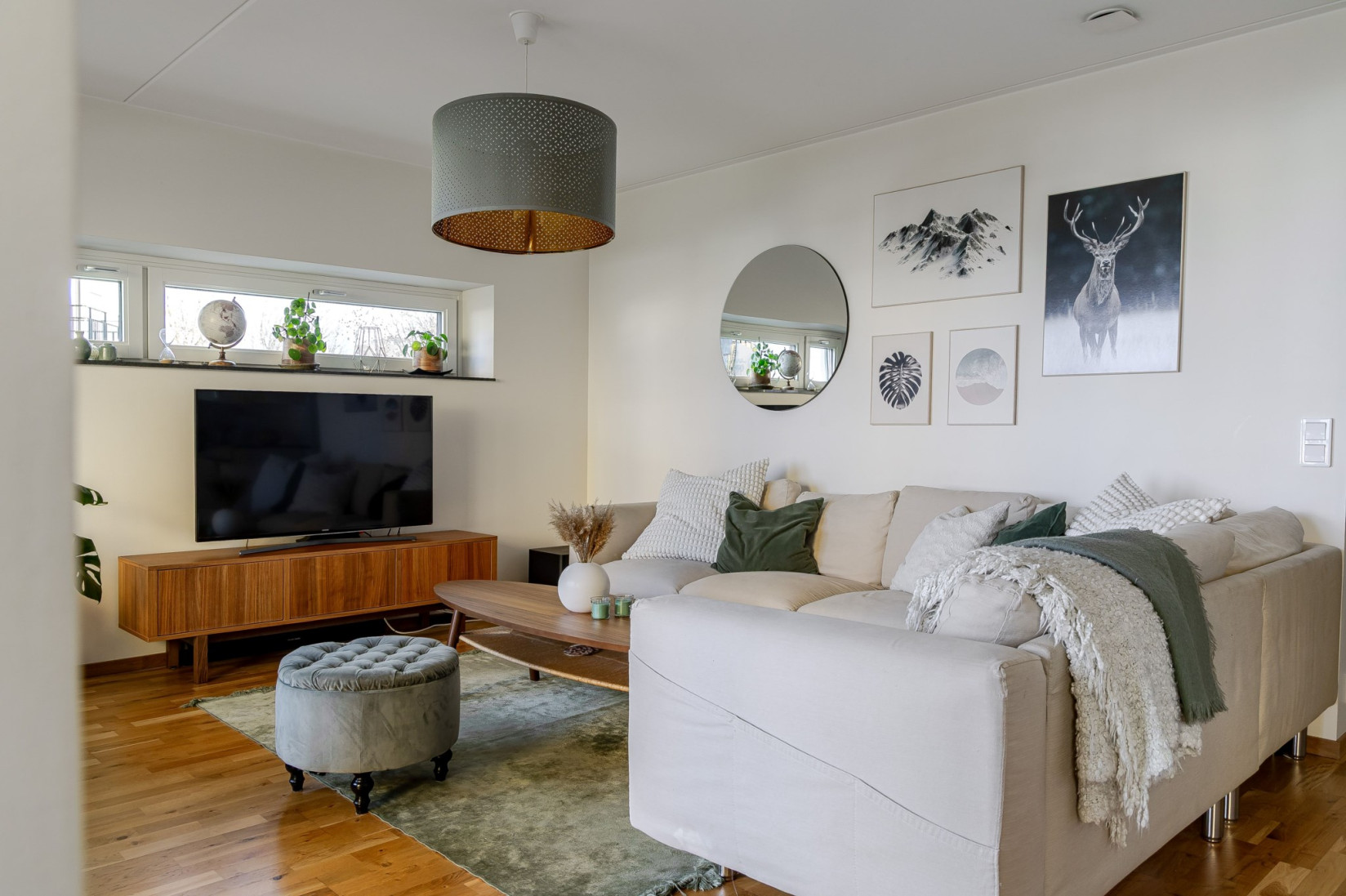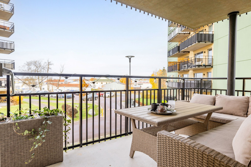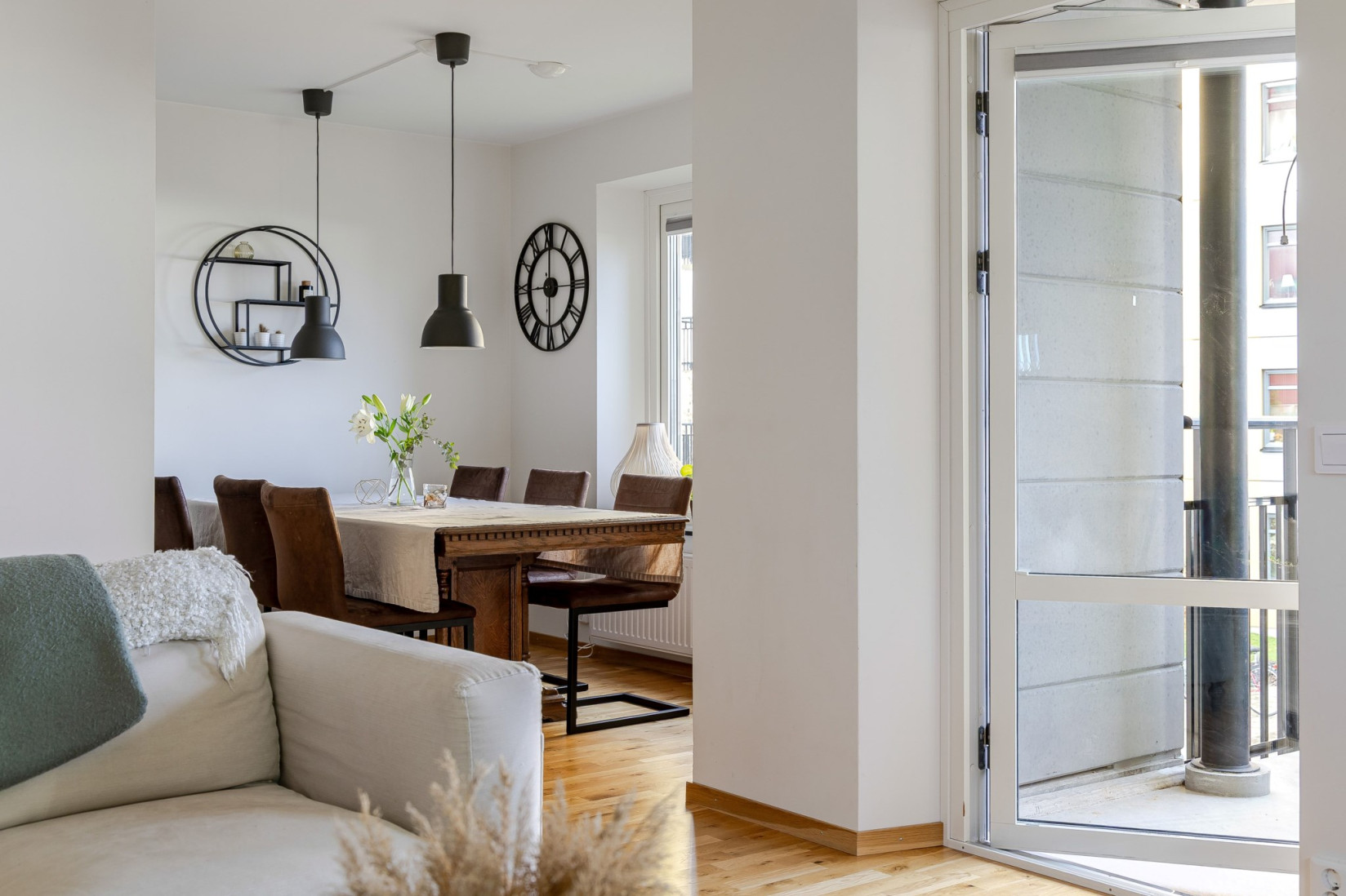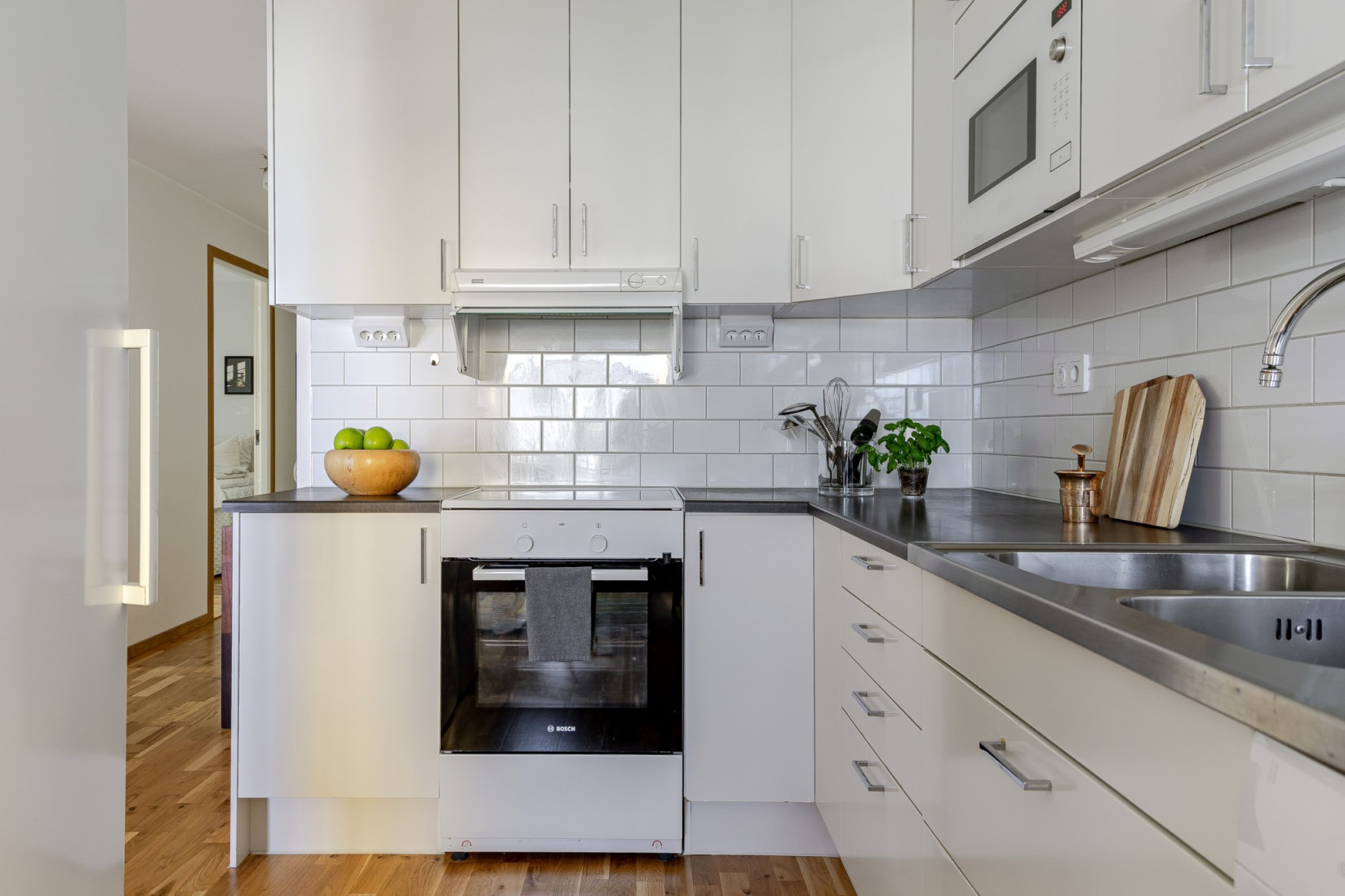 Hallen leder vidare till bostadens sociala del där kök och vardagsrum möts i en öppen, modern planlösning. Tack vare hörnläget med fönster i två väderstreck upplevs rummet både ljust och luftigt. Här finns gott om plats för soffa, tv och övrig möblering. Från vardagsrummet nås den generösa balkongen som bjuder på sol från eftermiddag till kväll.