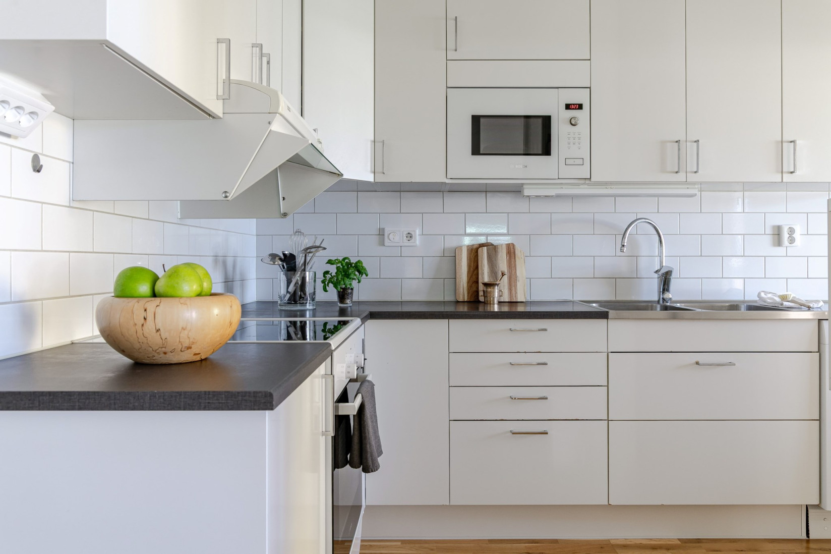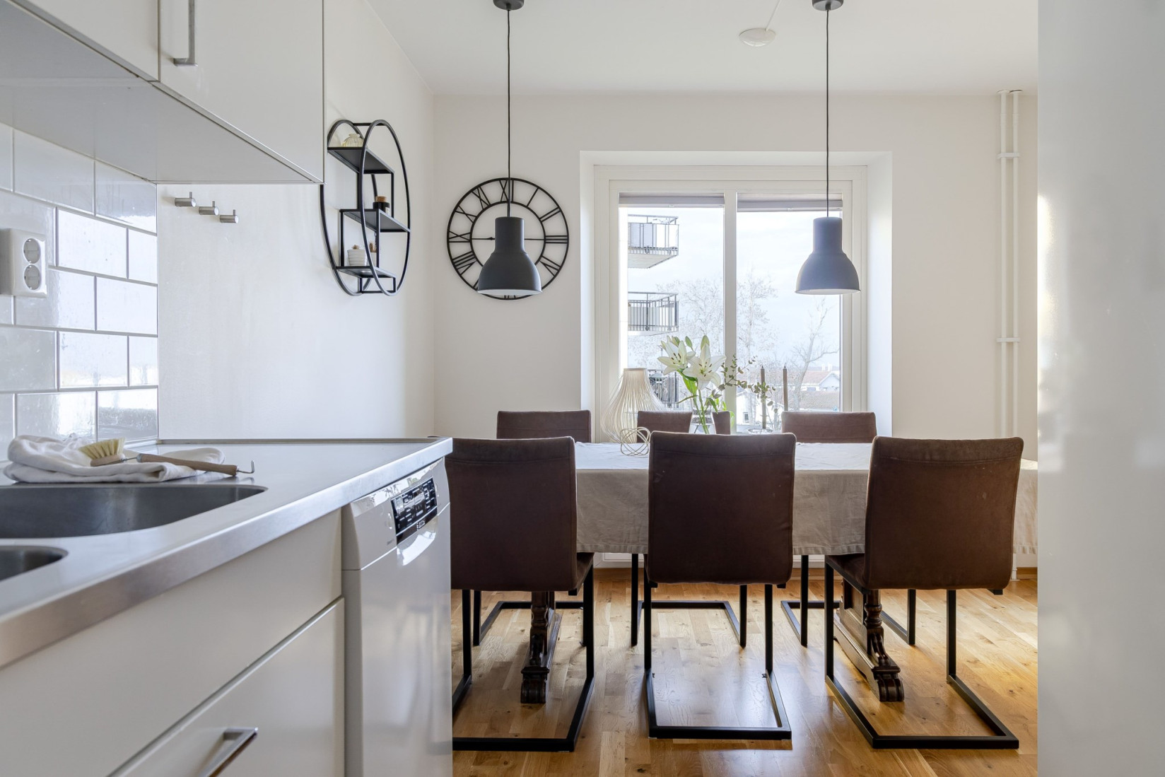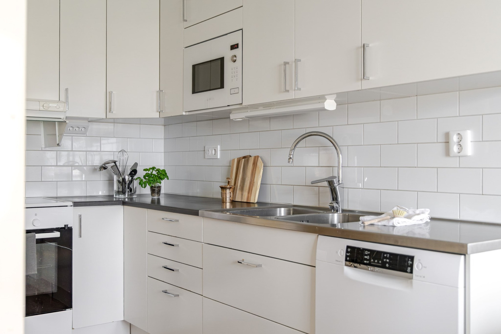 Köket från Marbodal har en ljus och stilren design med vita luckor och gott om förvaring. Här finns allt för matlagning: induktionshäll, ugn, fläkt, diskmaskin, hel kyl och frys samt inbyggd mikro. Intill köket ryms ett matbord för 6–8 personer.