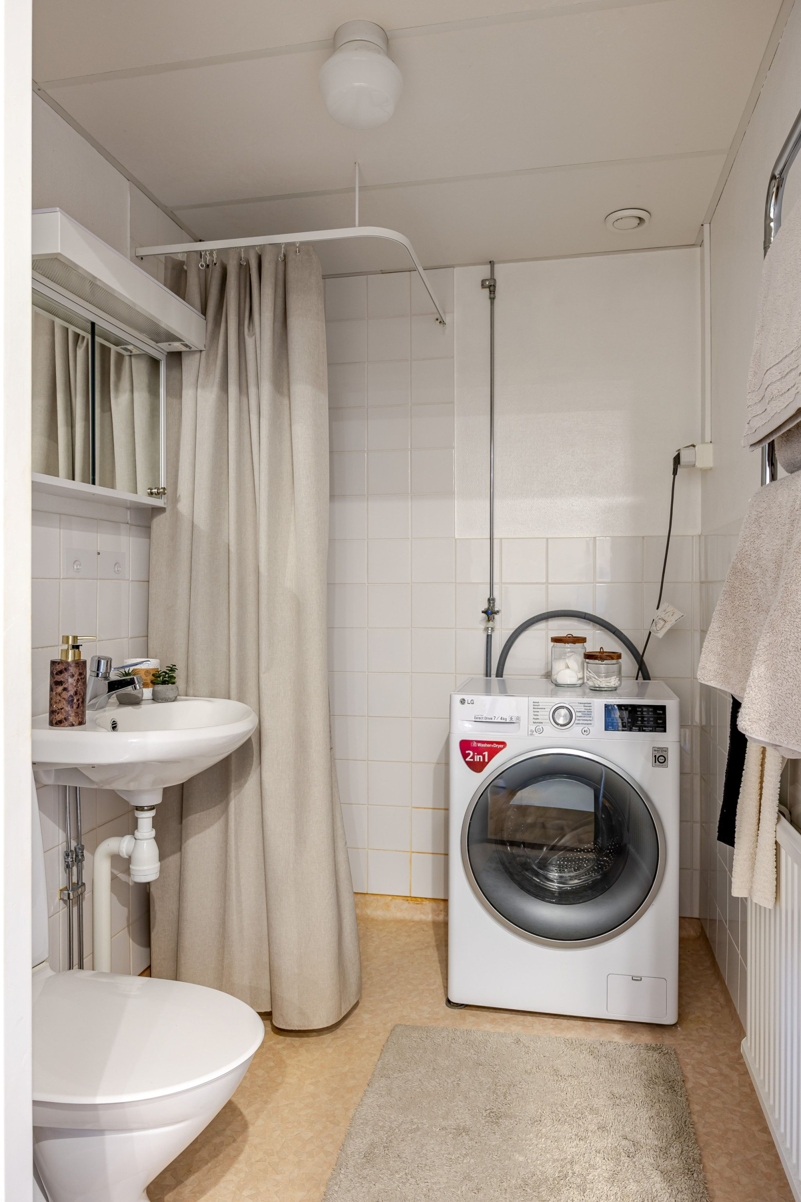 Badrummet är fräscht med halvkaklade väggar och erbjuder allt du behöver i vardagen. Här finns dusch, handfat med spegelskåp, toalett samt den ovärderliga tvättmaskinen som ger extra bekvämlighet