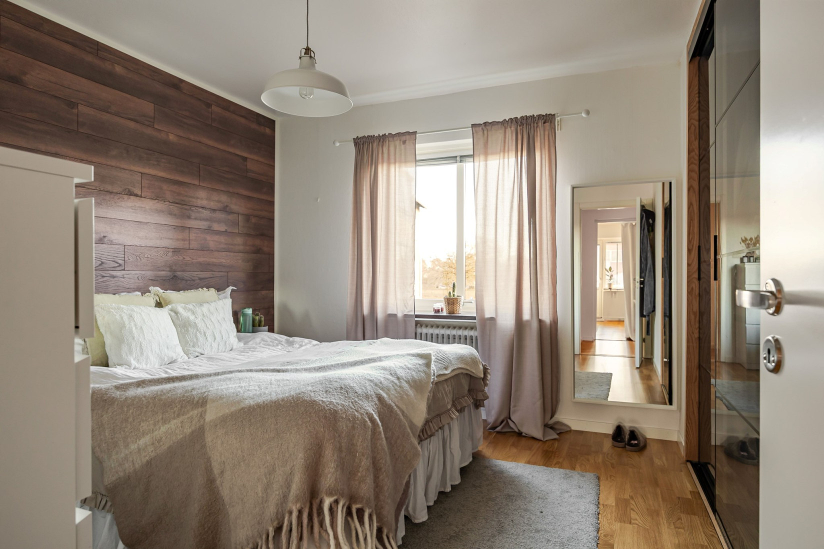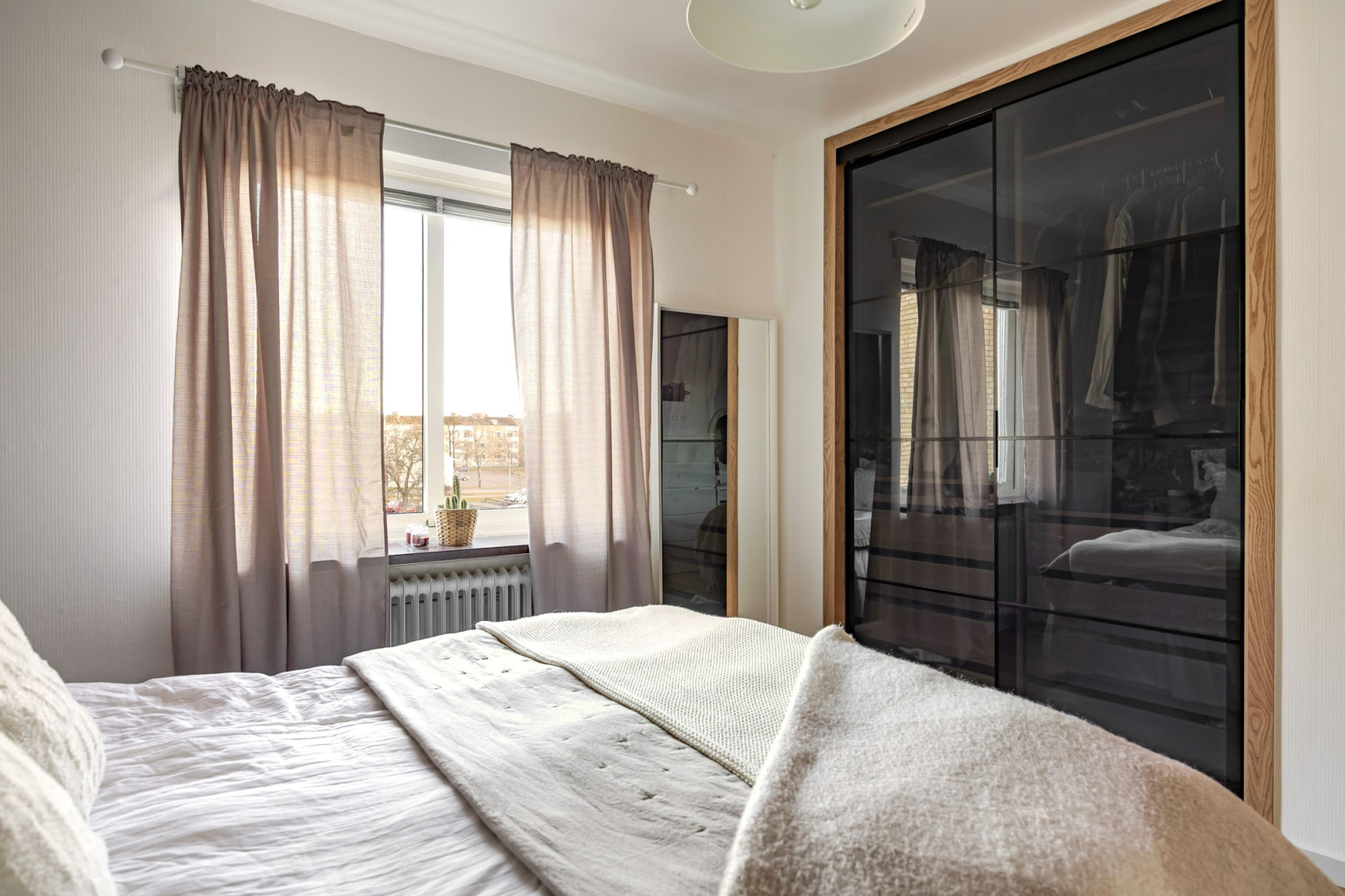 Sovrummet är rymligt och rymmer utan problem en dubbelsäng med sängbord samt en byrå eller liknande möbel. Längs ena väggen finns praktiska skjutdörrsgarderober med gott om förvaring. Fönstret vetter mot den lugna framsidan.
