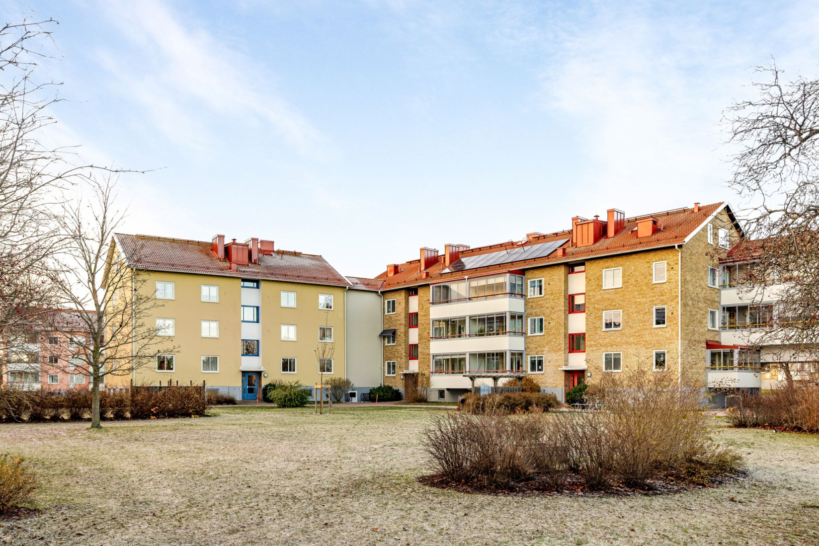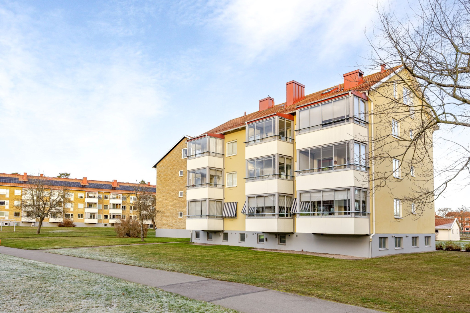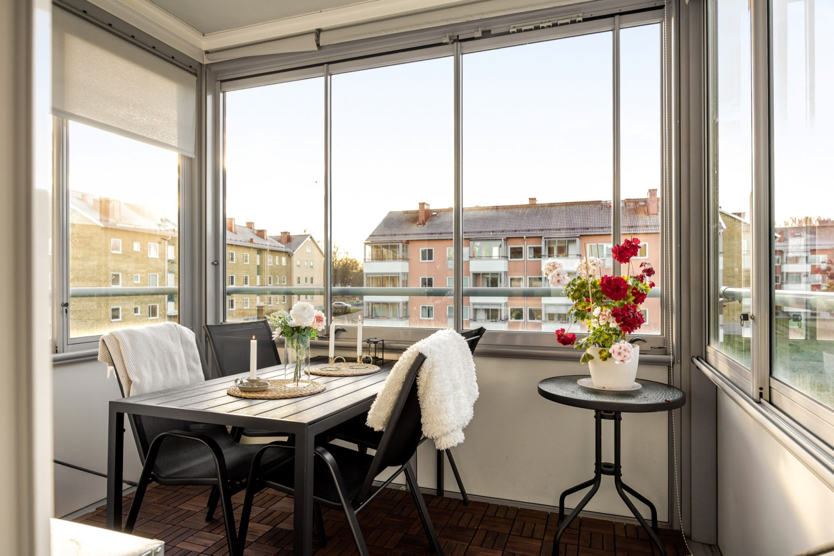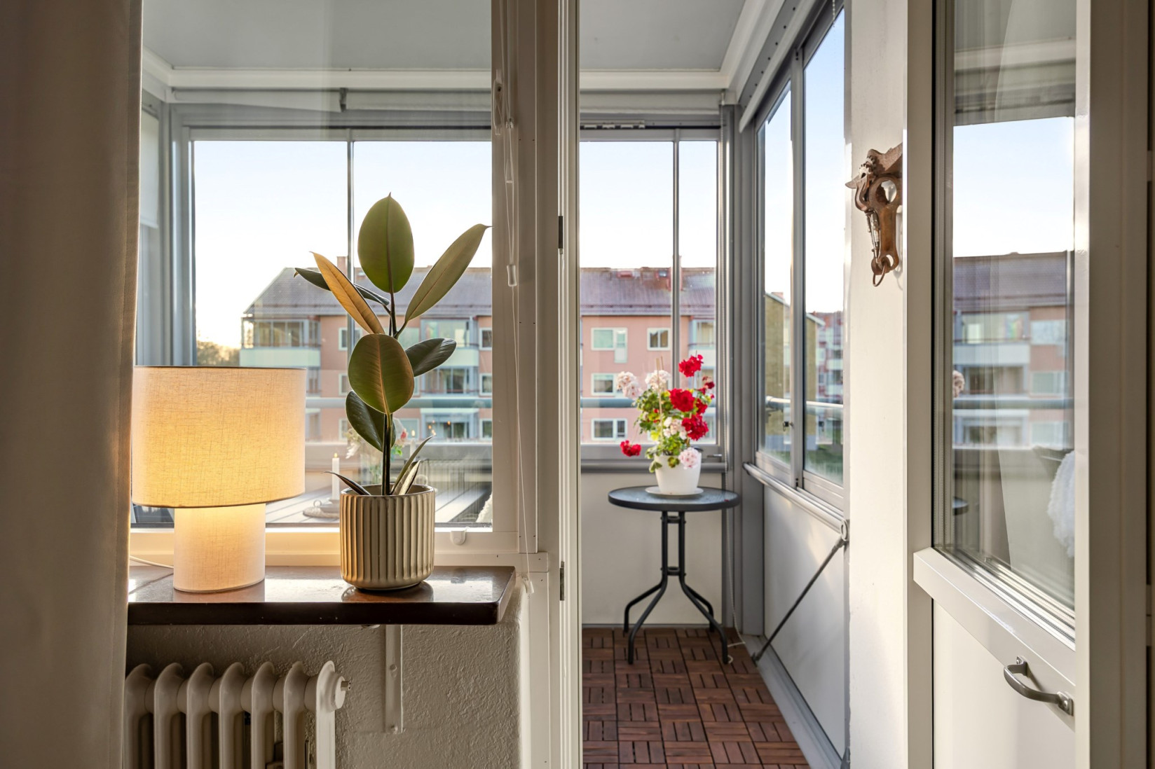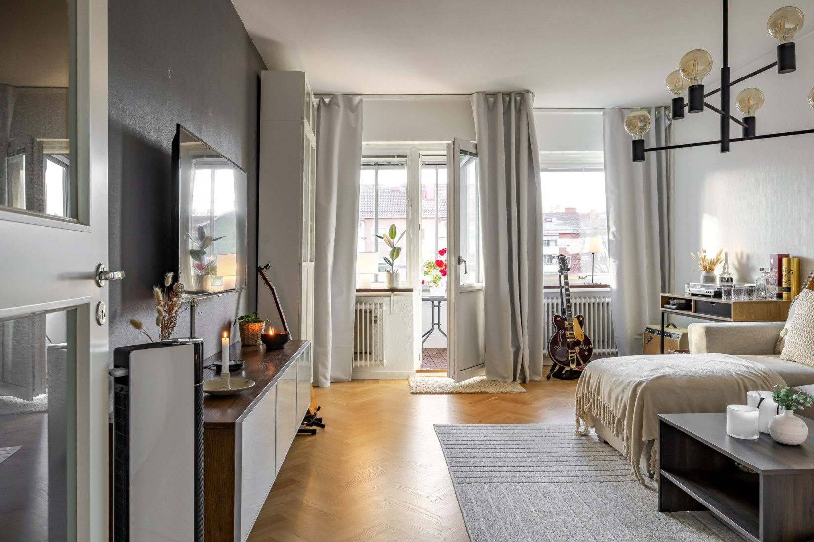 Vardagsrummet är väl tilltaget och enkelt att möblera efter behov. De stora fönstren mot den lugna innergården ger ett härligt ljusinsläpp och rummet pryds av ett vackert fiskbensgolv. Härifrån nås den inglasade balkongen som rymmer både matbord eller ett loungeset och som verkligen förlänger utesäsongen.