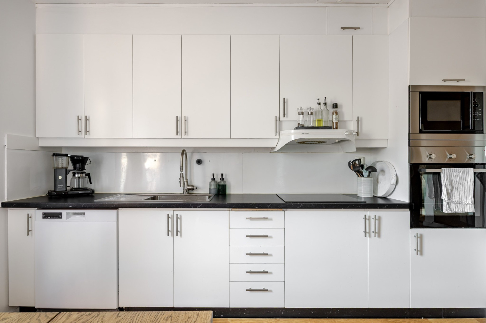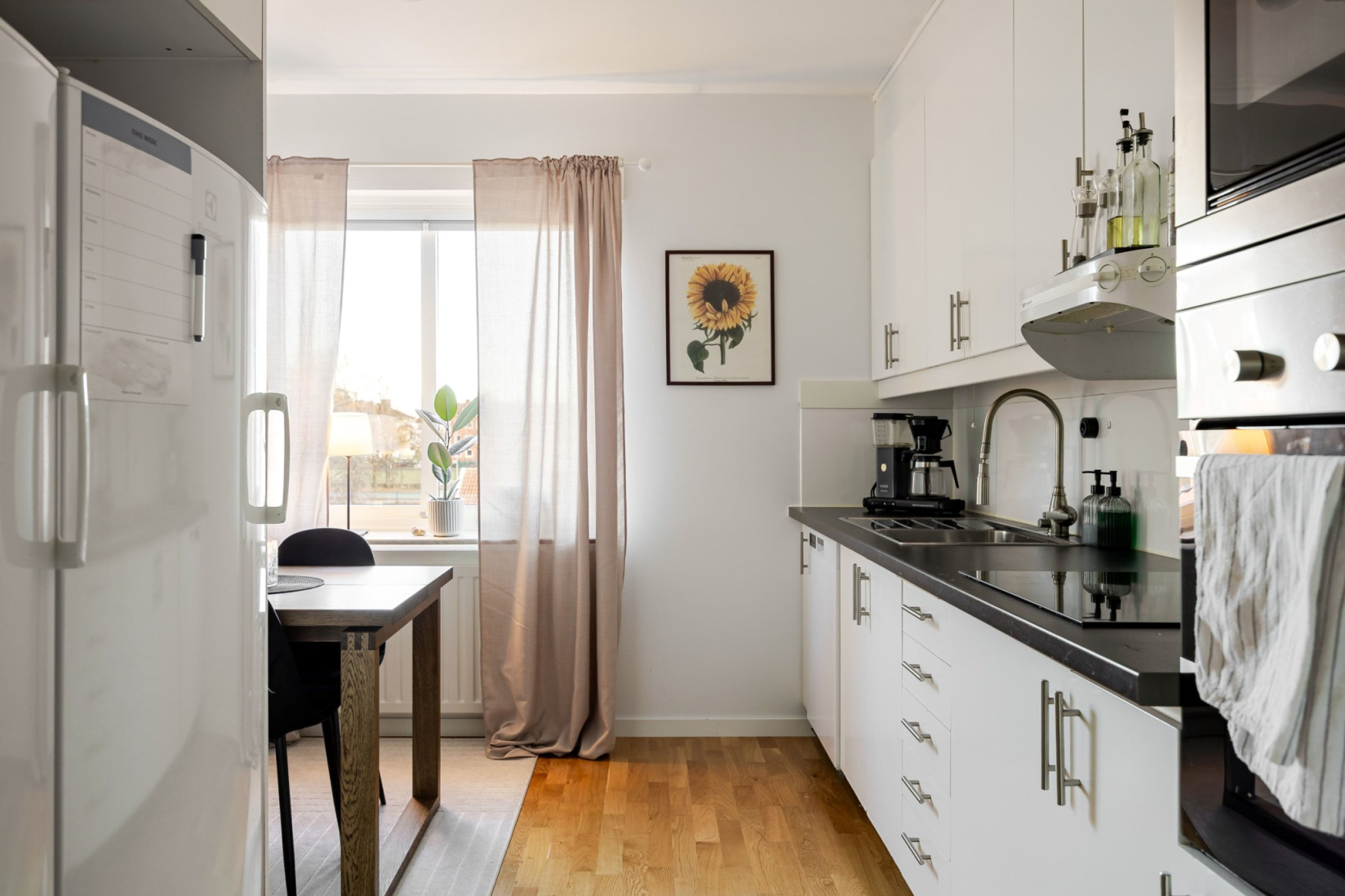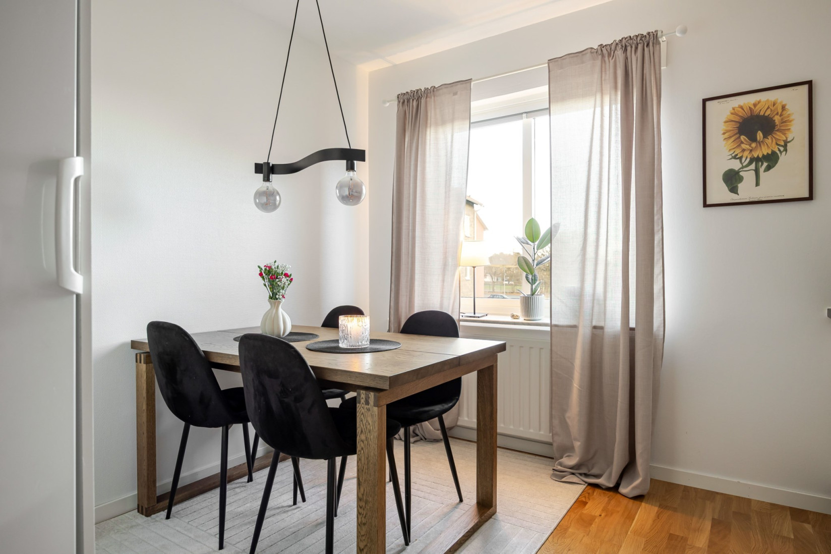 Från hallen når du först det trivsamma köket med generösa arbetsytor. Här finns plats för ett matbord för 4–6 personer framför det stora fönstret som ger fint ljusinsläpp. Köket är utrustat med hel kyl, frys, diskmaskin, fläkt samt inbyggd mikro och ugn.