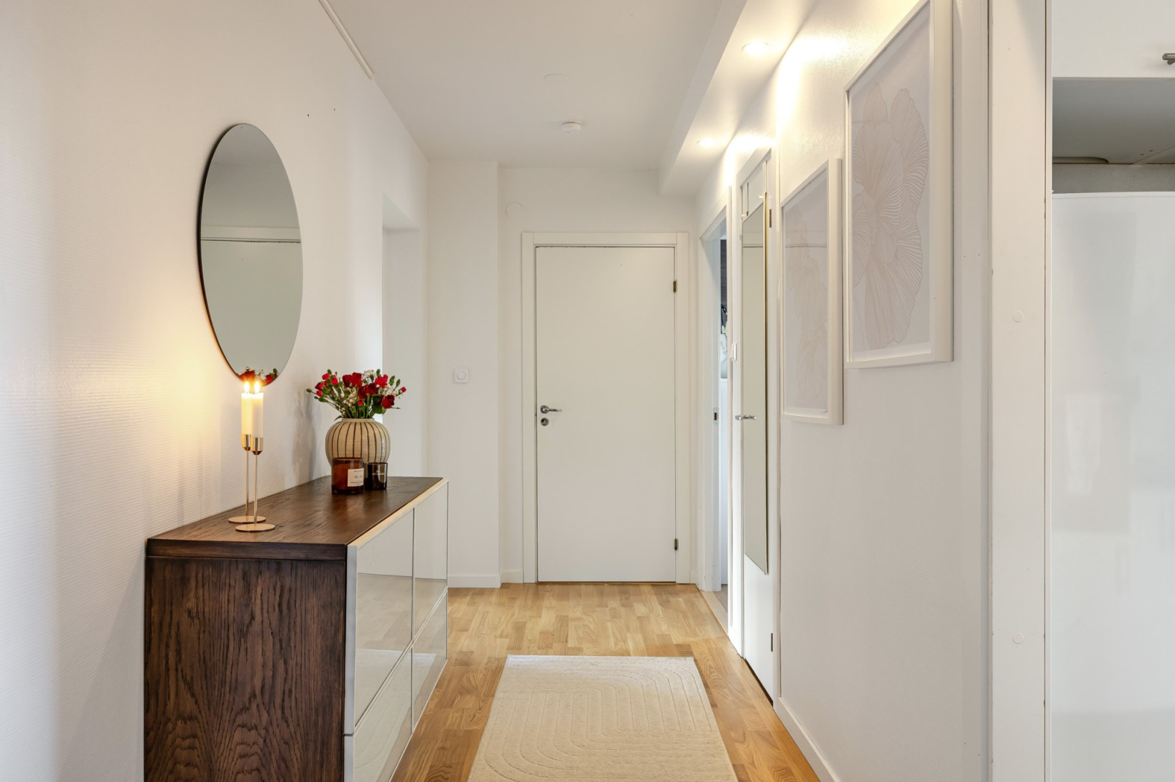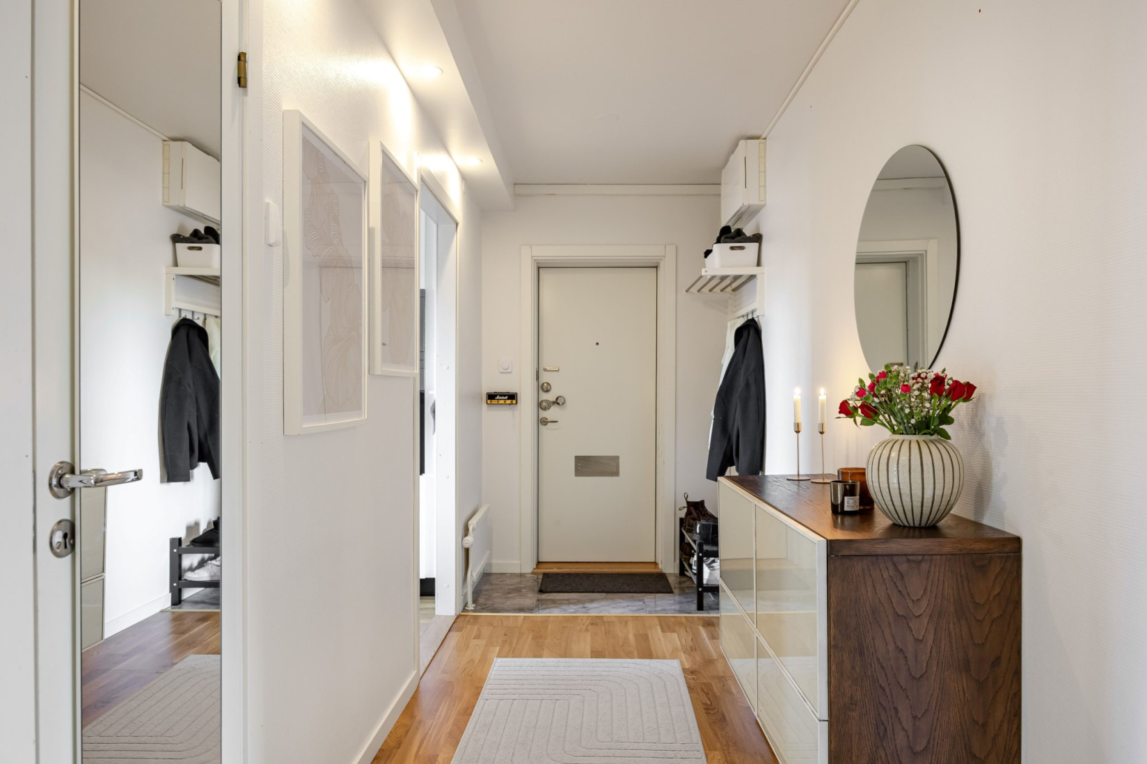 Hiss eller trappa tar dig upp till våning 2 där du välkomnas av en rymlig hall med gott om plats för ytterkläder. Här finns även möjlighet att möblera med exempelvis byrå eller skrivbord. Längre in i hallen ligger en praktisk klädkammare som ger extra förvaring