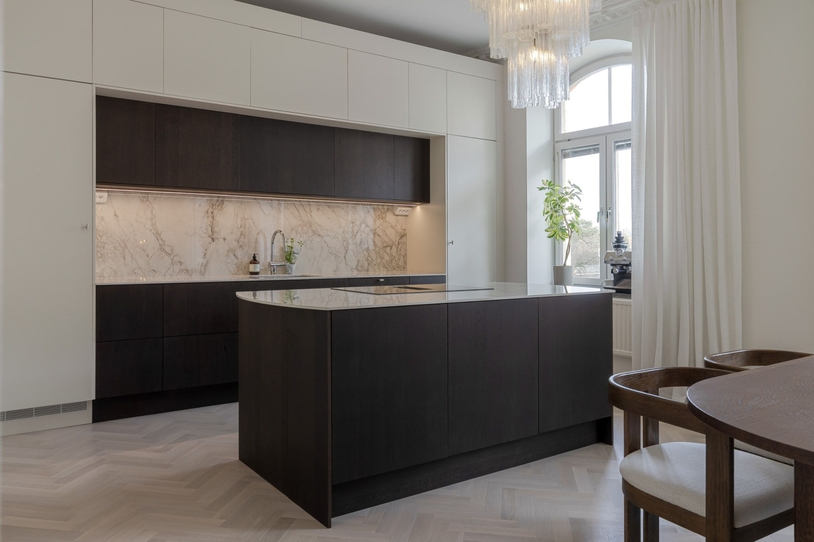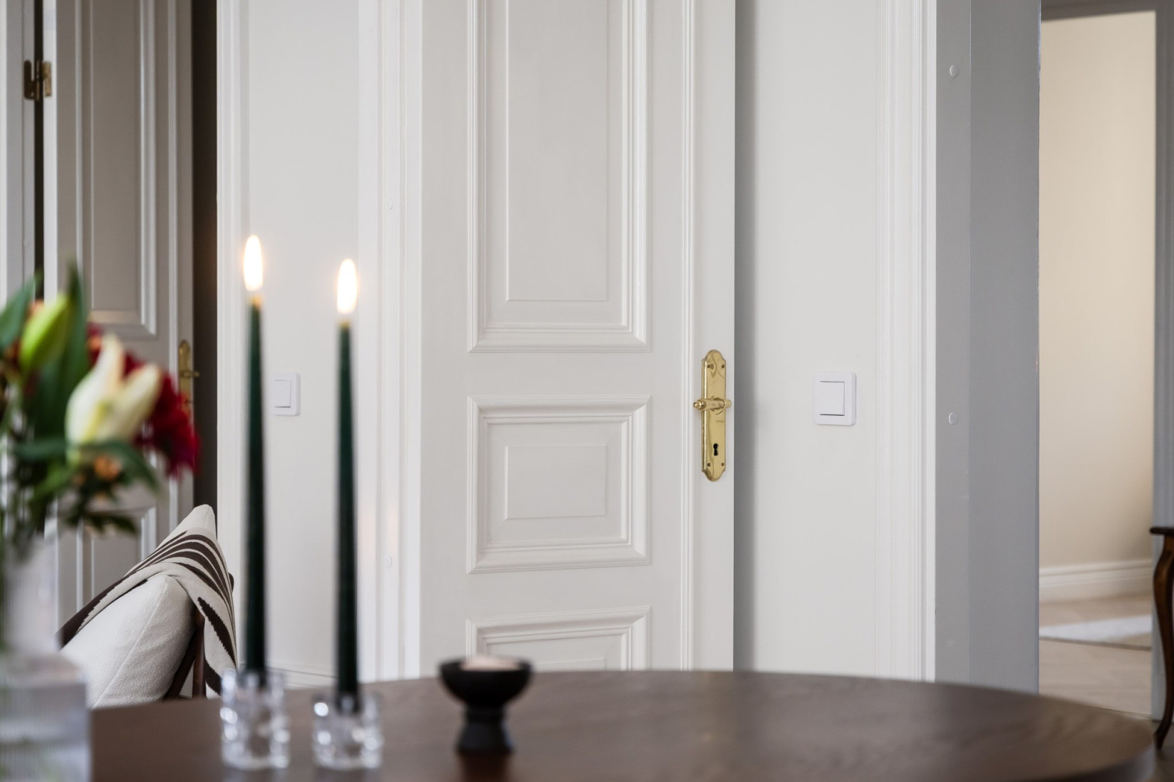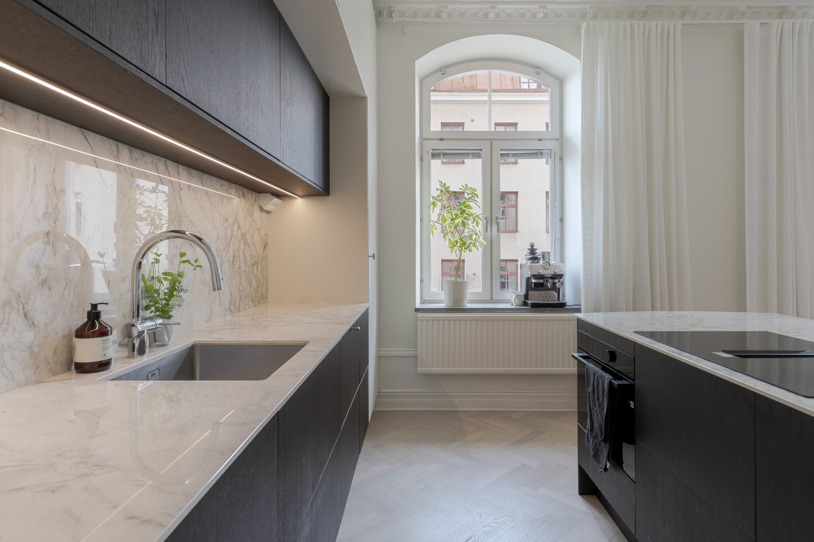 Ett riktigt statementkök. Här har säljarna verkligen tänkt till och renoverat med fingertoppskänsla, smak och finess. Det imponerande köket tar för sig men smälter samtidigt sömlöst in i bostadens sekelskiftescharm. Köksön är något alldeles extra, ett naturligt nav i rummet.