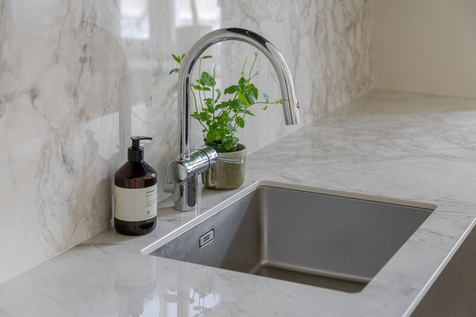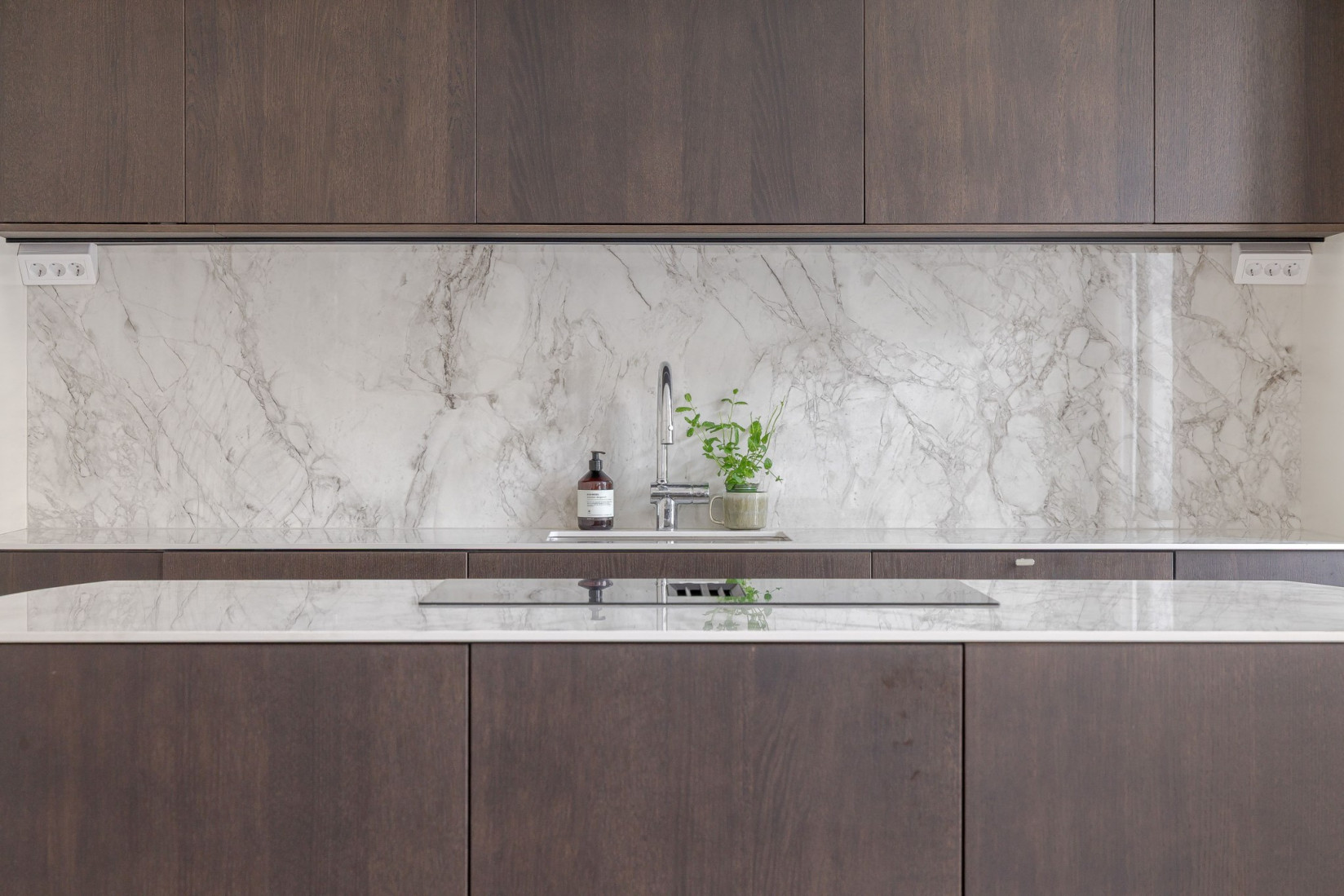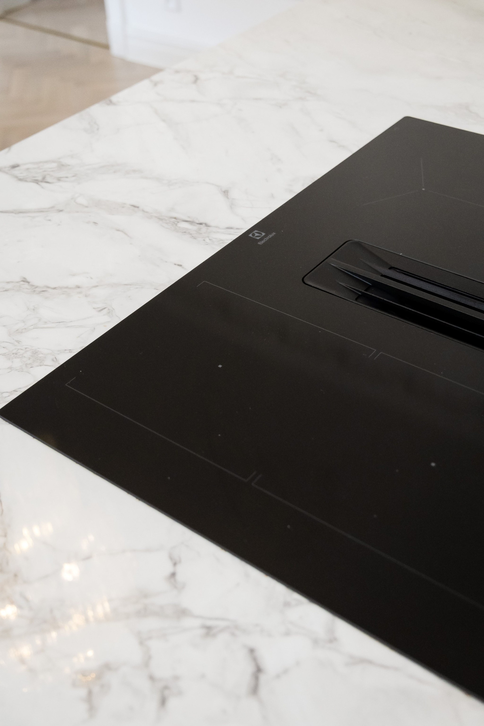 Bänkskivan och stänkskyddet i vacker dektonskiva sätter tonen och ger köket en exklusiv karaktär. Förvaringen är generös och arbetsytorna väl tilltagna, vilket gör matlagningen både smidig och inspirerande. Här finns kyl, frys, inbyggnadsugn med mikro, diskmaskin och fläkt, allt snyggt integrerat.