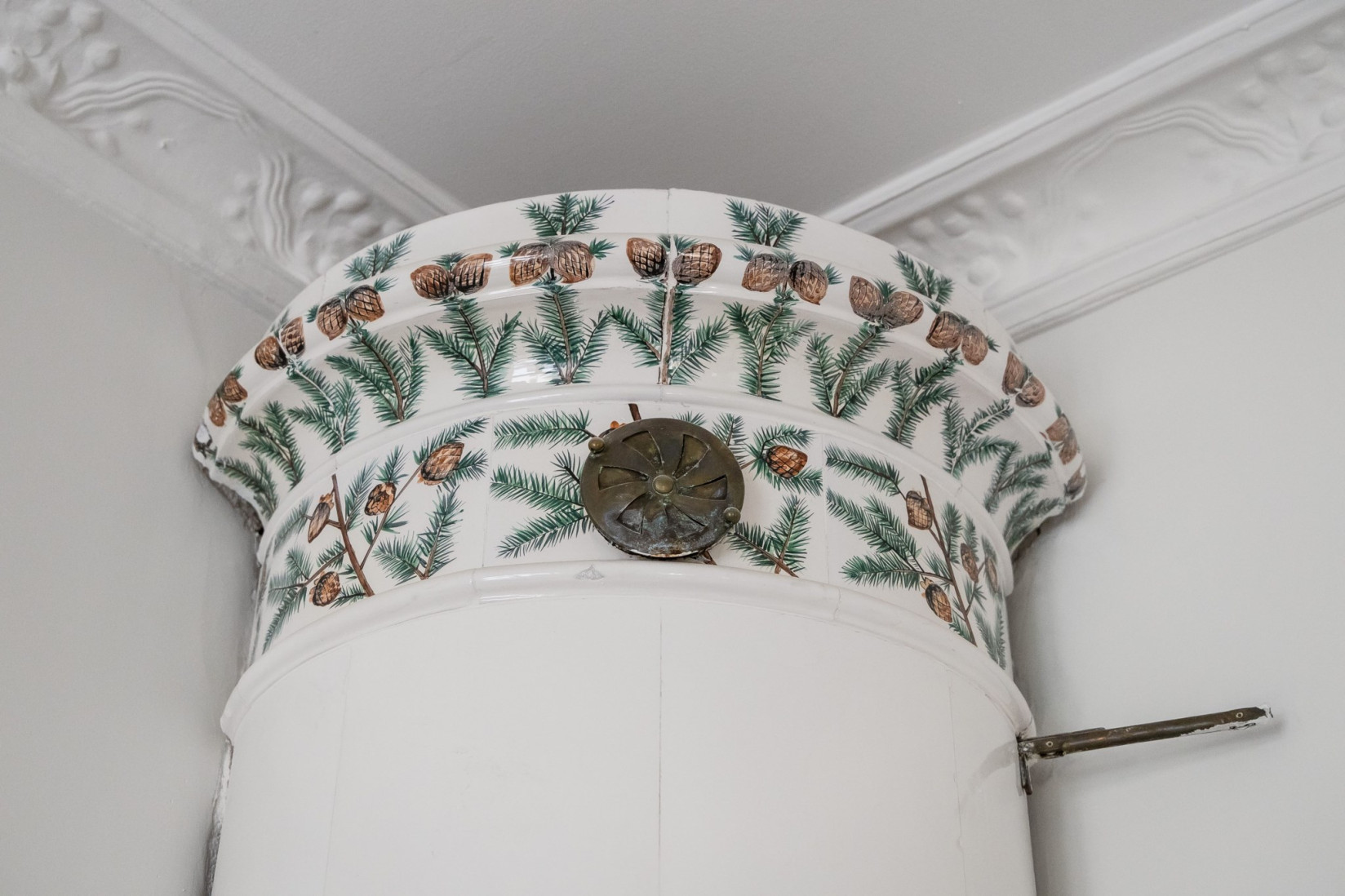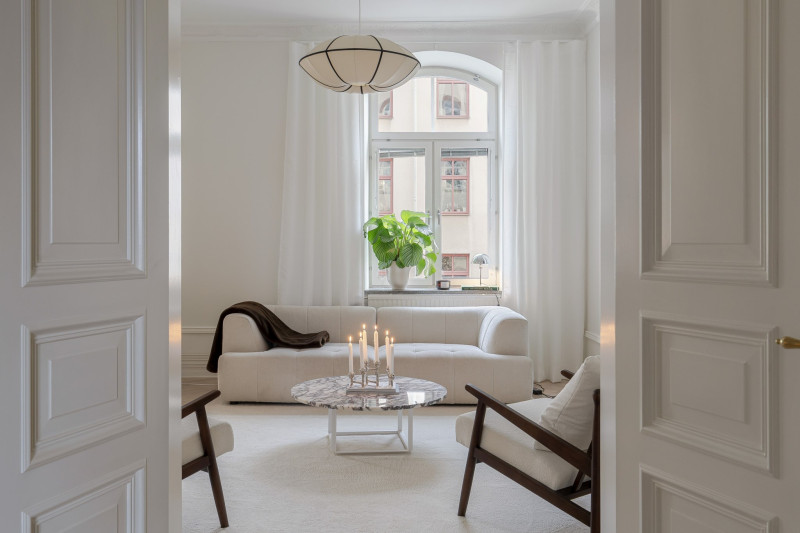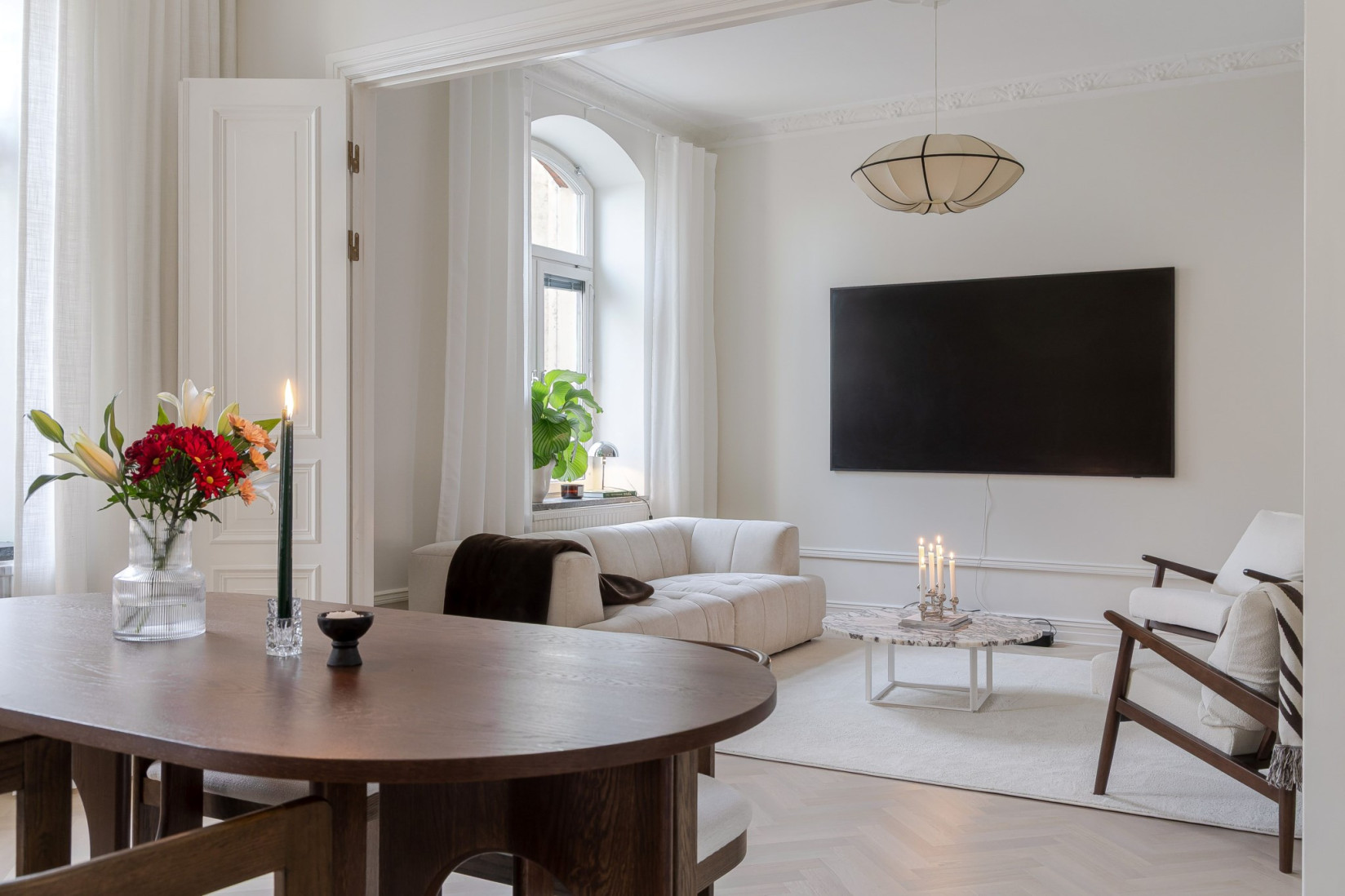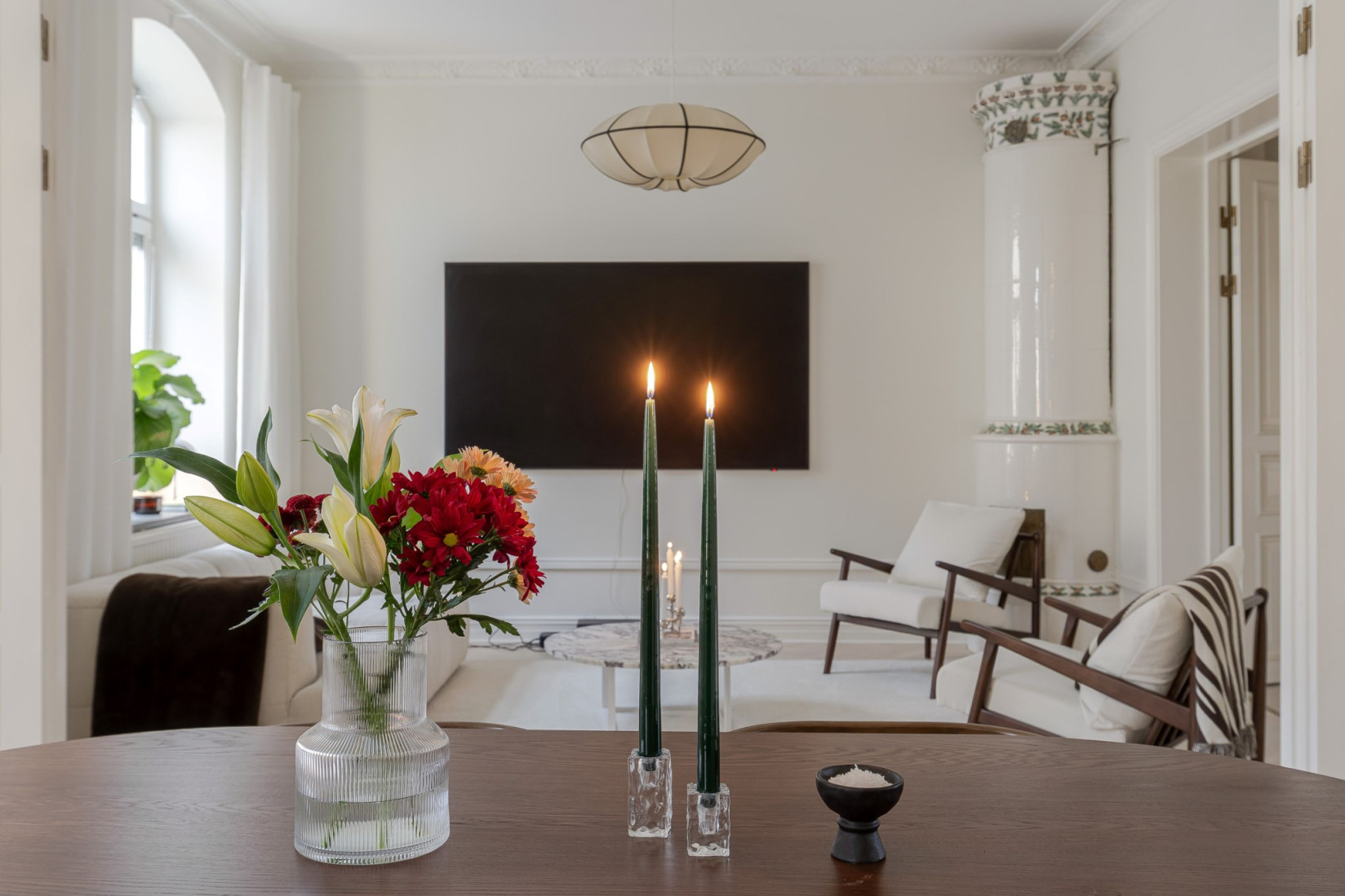 I anslutning till köket ligger ett vackert vardagsrum som nås genom eleganta pardörrar. Här möts du av en ståtlig kakelugn och stora bågfönster som tillsammans skapar en atmosfär av tidlös charm och exklusivitet, en plats man gärna dröjer sig kvar i.