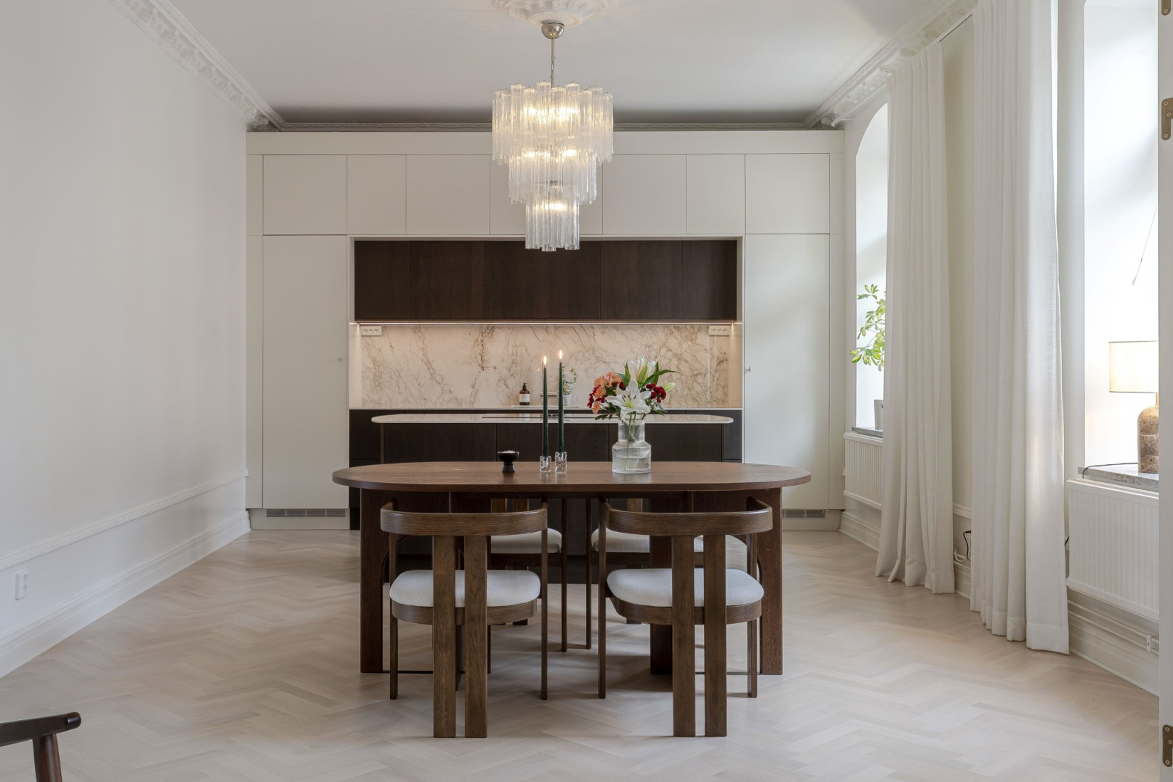 De stora fönstren, den eleganta stuckaturen, den generösa takhöjden och det klassiska fiskbensparkettgolvet samspelar och ger köket en helt magisk inramning. Från köket har man dessutom öppnat upp mot det som idag är ett inbjudande vardagsrum.