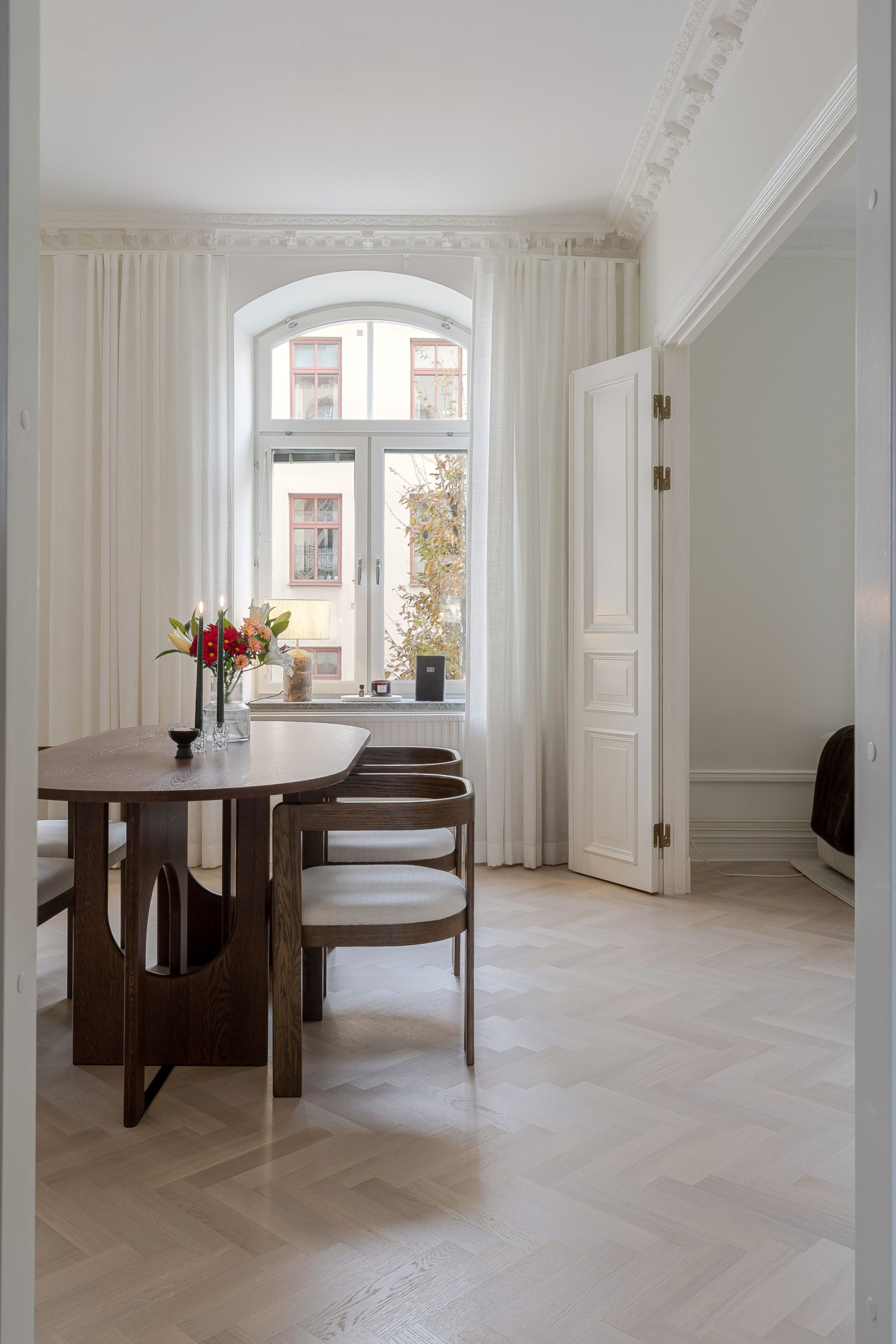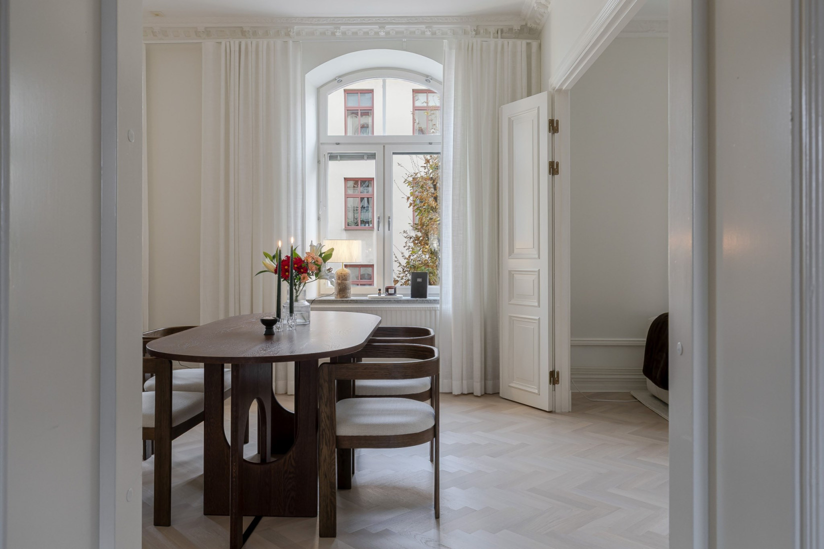 De två generösa rummen i fil bjuder på en imponerande rymd och stor flexibilitet. Oavsett om du föreställer dig en pampig matsal, ett sofistikerat vardagsrum eller en harmonisk kombination av de båda, erbjuder denna yta alla möjligheter att skapa ett hem som anpassas efter familjens behov och livsstil.