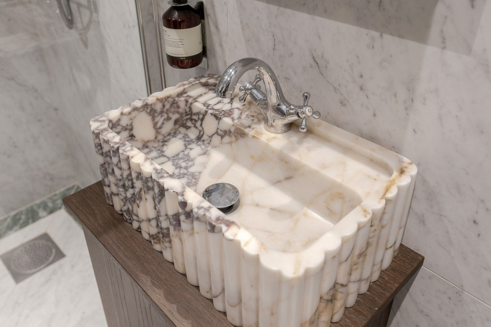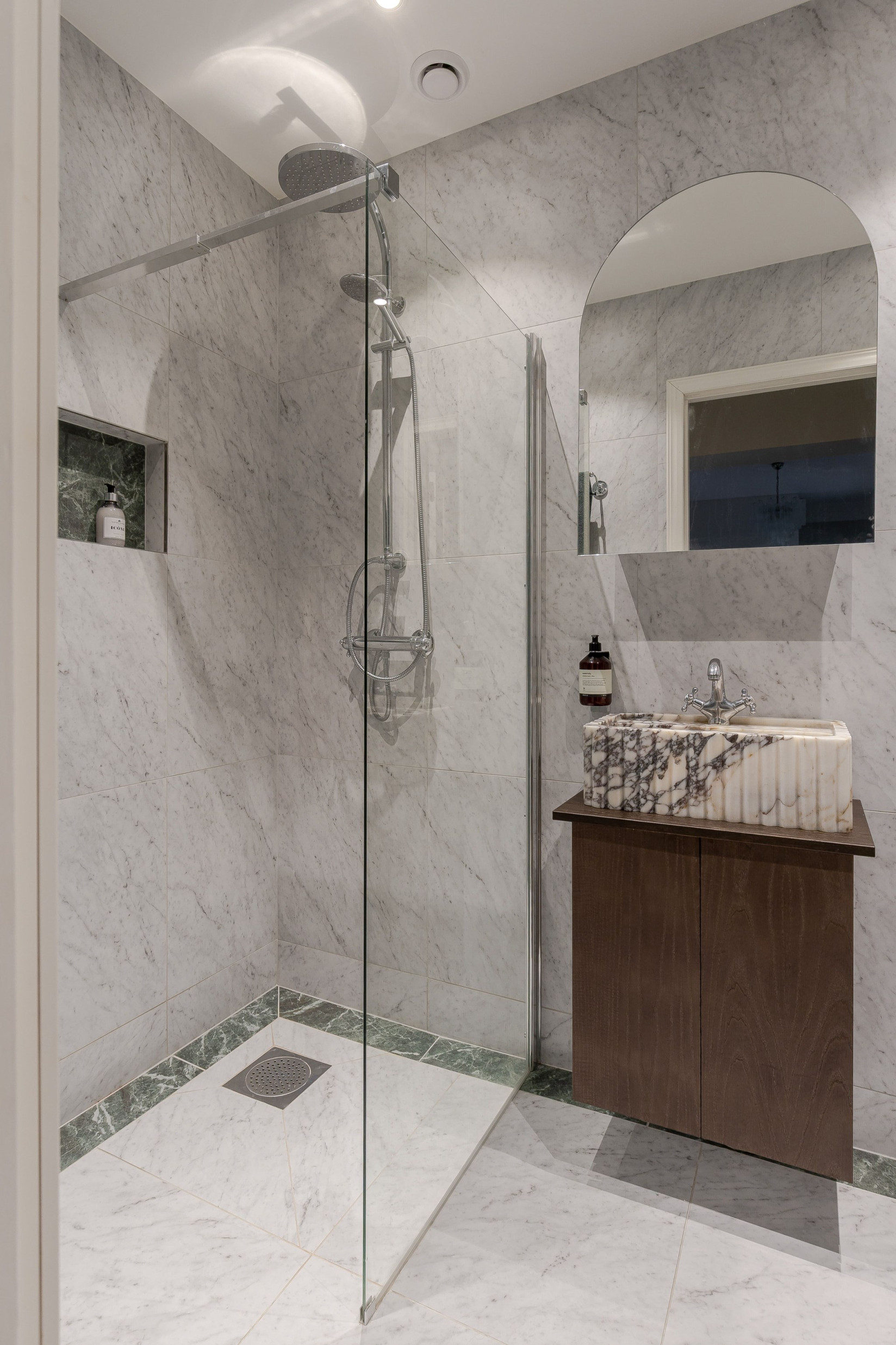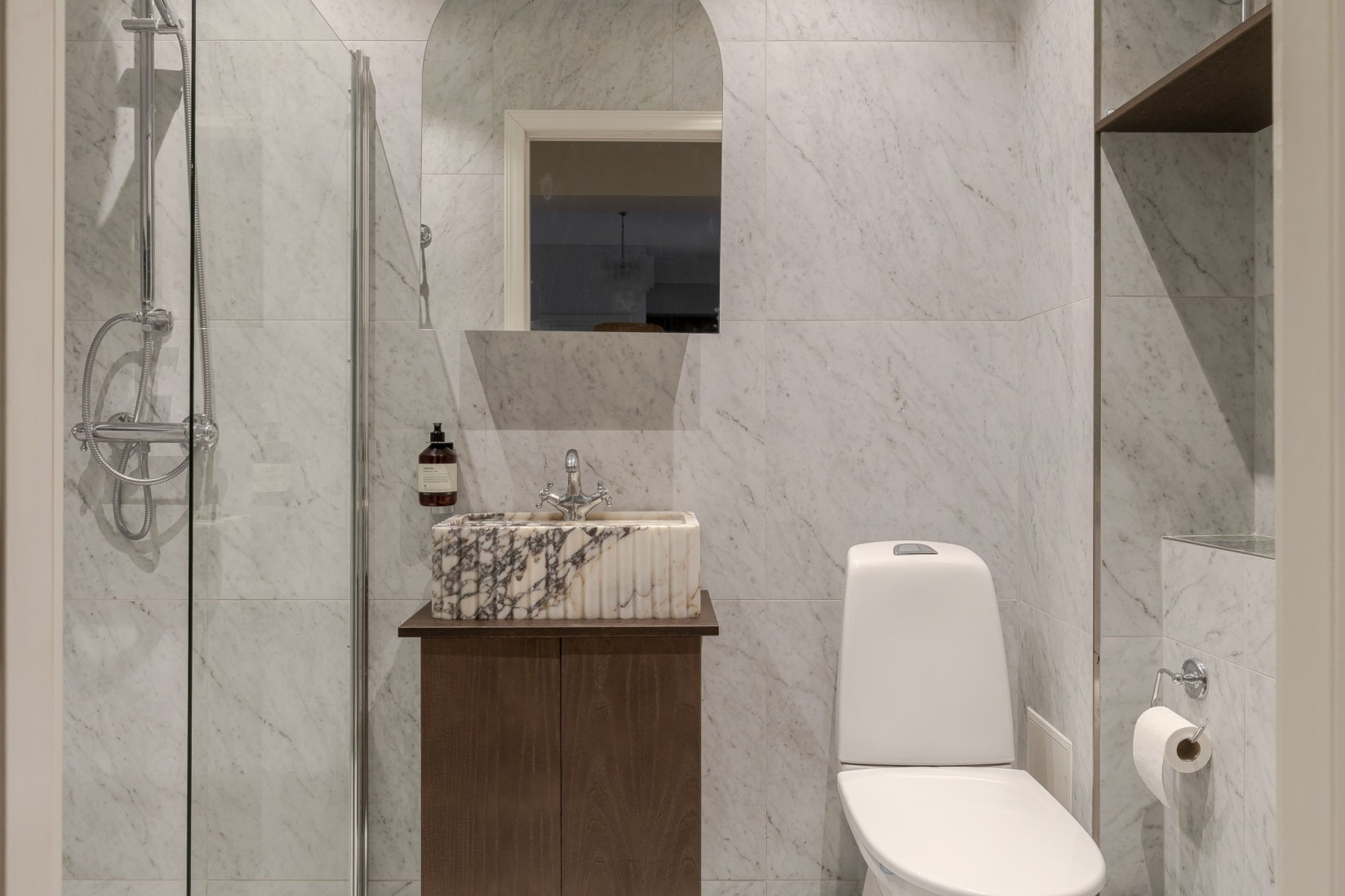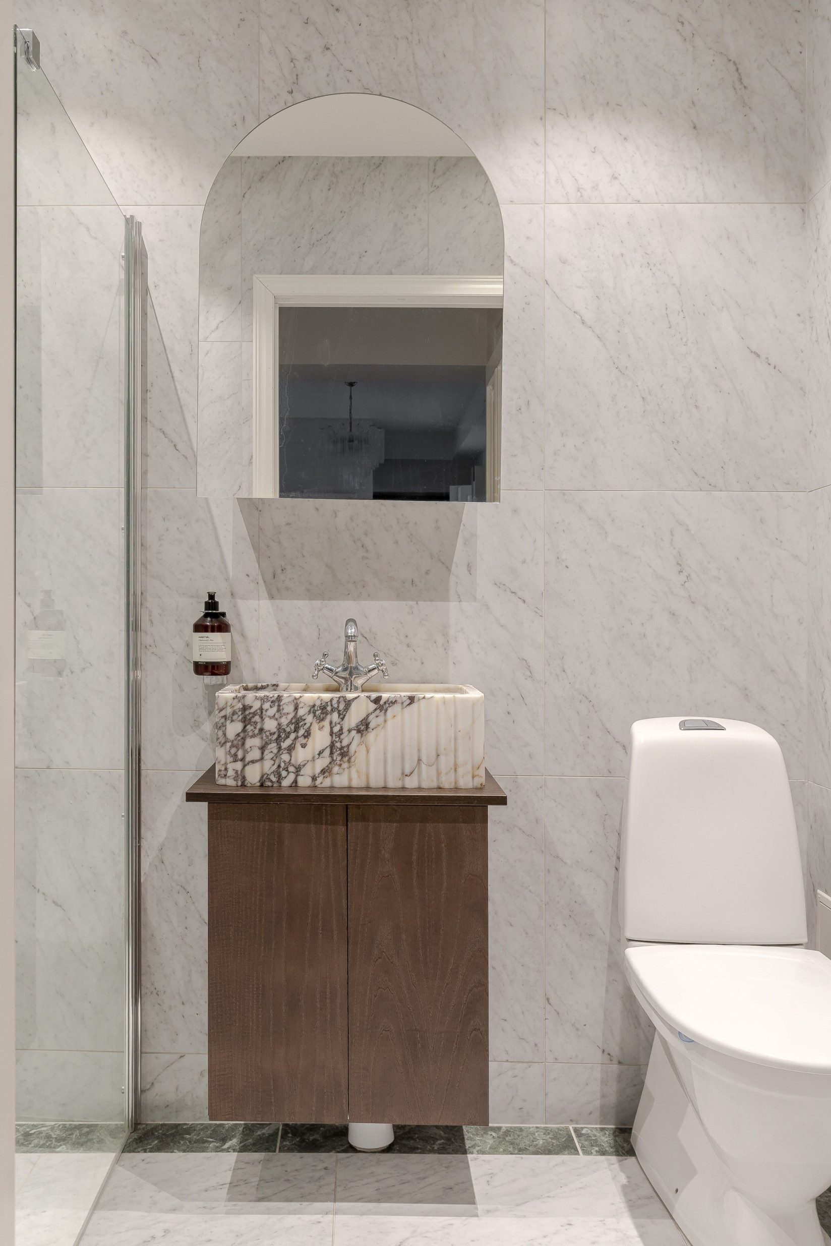 Det renoverade badrummet är något utöver det vanliga. Här möts du av vackert klinker och elegant kakel som tillsammans skapar en modern och harmonisk helhet. Rummet är utrustat med dusch, ett stilrent handfat från Italien, spegel, toalett och spotlights som ger en behaglig belysning.
