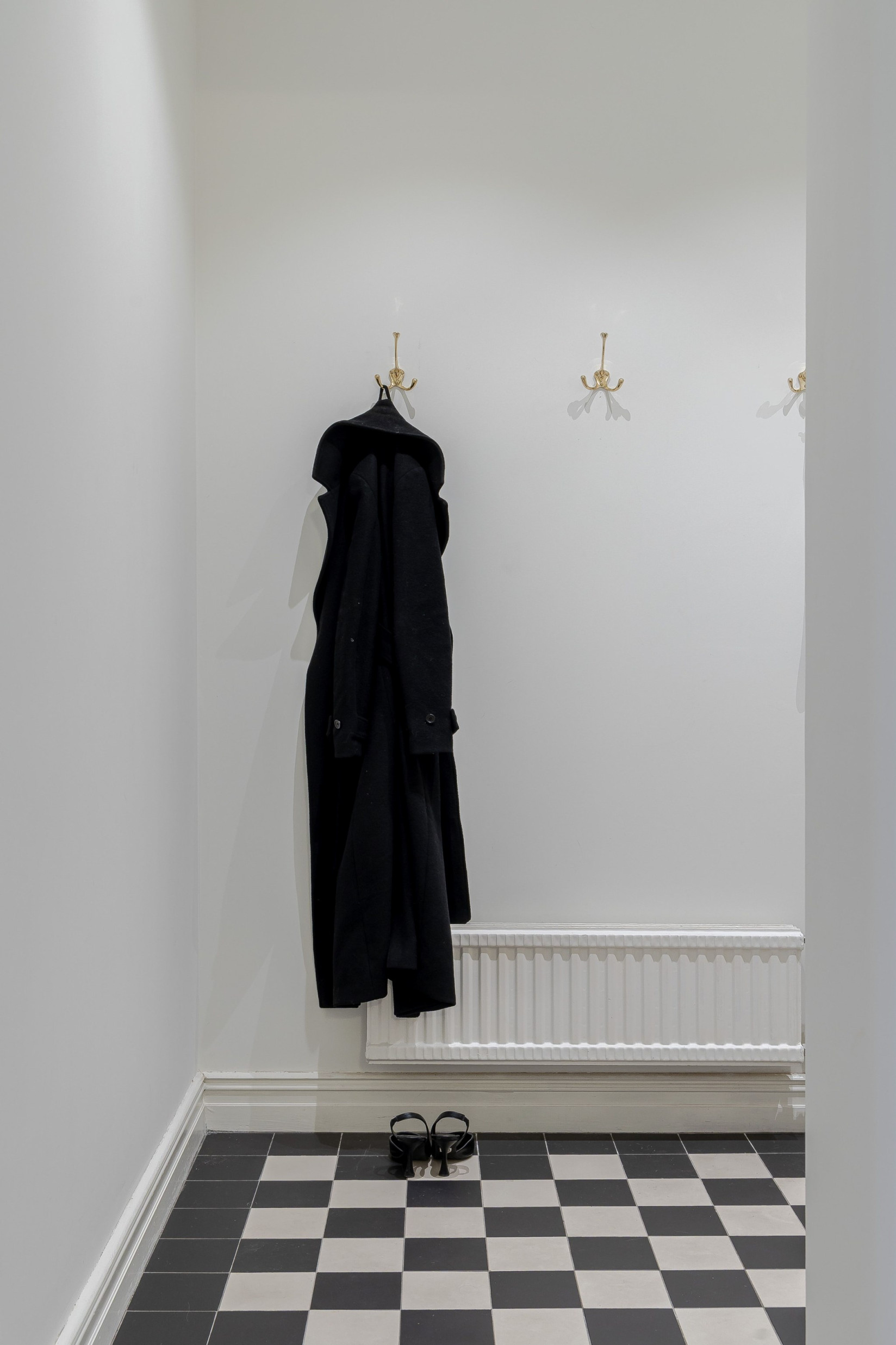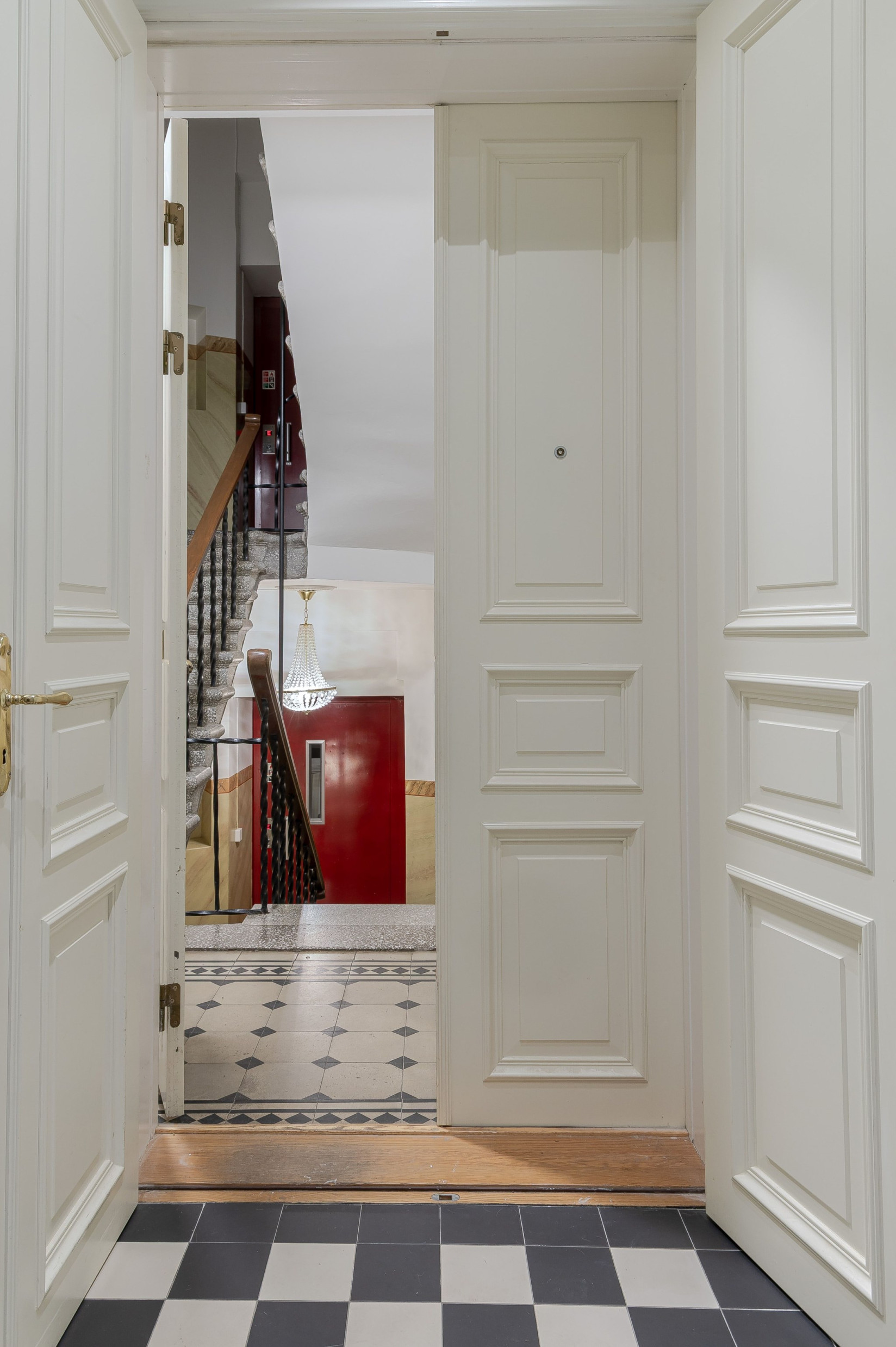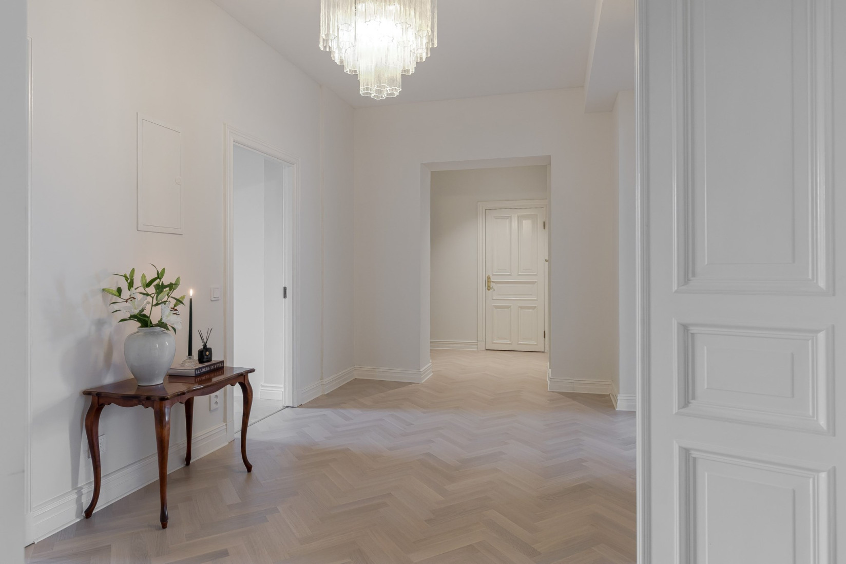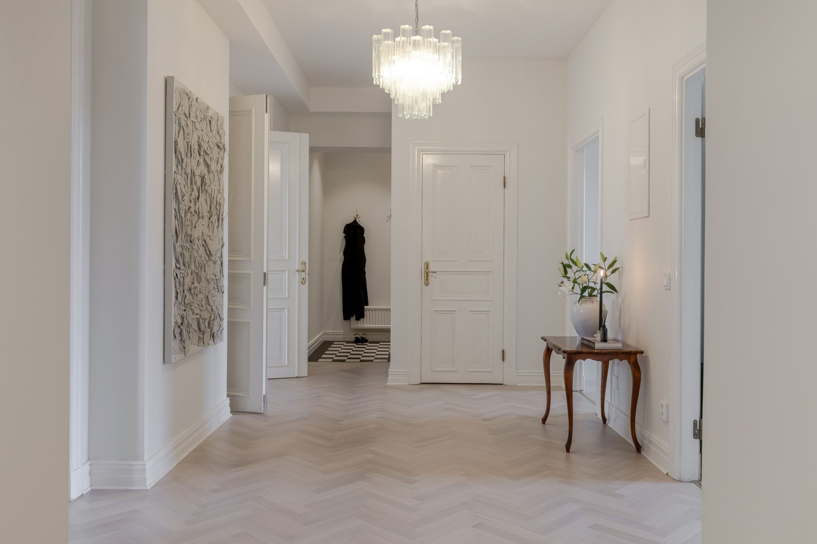 Genom de vackra, spegelprydda dubbeldörrarna välkomnas du in i denna charmiga sekelskiftesvåning som nyligen genomgått en fullständig och smakfull renovering. Entrén ger ett elegant första intryck med gott om plats för avhängning. Efter ett läckert svart/vitt klinkergolv kommer ett klassiskt fiskbensparkettgolv som harmoniskt löper vidare genom bostadens alla rum.