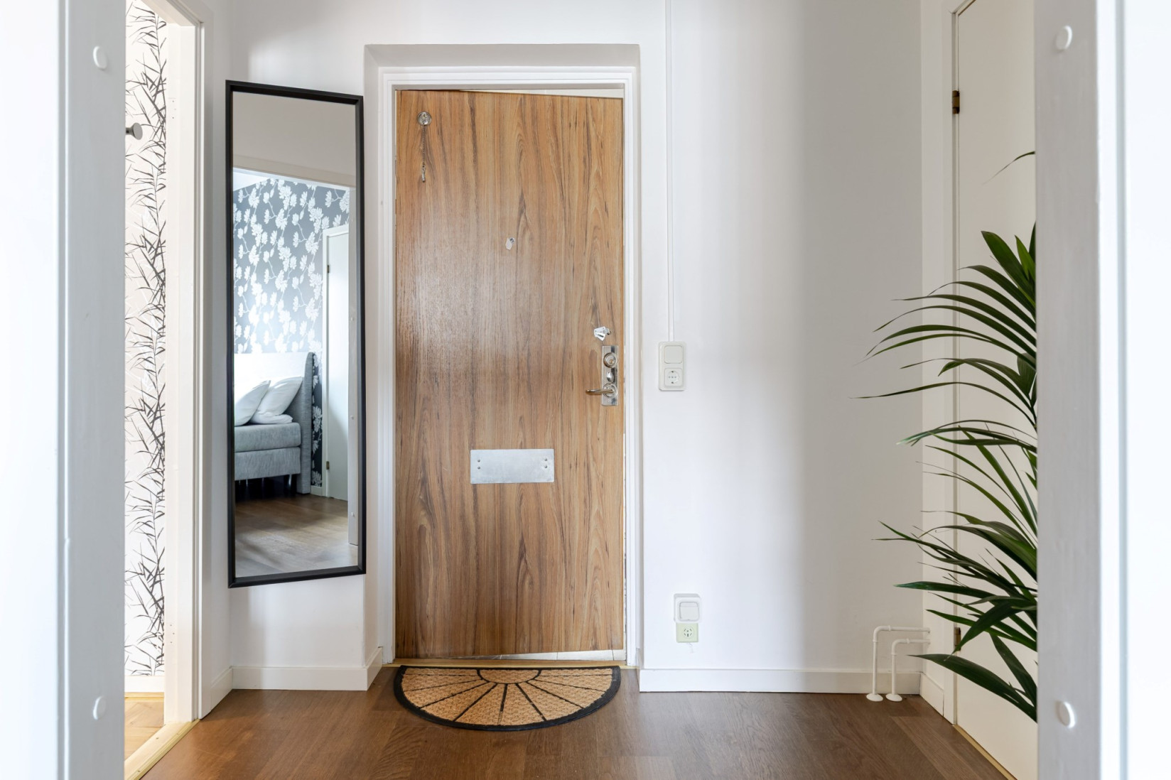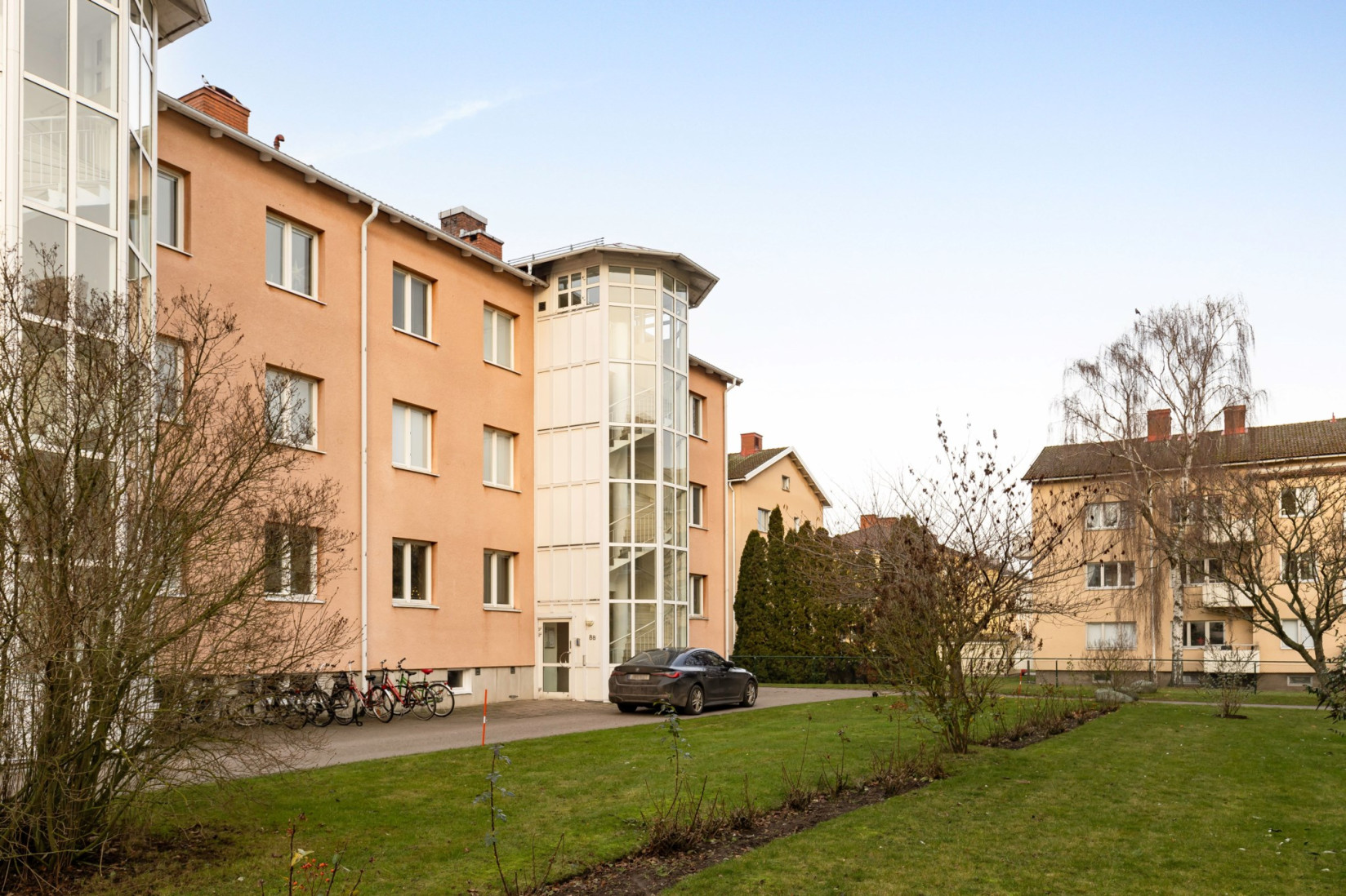 På tredje våningen möter du denna ljusa och välkomnande bostad. Direkt innanför dörren öppnar sig en rymlig hall med goda avhängningsmöjligheter.