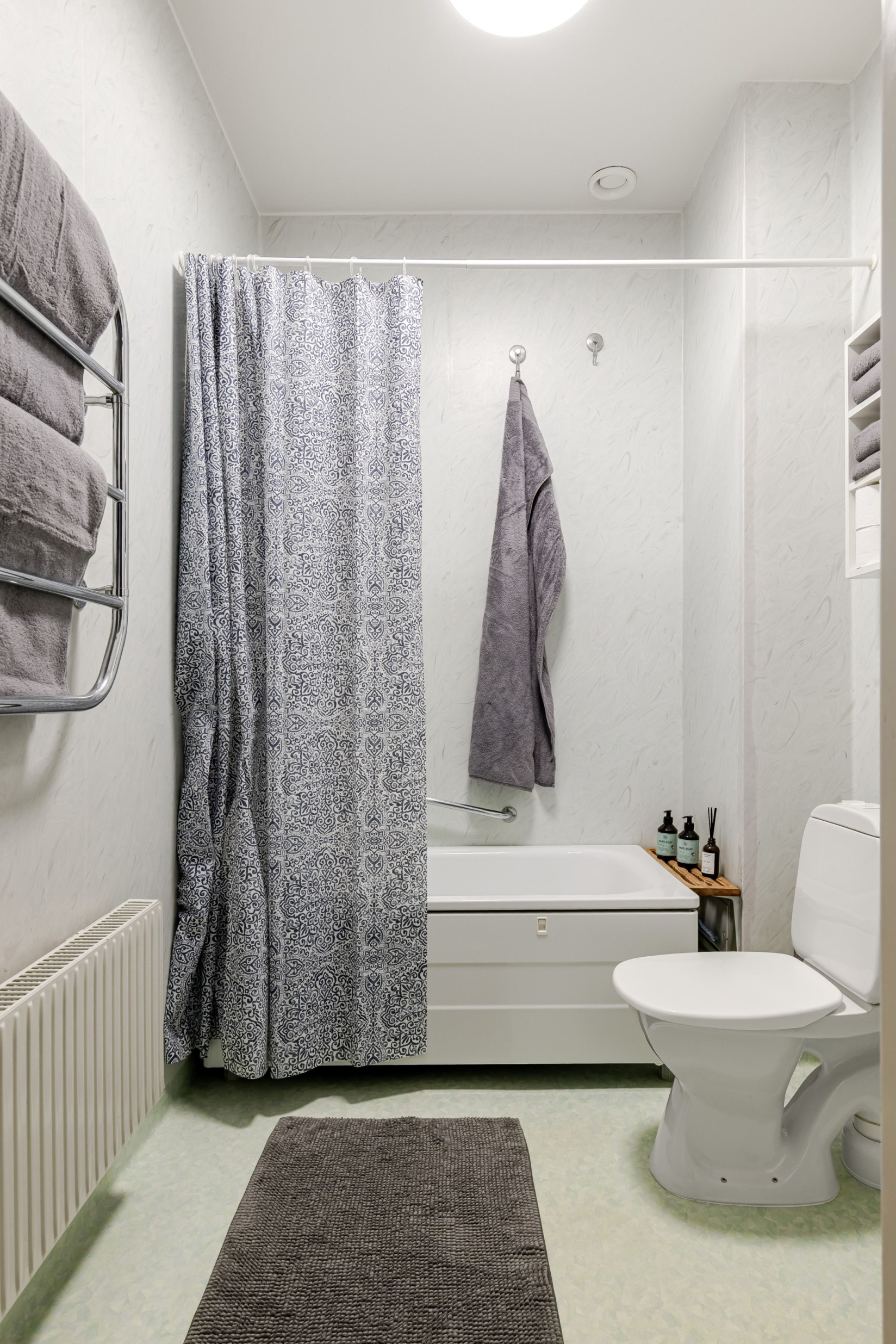 Badrummet, placerat i anslutning till hallen, är fräscht och utrustat med badkar, handfat, spegel, toalett samt handdukstork.