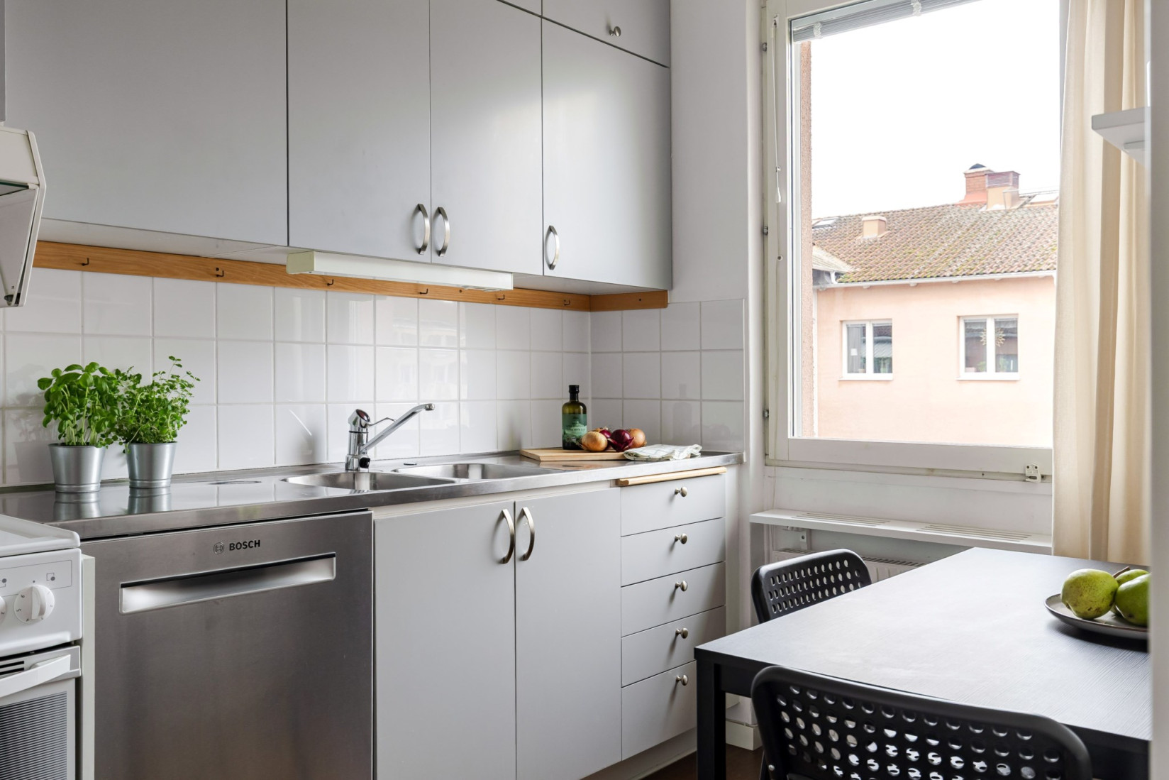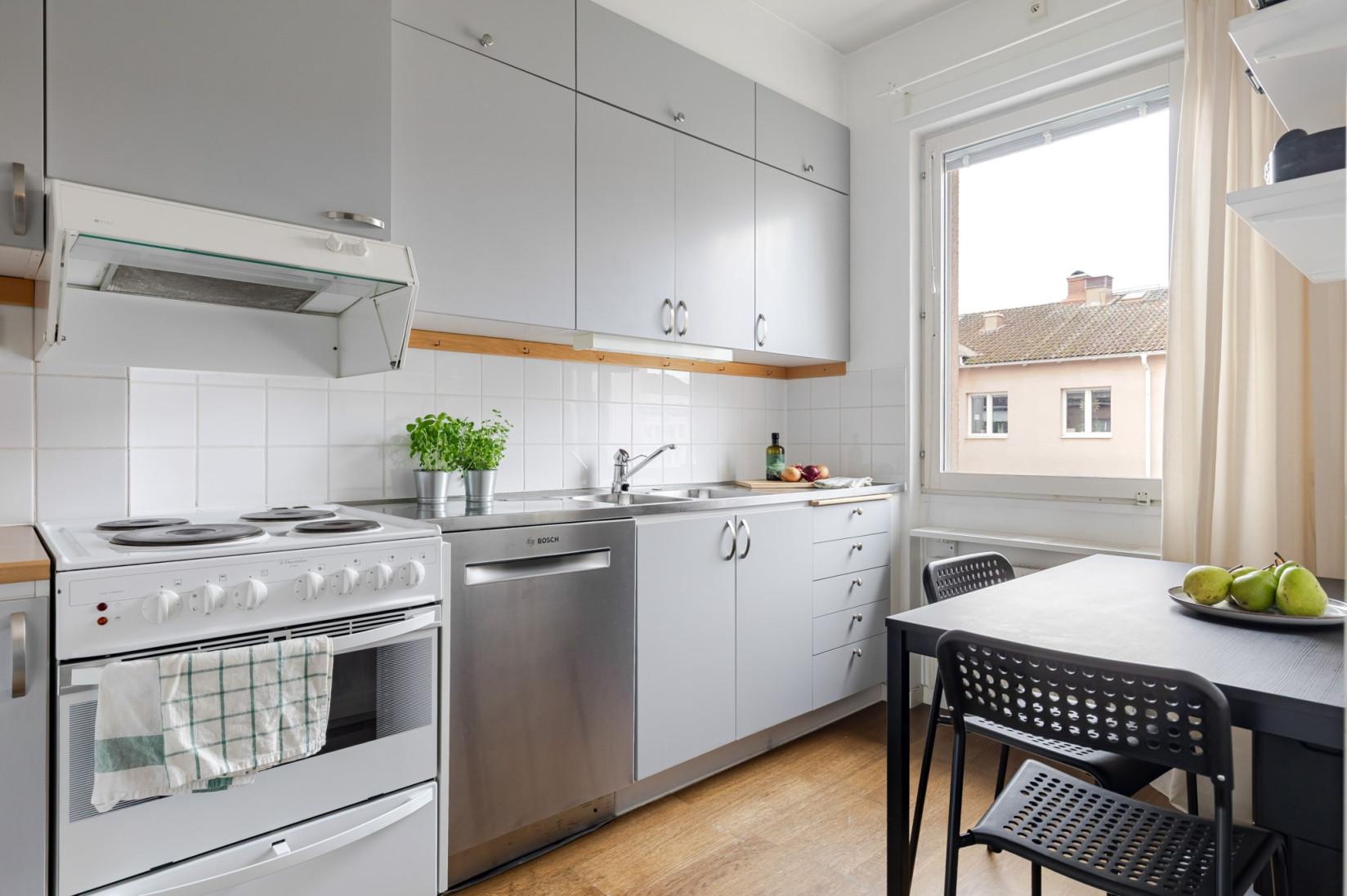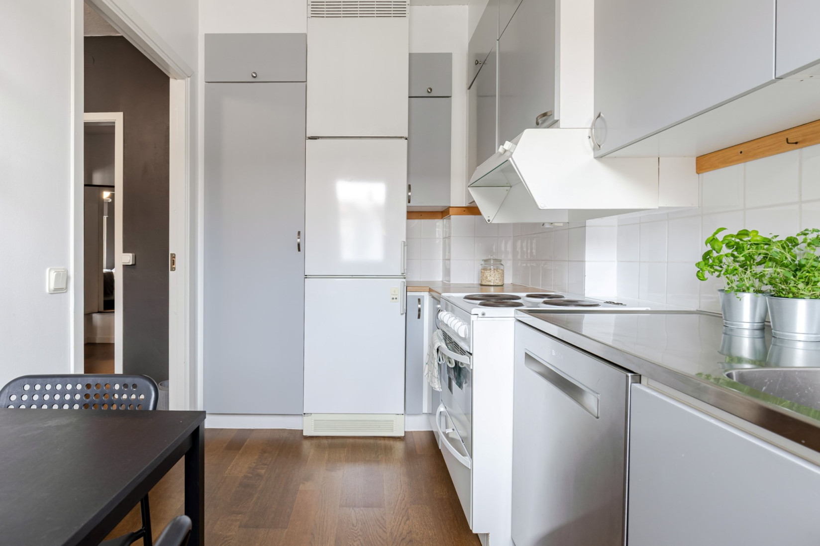 Vidare når du köket, som erbjuder gott om förvaring och är utrustat med kyl/frys, spis, fläkt och diskmaskin. Här finns även plats för ett mindre matbord.