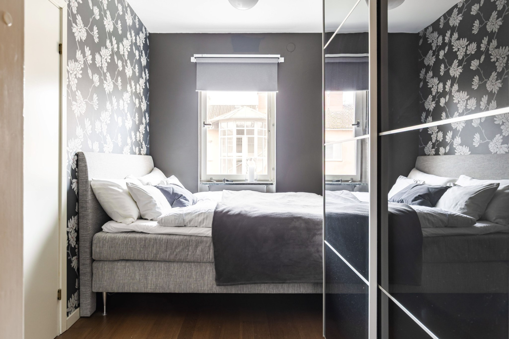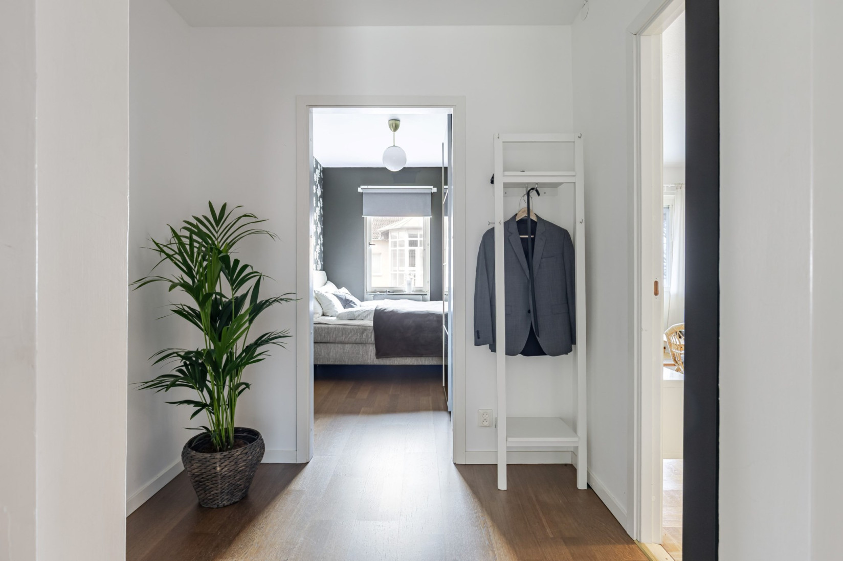 Intill vardagsrummet ligger ett rum som lämpar sig väl som sovrum eller matrum. Här ryms dubbelsäng alternativt matbord för 4–6 personer, och förvaringen löses via två garderober.