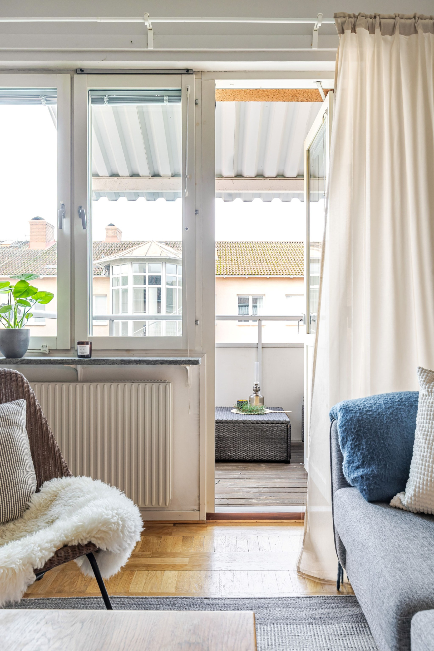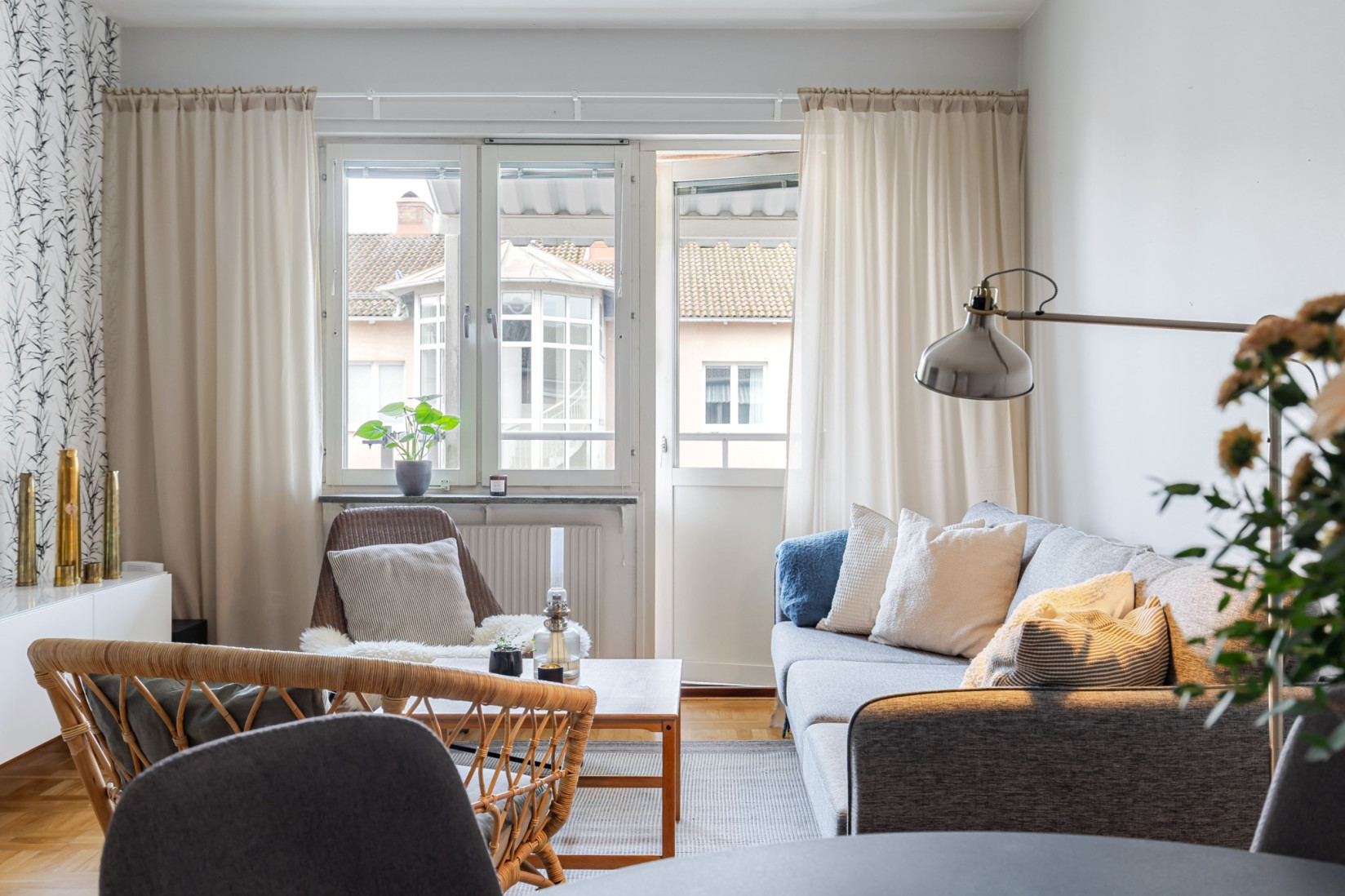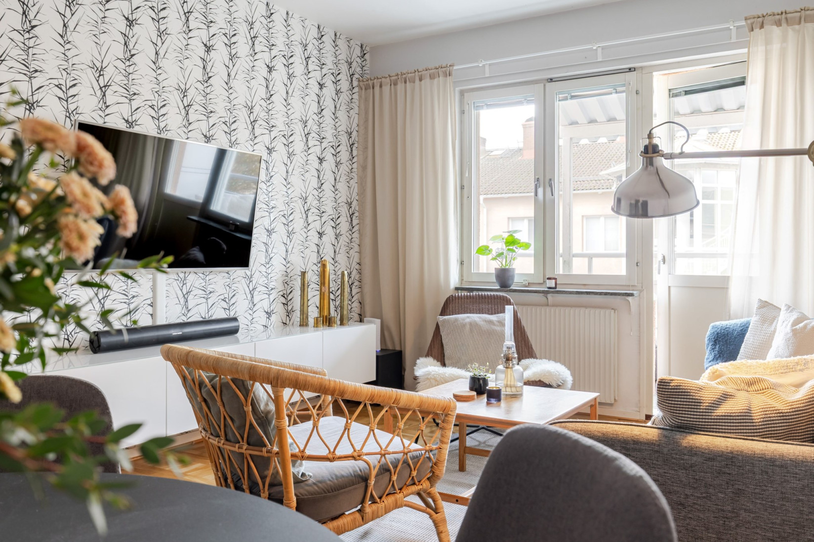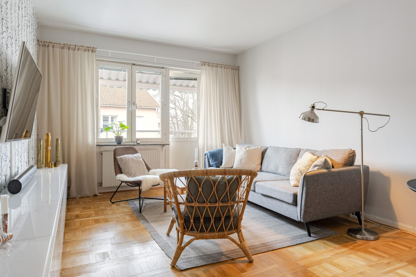 Vardagsrummet är generöst tilltaget och får ett fint ljusinsläpp genom stora fönsterpartier. Rummet erbjuder plats för både soffgrupp, matplats och tv-möbel, samtidigt som ytan upplevs öppen och lättmöblerad. Härifrån nås balkongen i västerläge, en uppskattad plats med eftermiddags- och kvällssol.