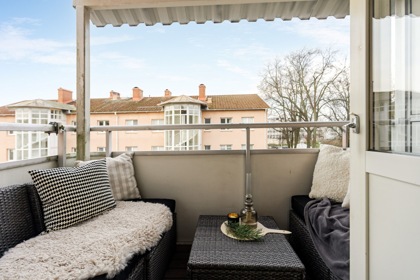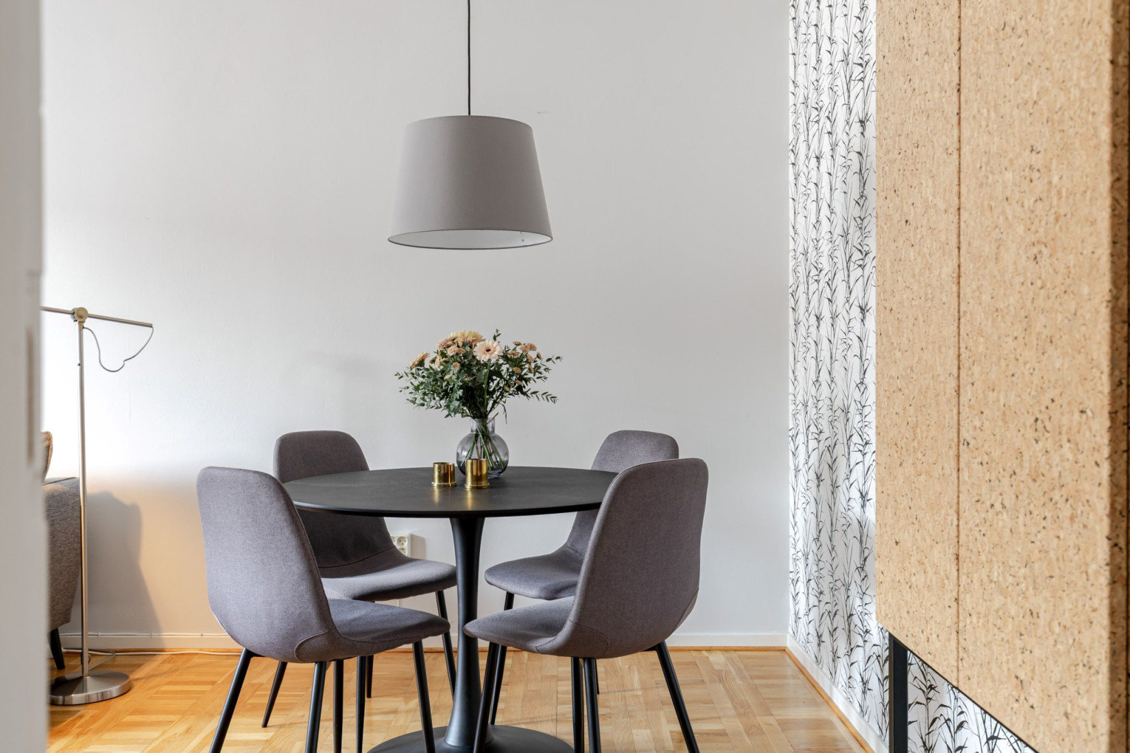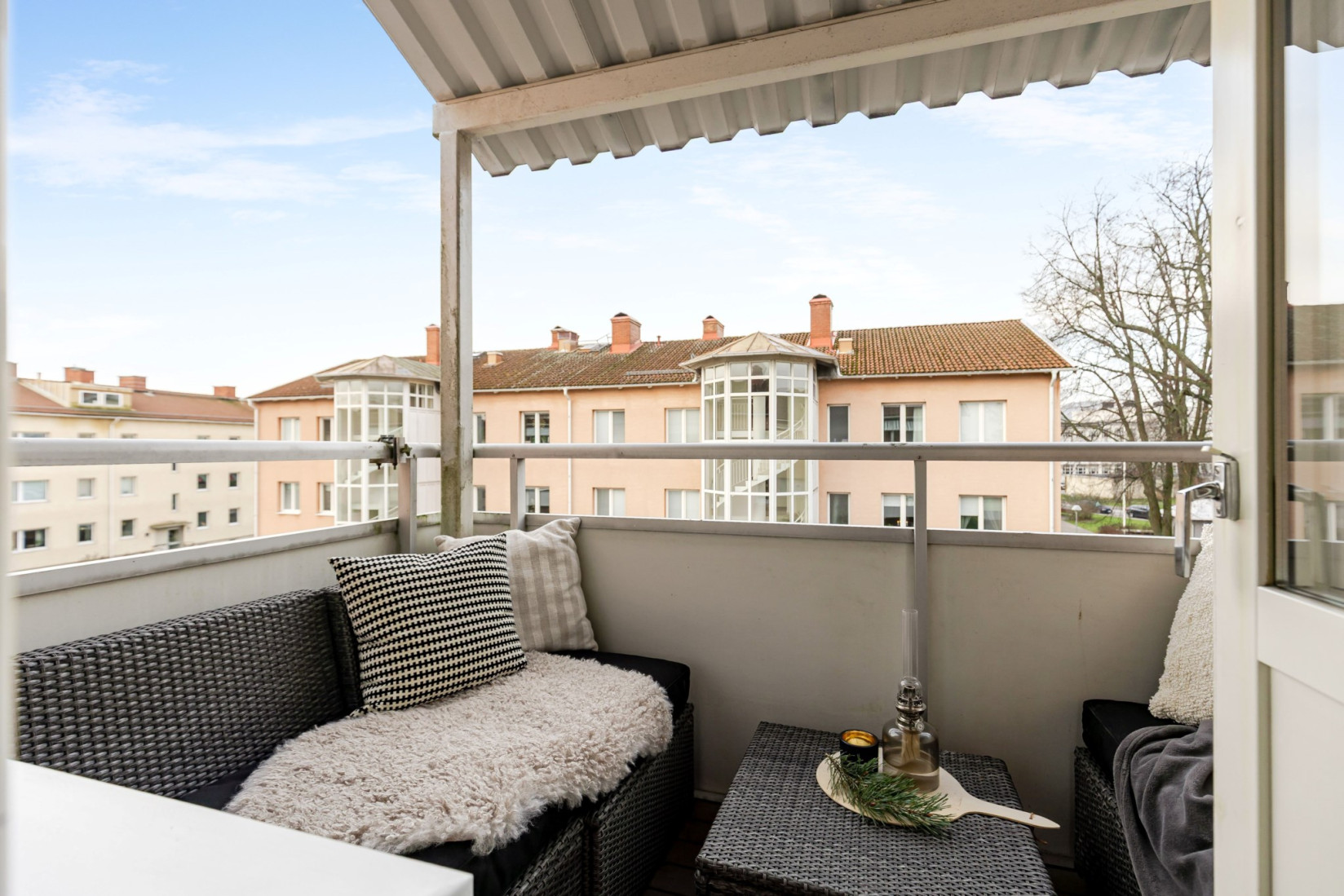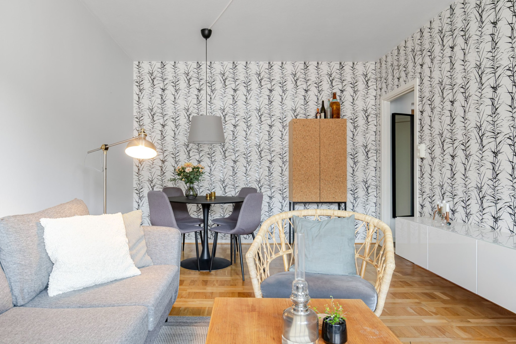Vardagsrummet är generöst tilltaget och får ett fint ljusinsläpp genom stora fönsterpartier. Rummet erbjuder plats för både soffgrupp, matplats och tv-möbel, samtidigt som ytan upplevs öppen och lättmöblerad. Härifrån nås balkongen i västerläge, en uppskattad plats med eftermiddags- och kvällssol.