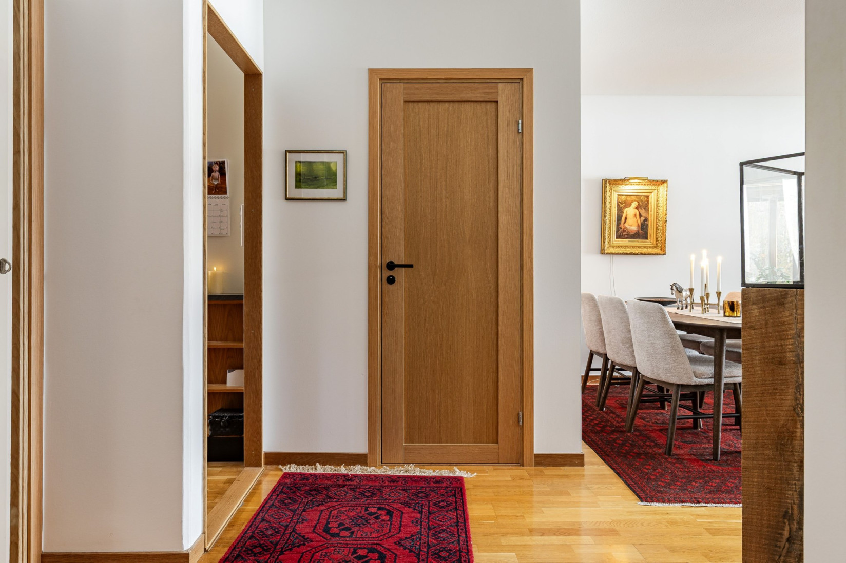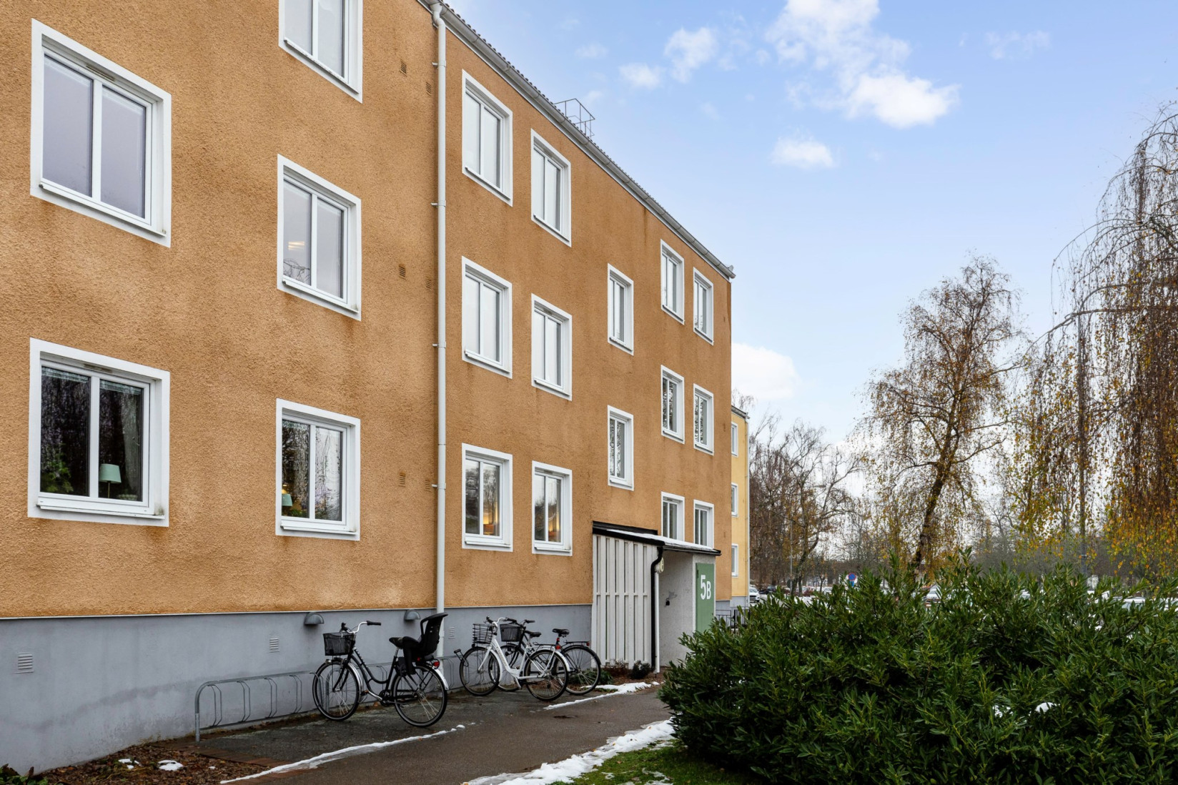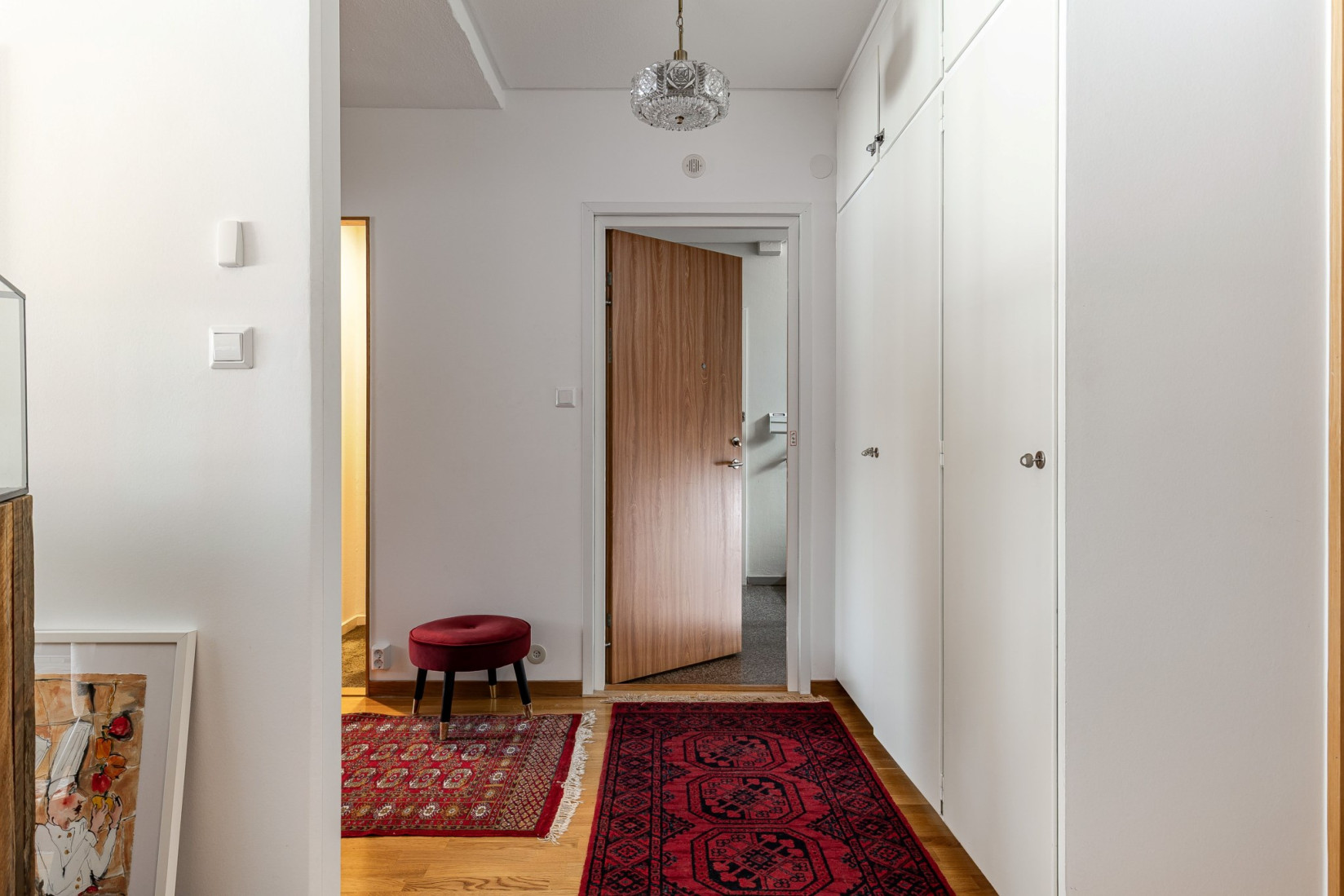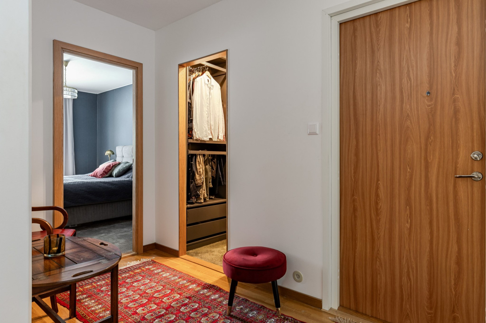 Välkommen till lugna och lummiga kvarter. Från Arvid Västgötes gata går vi in genom porten märkt 5B, där skogen breder ut sig som närmaste granne. På första våningen väntar bostaden, och hallen möter dig med en trivsam yta som rymmer både avhängning och möblering. Intill entrén ligger en praktisk klädkammare, och utöver den erbjuds ytterligare tre garderober för smidig förvaring.