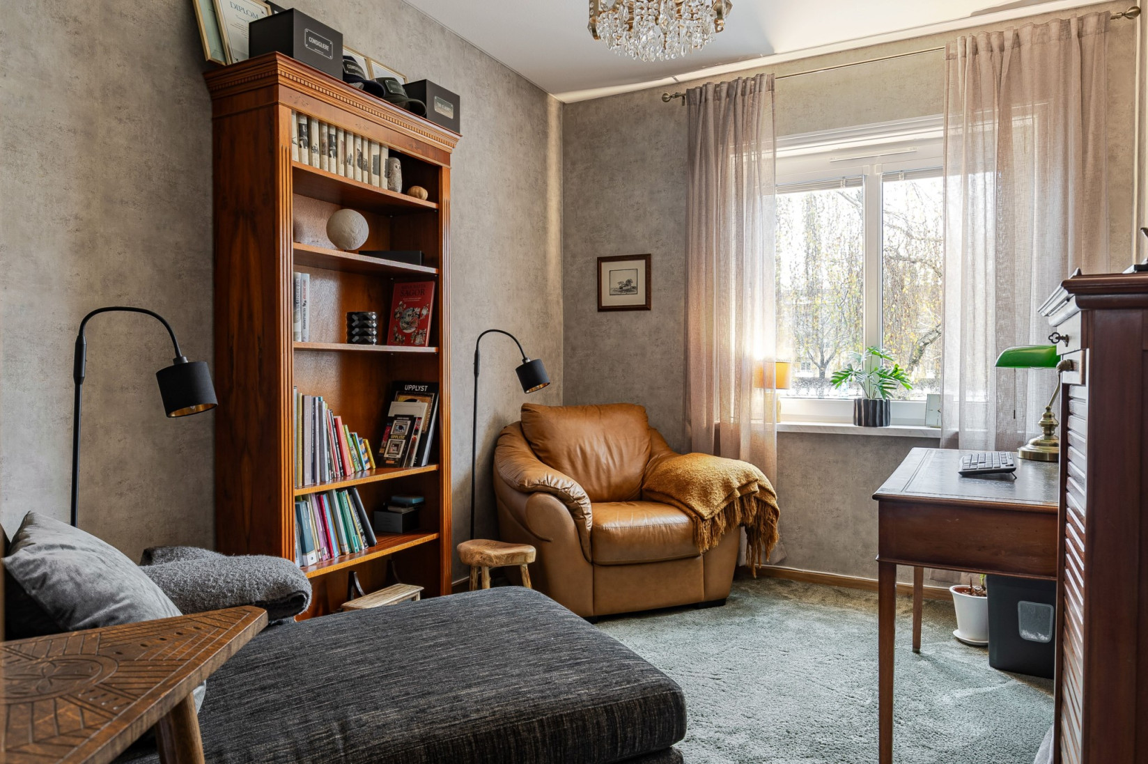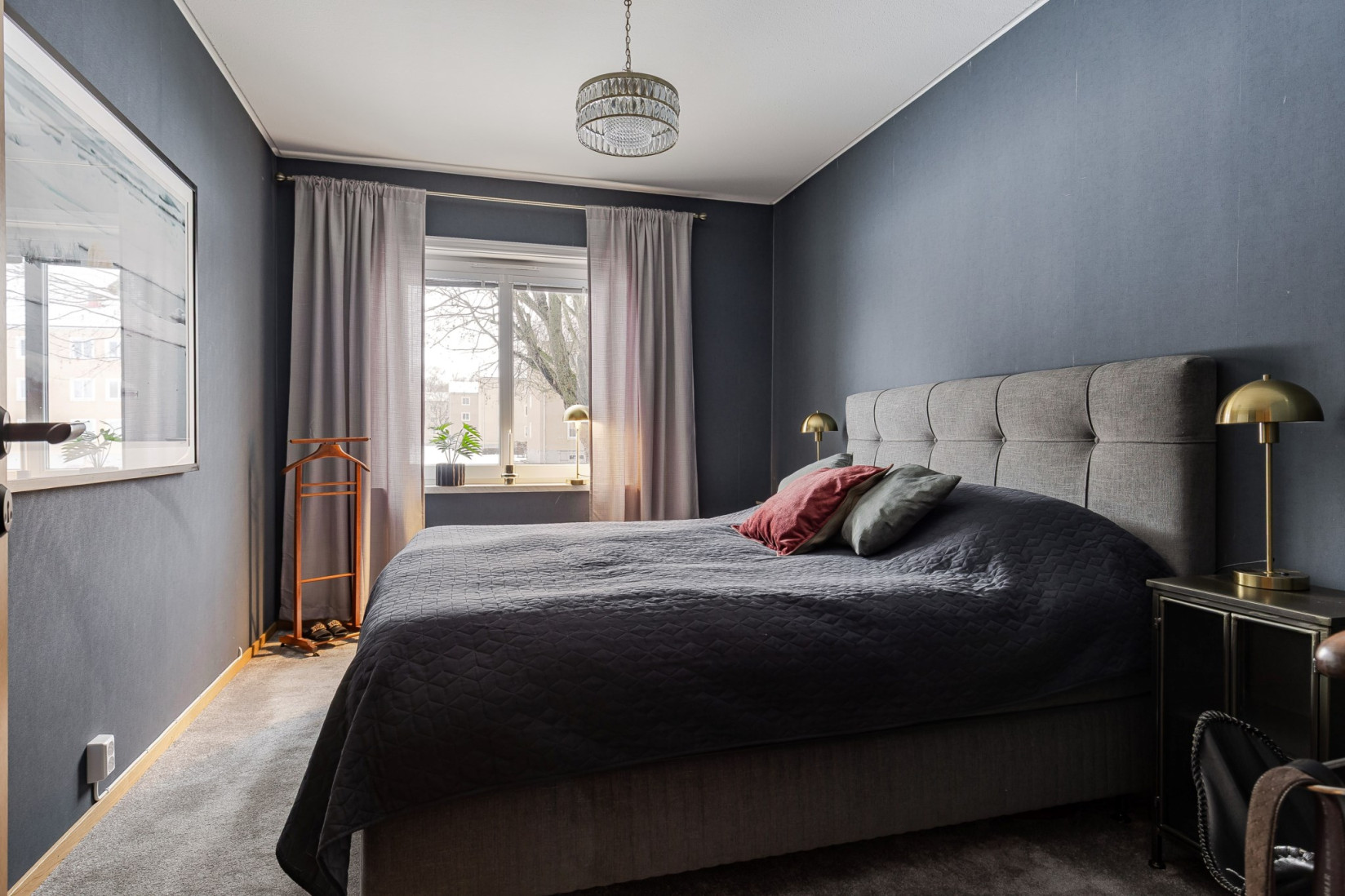 Till höger från hallen, förbi klädkammaren, når du det första sovrummet. Ett stort fönsterparti sprider gott om dagsljus och läget är lugnt med utsikt mot den gröna sidan av huset. Rummet ger plats för dubbelsäng, nattduksbord och byrå. Sovrum nummer två – som fungerar perfekt som gästrum, barnrum eller kontor – är placerat mot husets framsida.