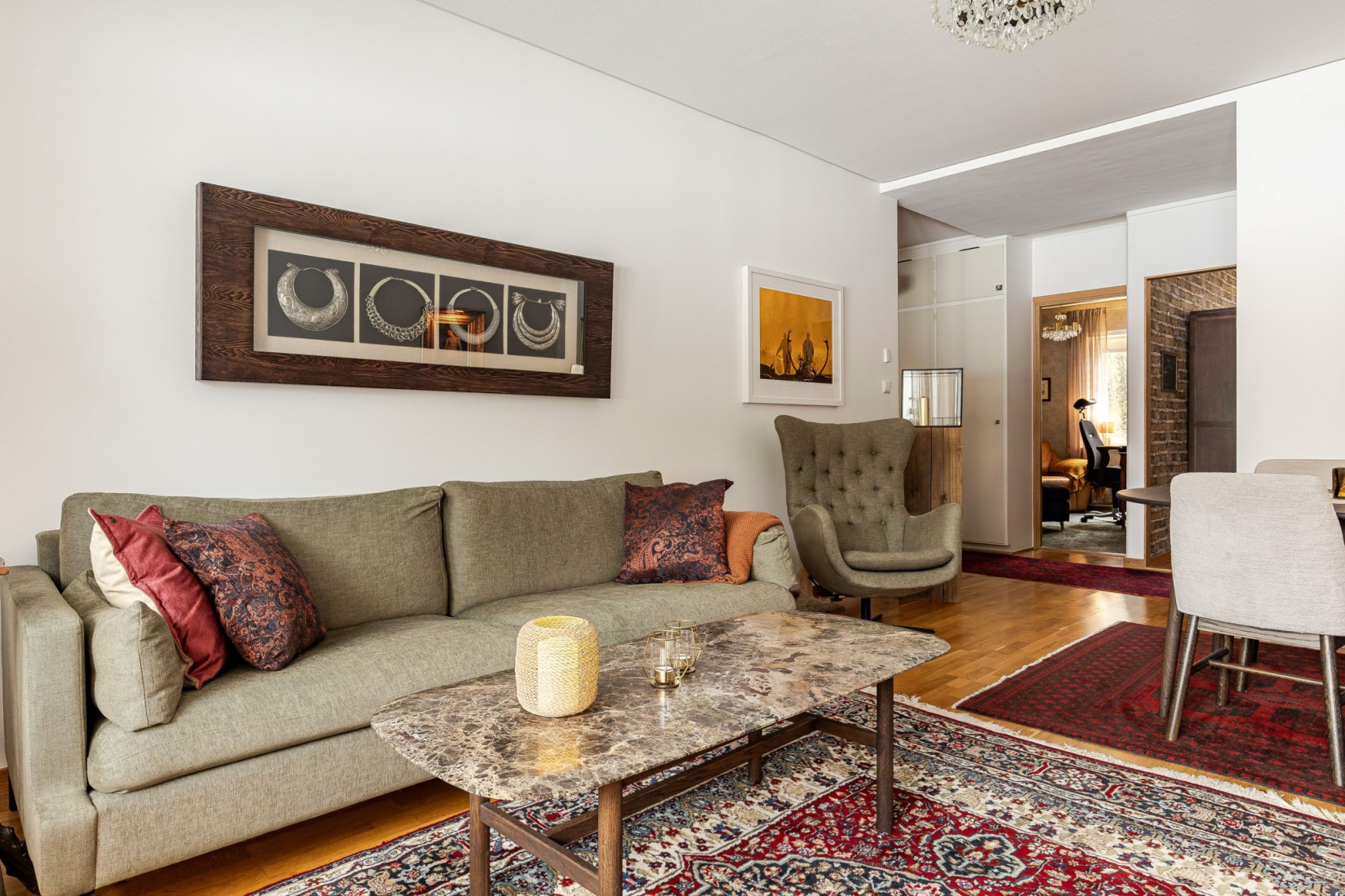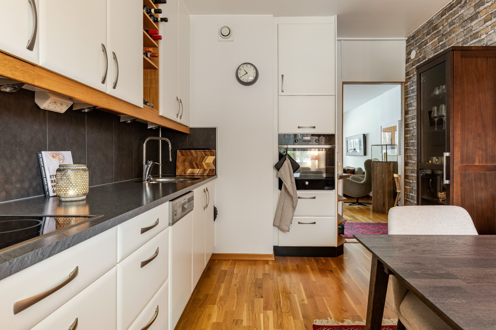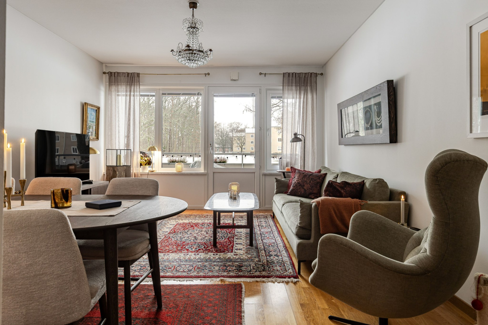 Från hallen fortsätter du vidare till vardagsrummet, där utgången mot en västervänd balkong blir ett naturligt blickfång. Här väntar eftermiddags- och kvällssol samt en fri utsikt över grönområde och skogsdunge utan hus som stör blicken. Rummet rymmer både soffgrupp, tv-möbel och matplats.