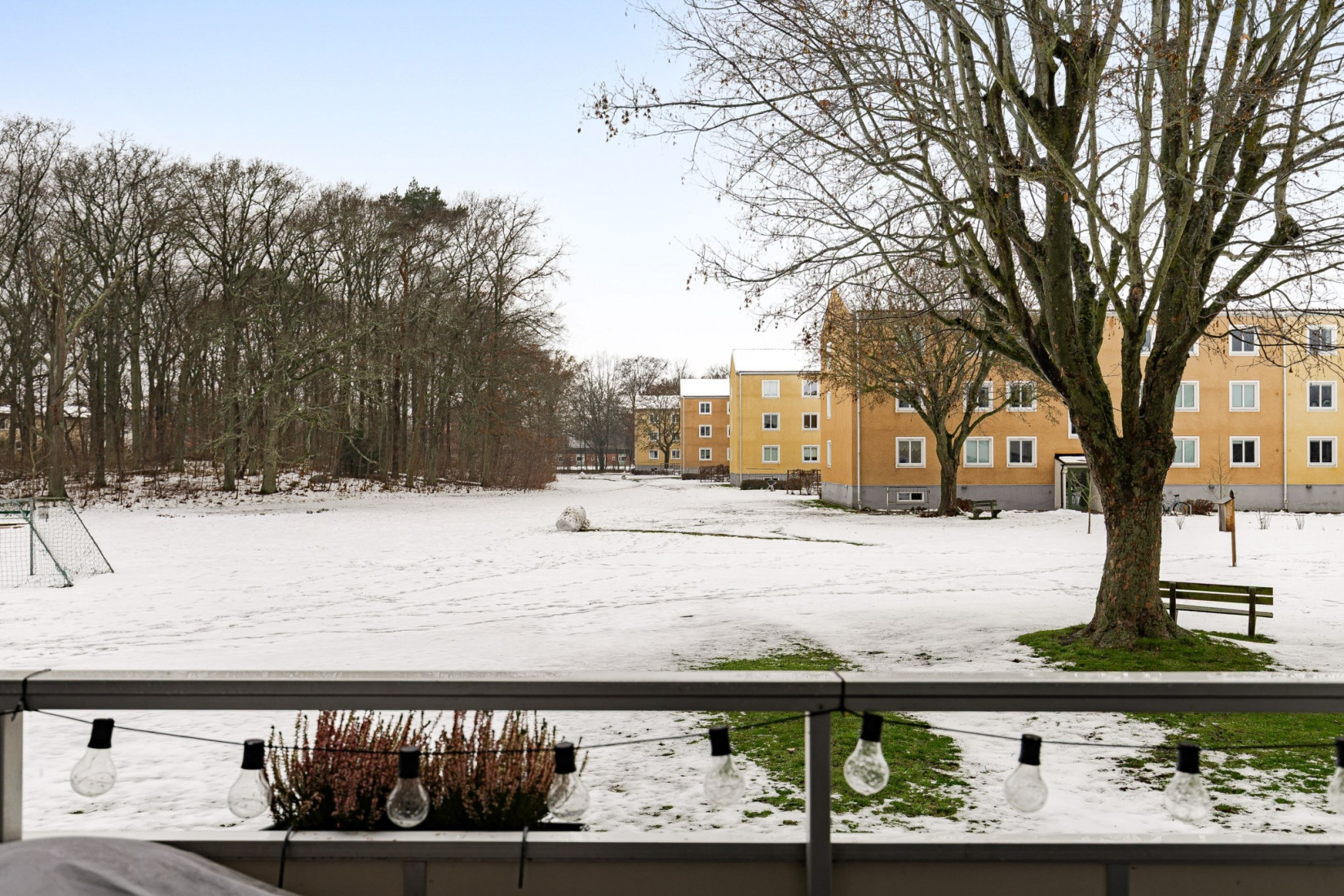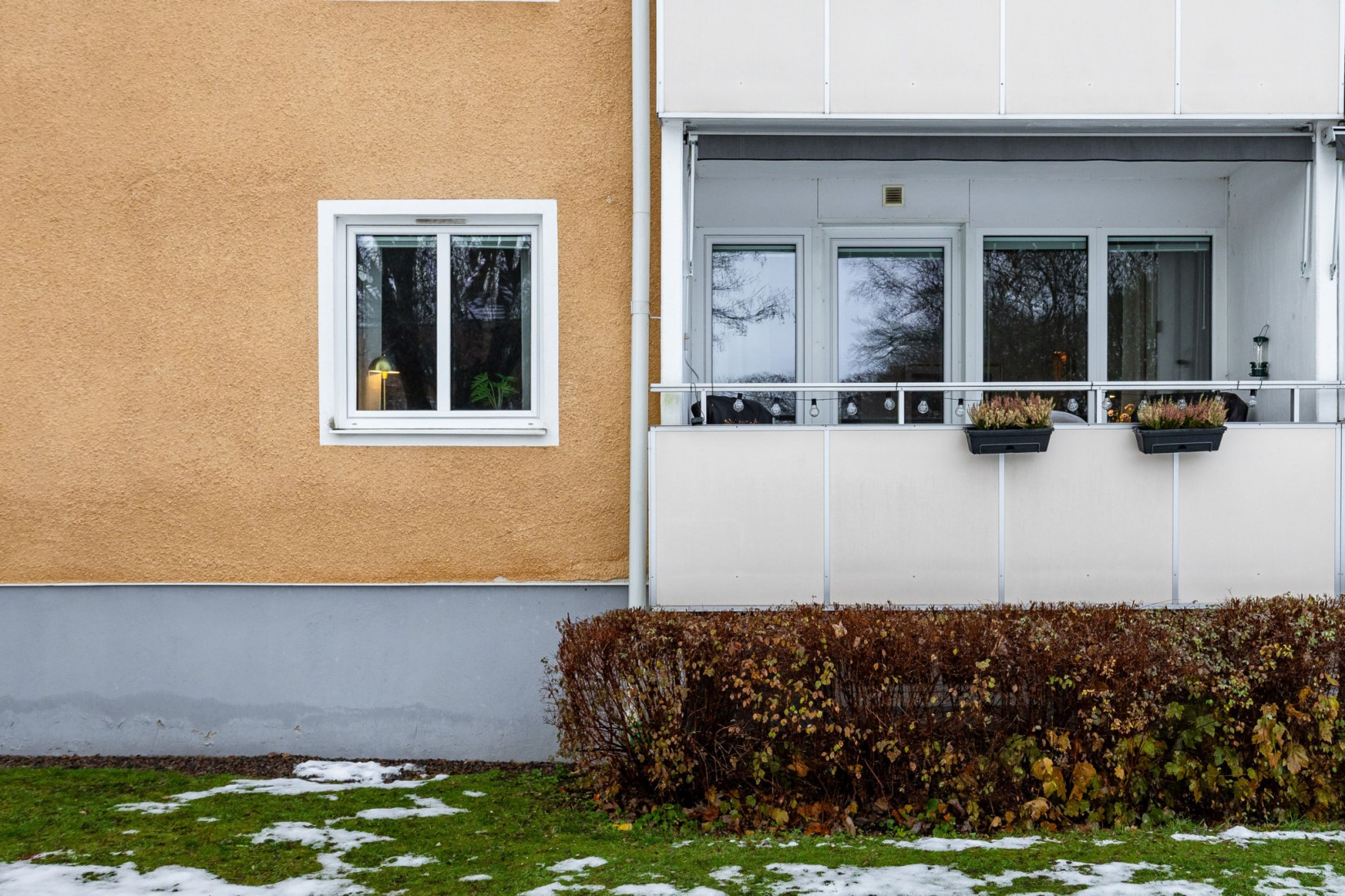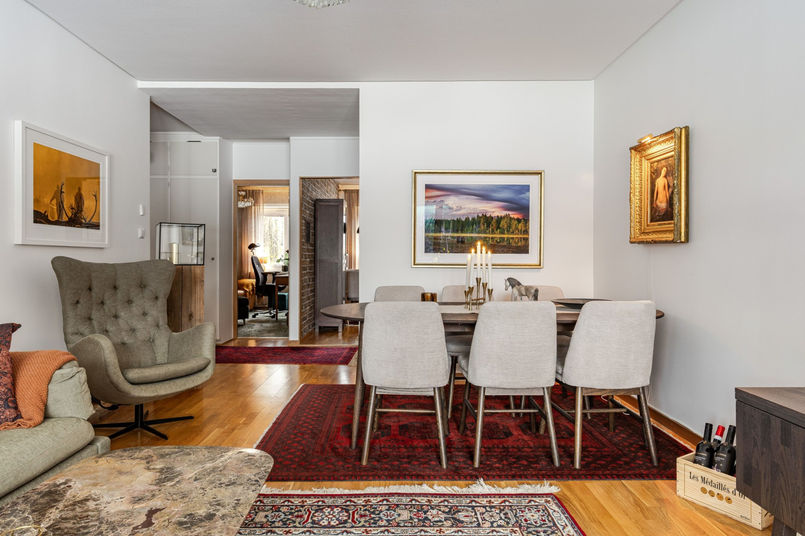 Från hallen fortsätter du vidare till vardagsrummet, där utgången mot en västervänd balkong blir ett naturligt blickfång. Här väntar eftermiddags- och kvällssol samt en fri utsikt över grönområde och skogsdunge utan hus som stör blicken. Rummet rymmer både soffgrupp, tv-möbel och matplats.
