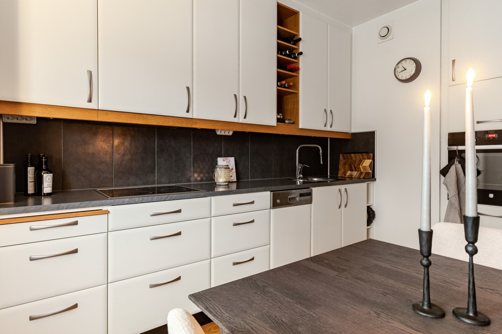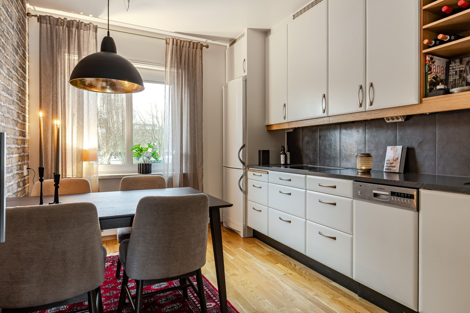 Köket är rymligt och välplanerat med ett generöst fönsterparti som ger ett behagligt ljus. Här erbjuds gott om arbetsytor och förvaring. Utrustningen består av häll, fläkt, kyl/frys, inbyggd ugn och diskmaskin. Matplatsen får en naturlig placering vid fönstret.