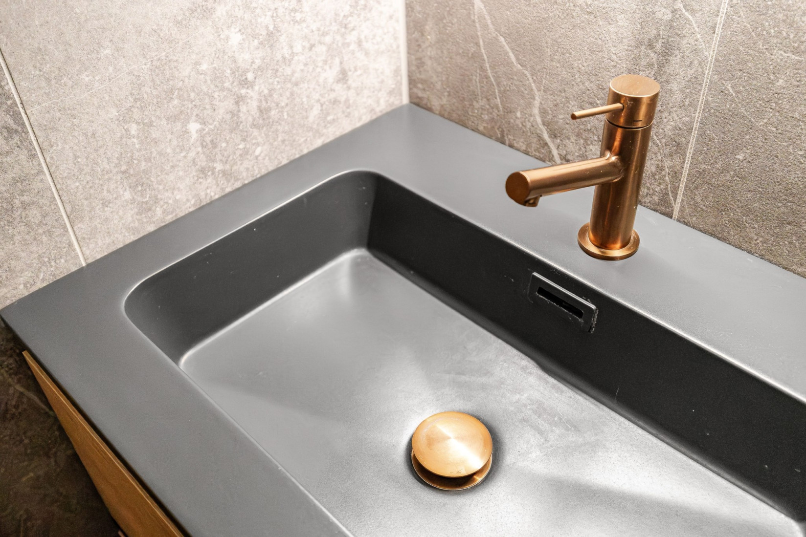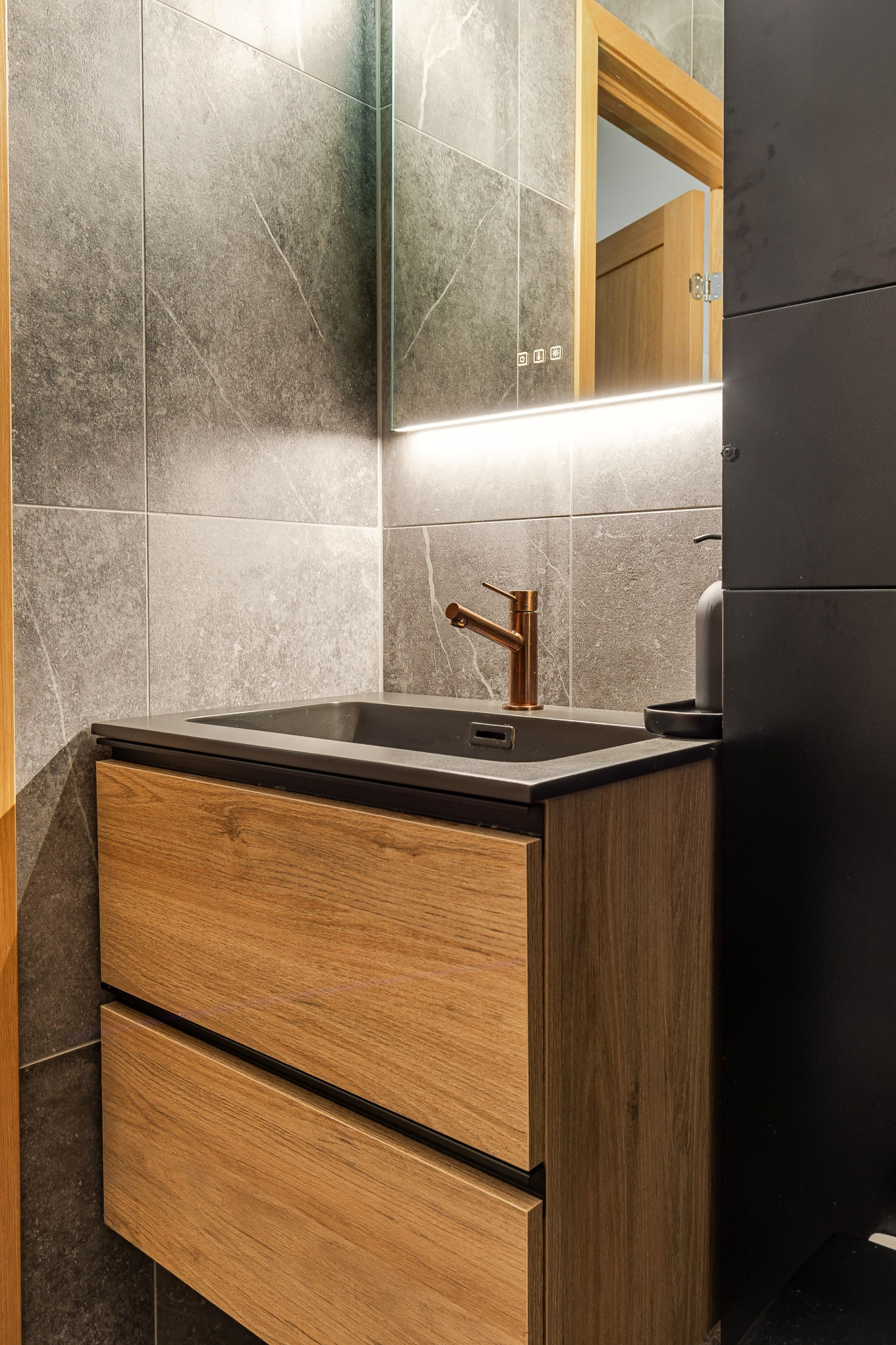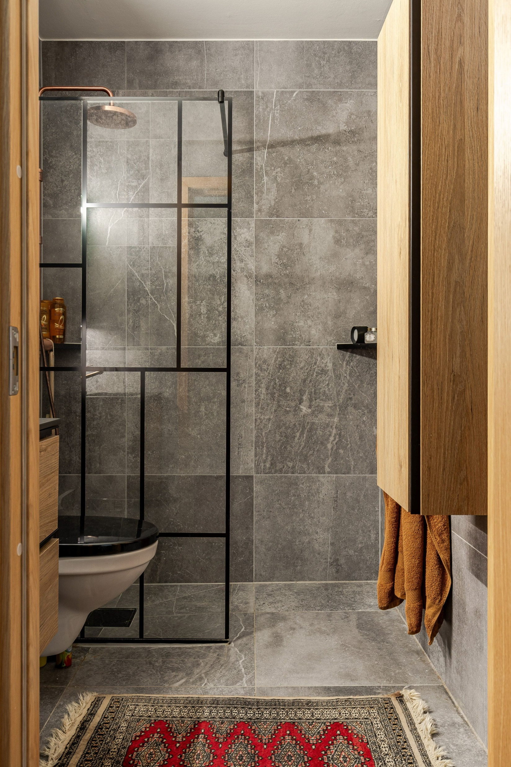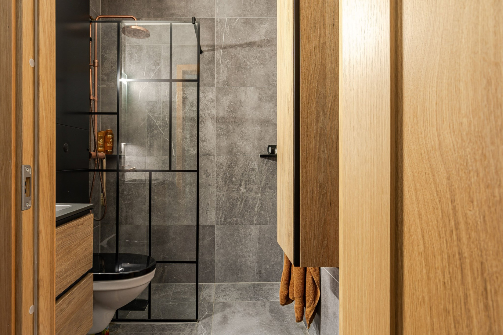 Det totalrenoverade badrummet från 2024 är utfört med helkaklade ytor och påkostade materialval. Här ingår kommod med handfat, spegel med belysning, dusch med vikbara glasväggar och skåp för praktisk förvaring.