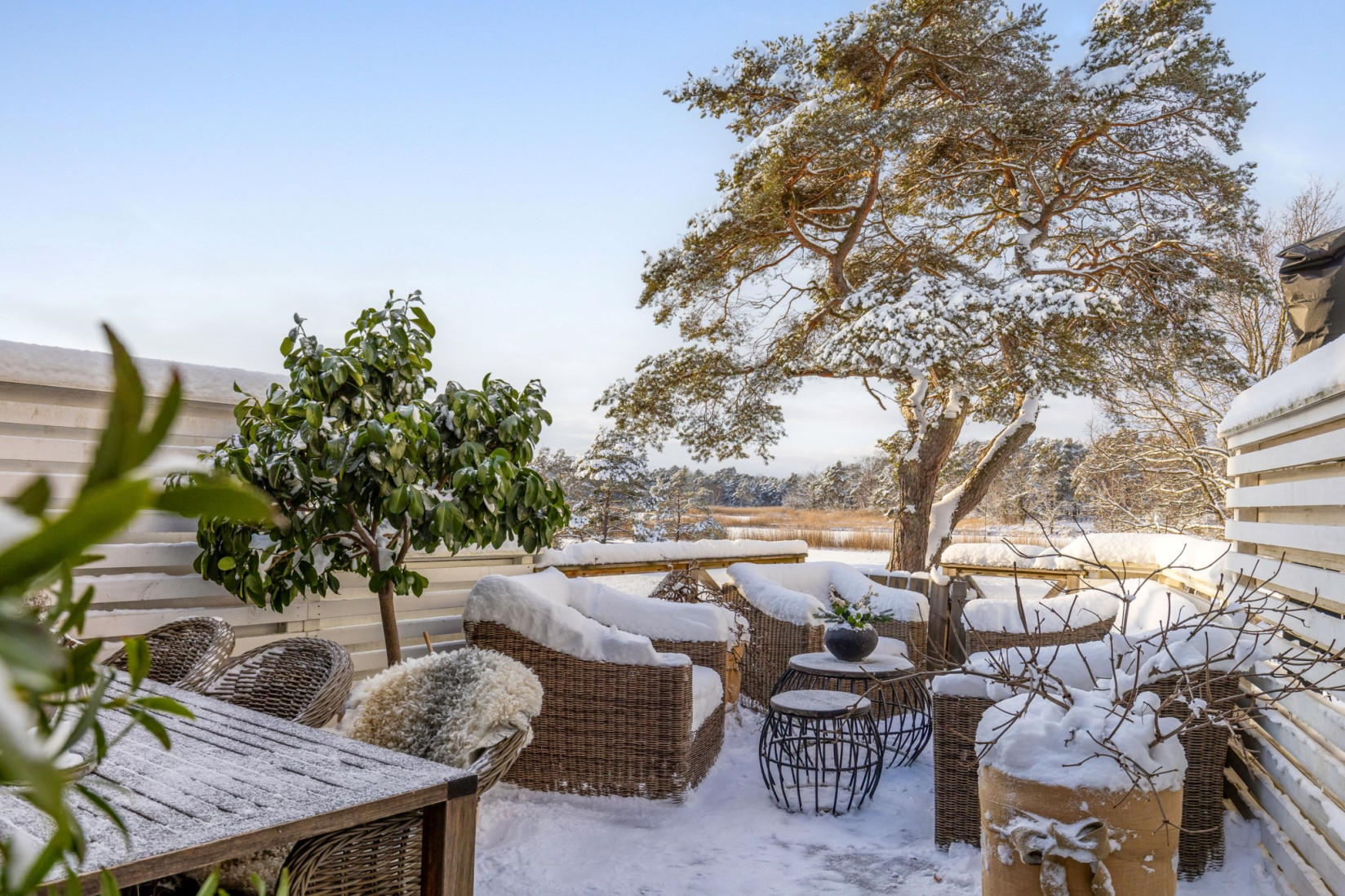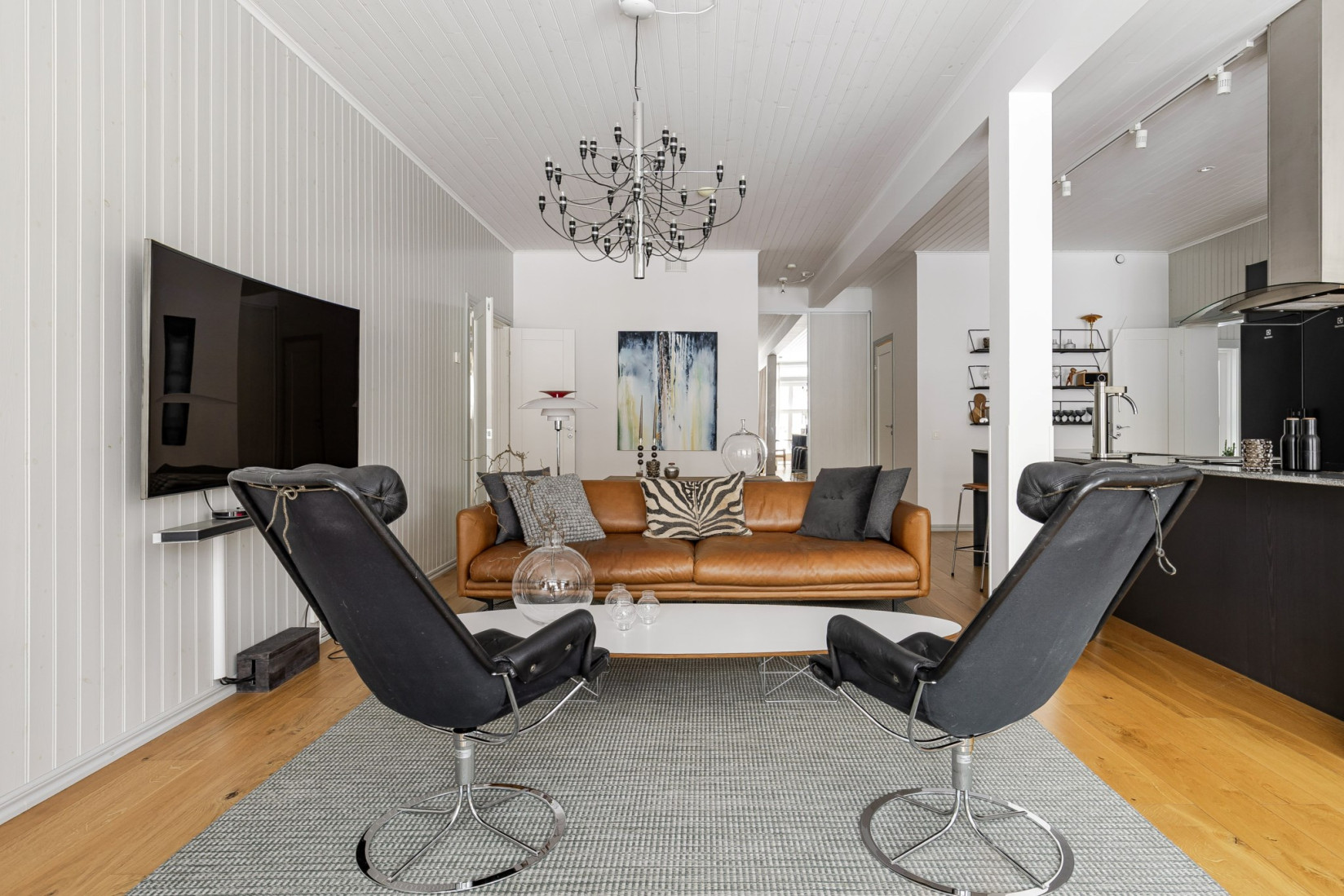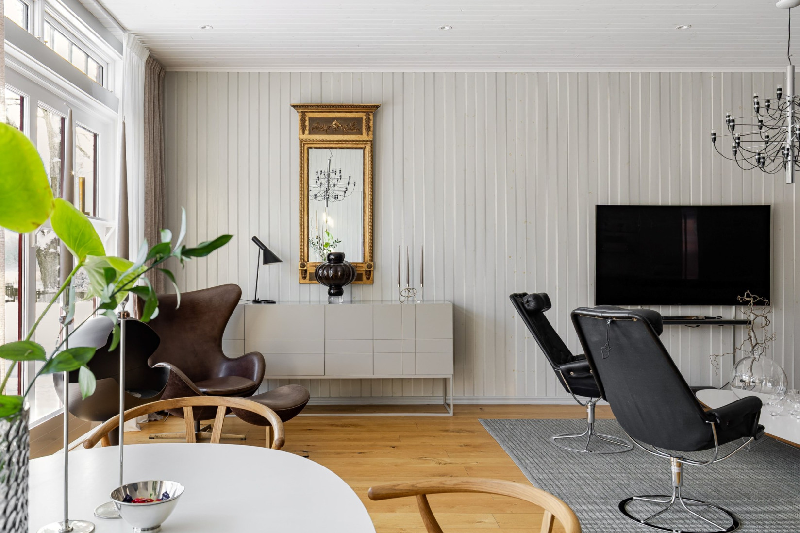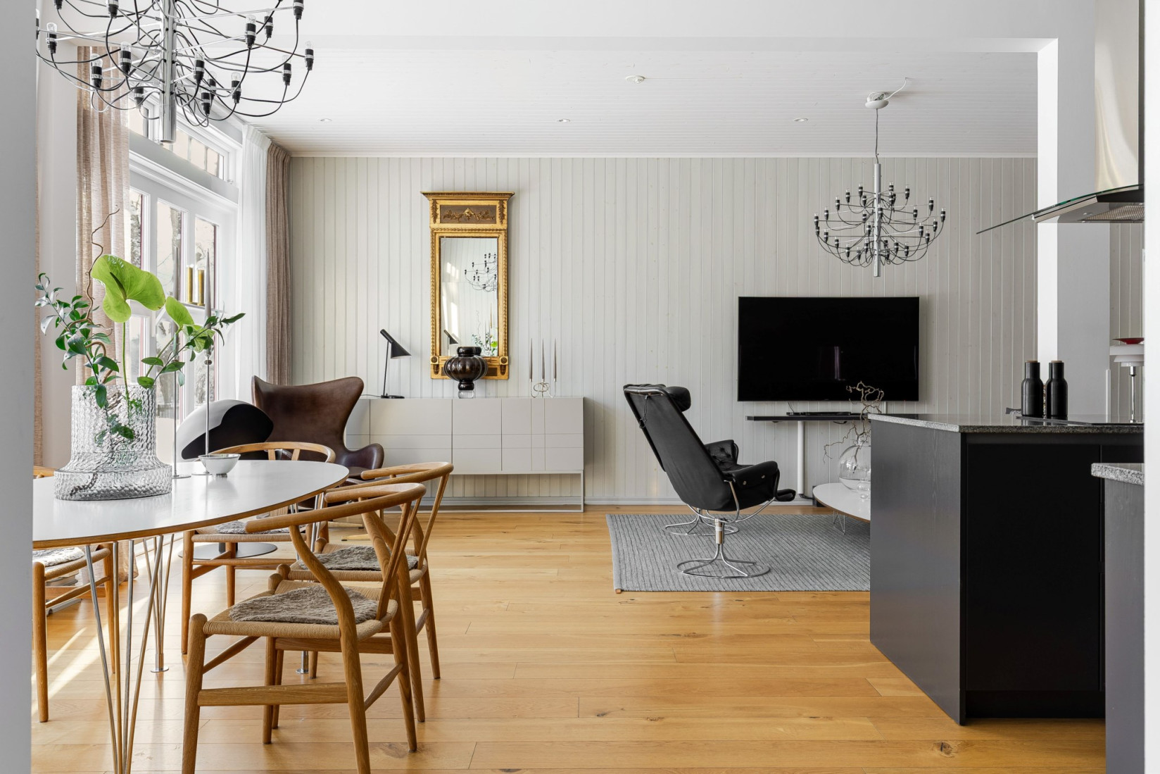 Den egna entrén i markplan sätter tonen direkt. Innanför dörren möts du av generös takhöjd, ett mjukt ljusflöde och en genomtänkt färgskala som löper genom hela hemmet. Pärlspont klär väggar och tak och tillsammans med golvvärme i samtliga rum skapas en behaglig helhet året om. Enstavsparkett i ek från Kährs sträcker sig sammanhängande genom bostaden och binder samman rummen på ett naturligt sätt.