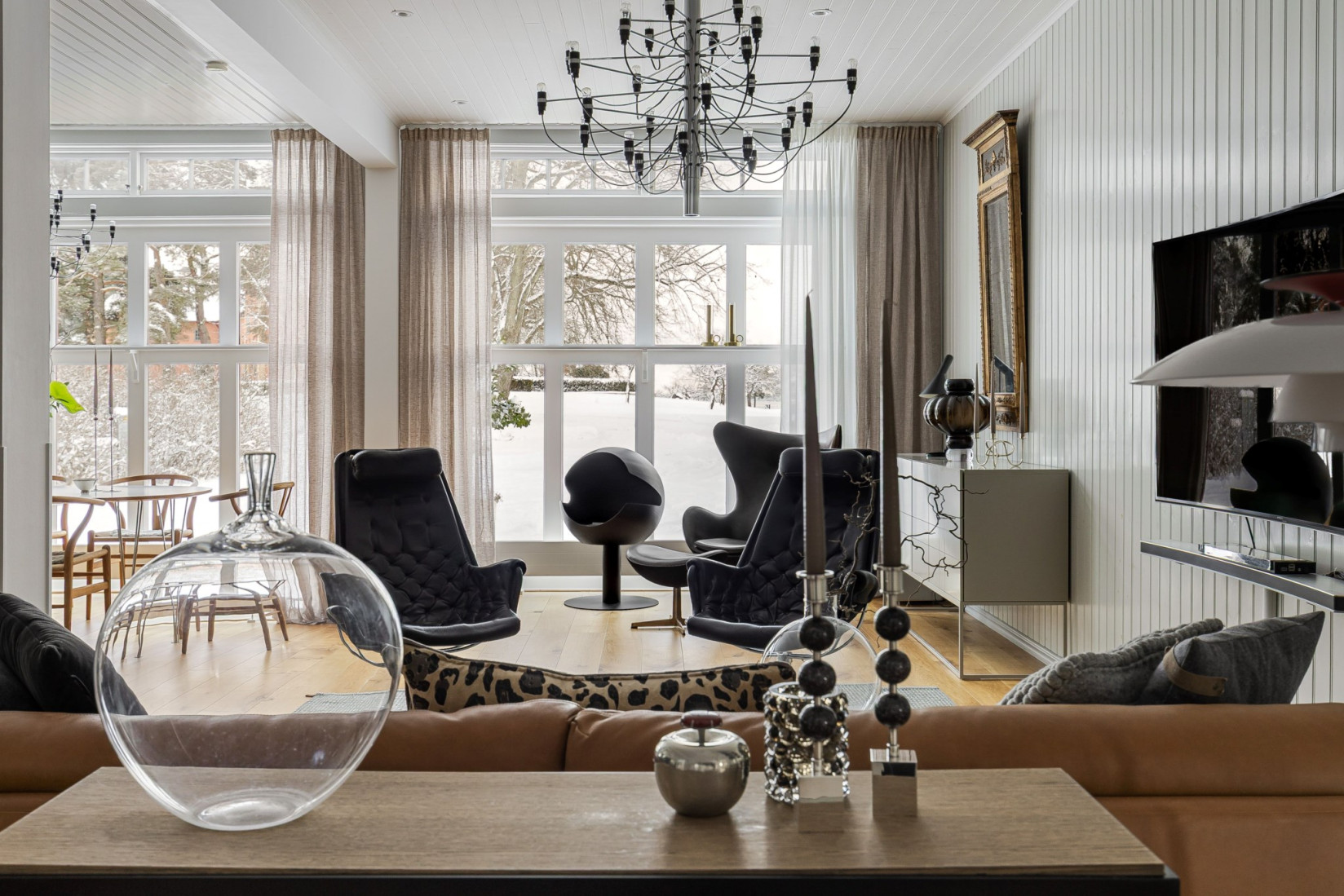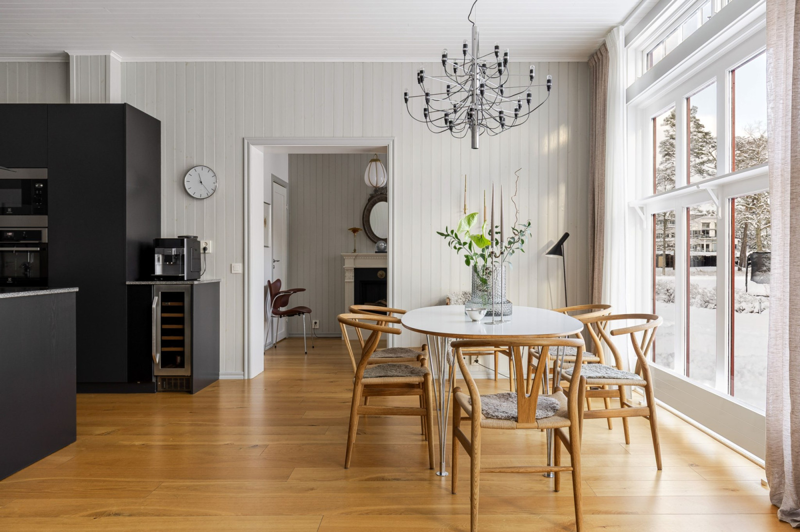 Vidare öppnar bostaden upp sig i generösa sällskapsytor där ljuset spelar huvudrollen. Ett imponerande fönsterparti, från golv till tak, sträcker sig längs ena väggen och ramar in utsikten mot Villa Solbacka, allén och vattnet bortom.