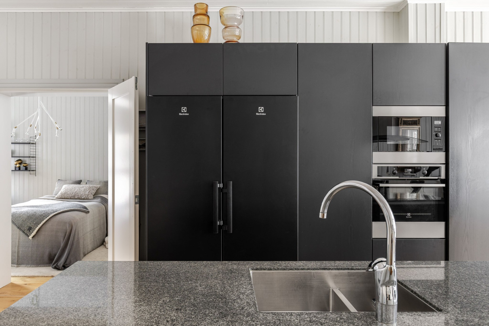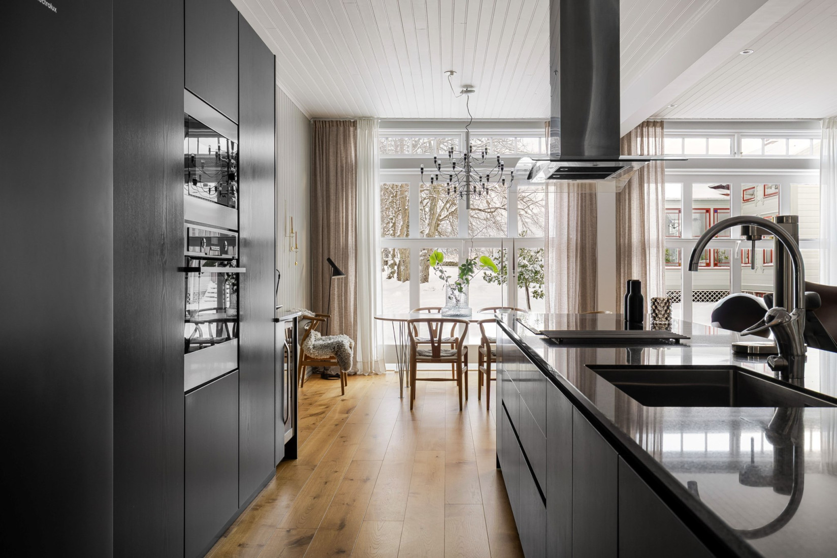 Köket från Kvänum är specialritat för denna bostad med ambition att lyfta fram de historiska anorna. Rena linjer, modernt och tidlöst. Den cirka 3,5 meter långa bänkskivan i granit erbjuder gott om arbetsyta, och de släta, handtagsfria luckorna i mörkgråmålad ask ger ett stramt och elegant uttryck. Här finns ny hel kyl och frys (2026), inbyggnadsugn och mikro samt integrerad diskmaskin. Den extra breda induktionshällen (90 cm) har ovanför sig en stilren fläktkåpa i borstad metall. Särskilda detaljer som infälld diskho, dolda eluttag och bestickinsats i ek visar på det gedigna hantverk som kännetecknar Kvänumkök. Spotlights i taket förstärker ljuset och arbetsytorna ytterligare.