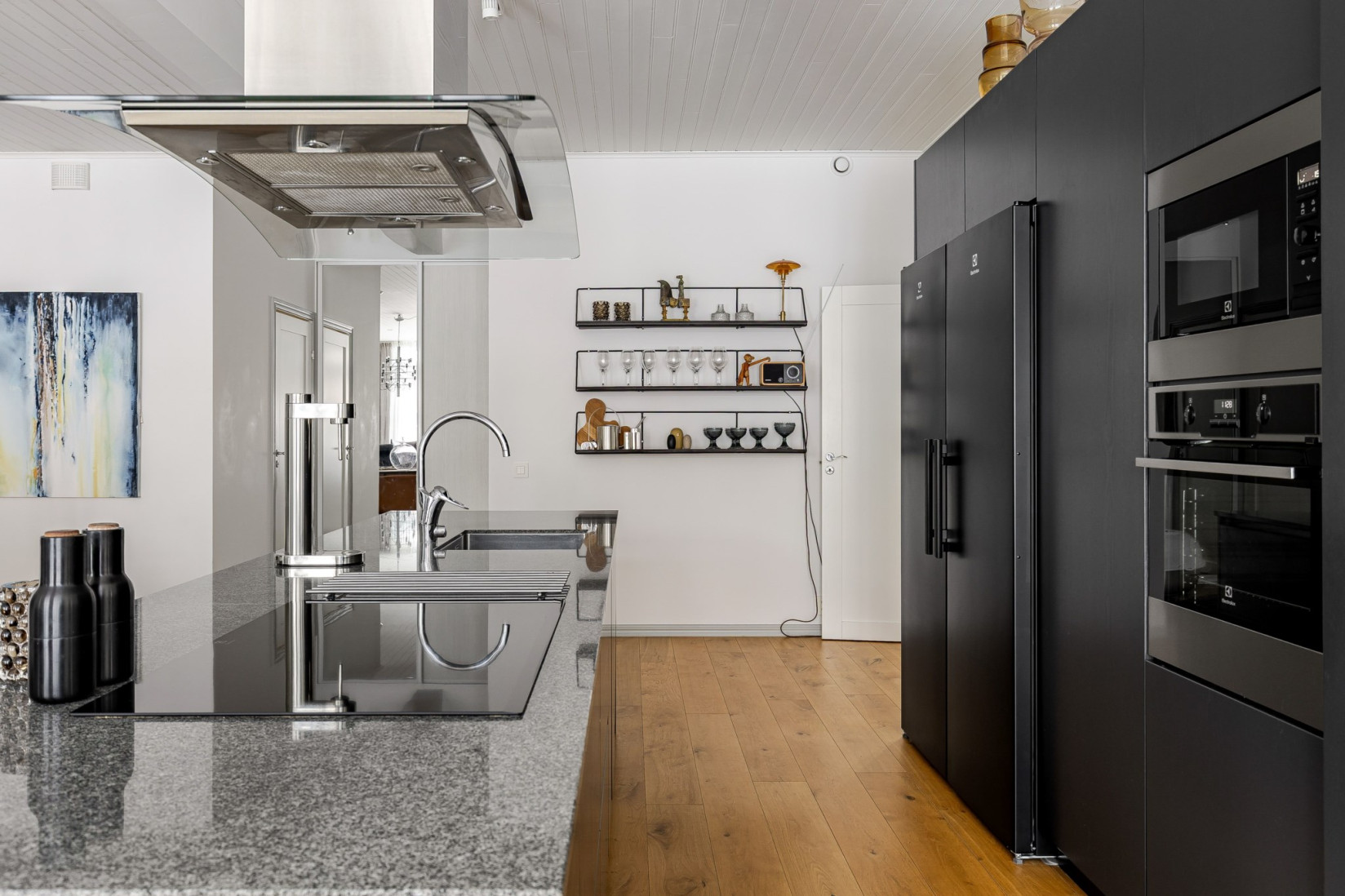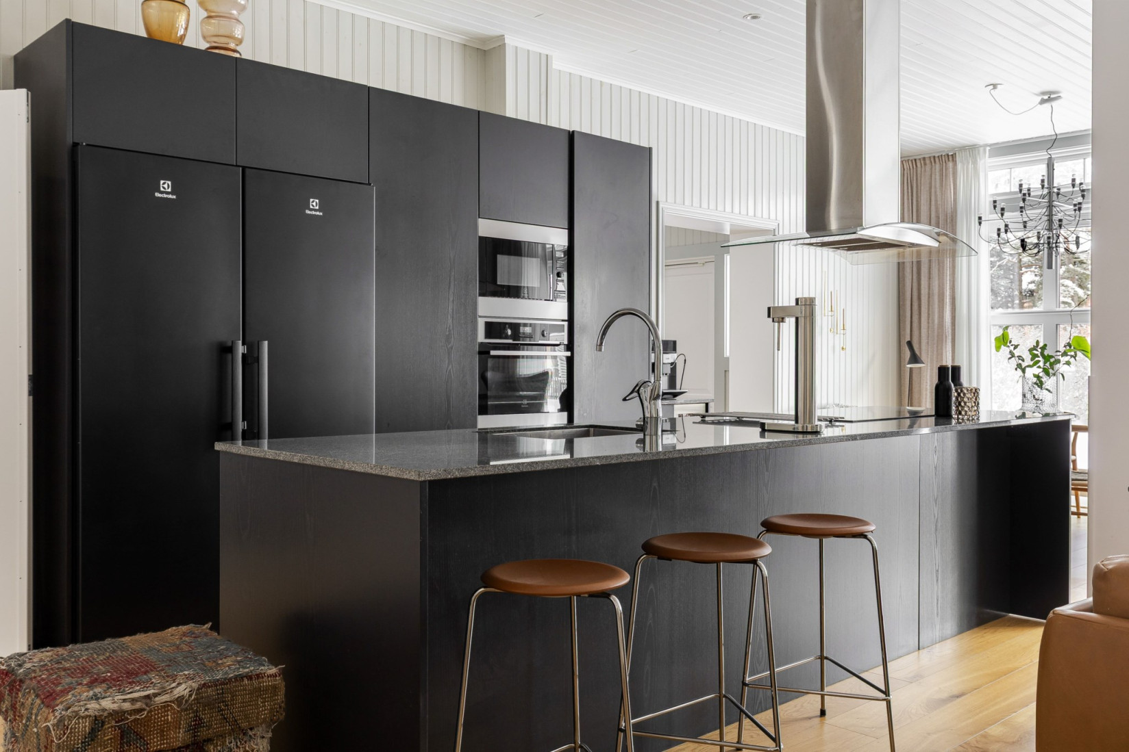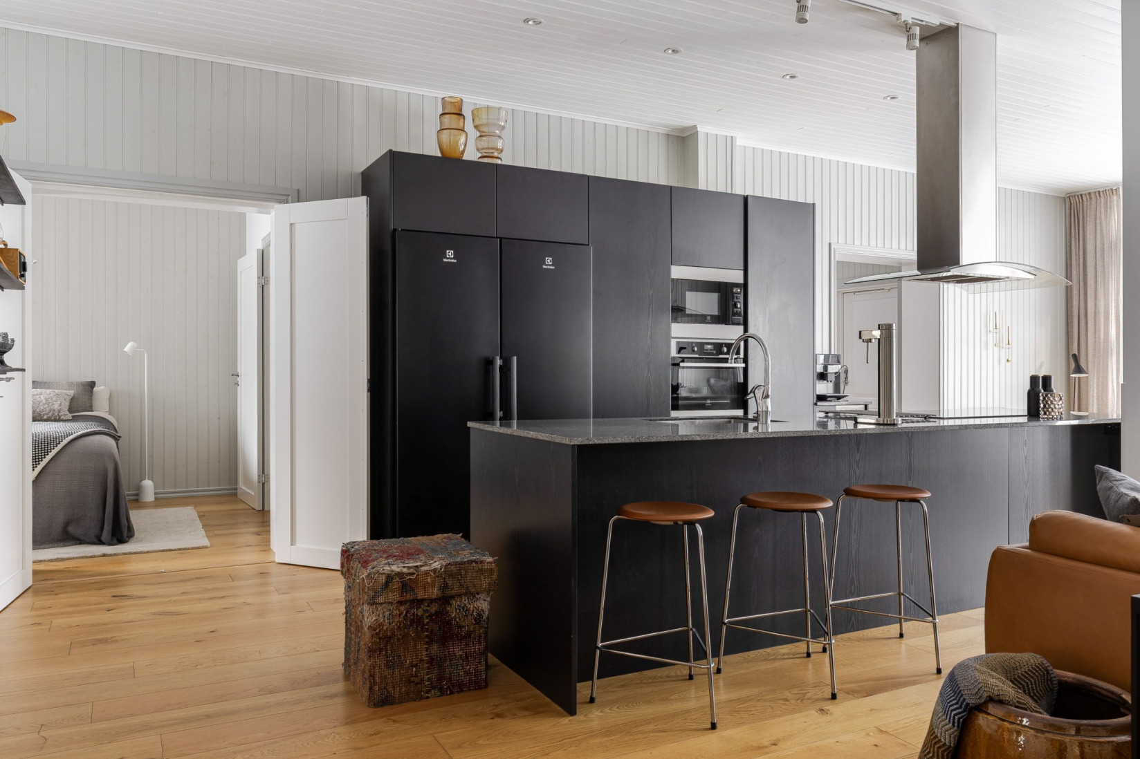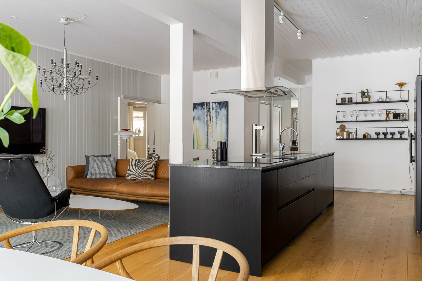 Den öppna ytan, om närmare 65 kvadratmeter, ger utrymme för både stora middagar och avslappnade kvällar. Köksön blir en naturlig samlingspunkt där samtalen fortsätter långt efter att maten är serverad.