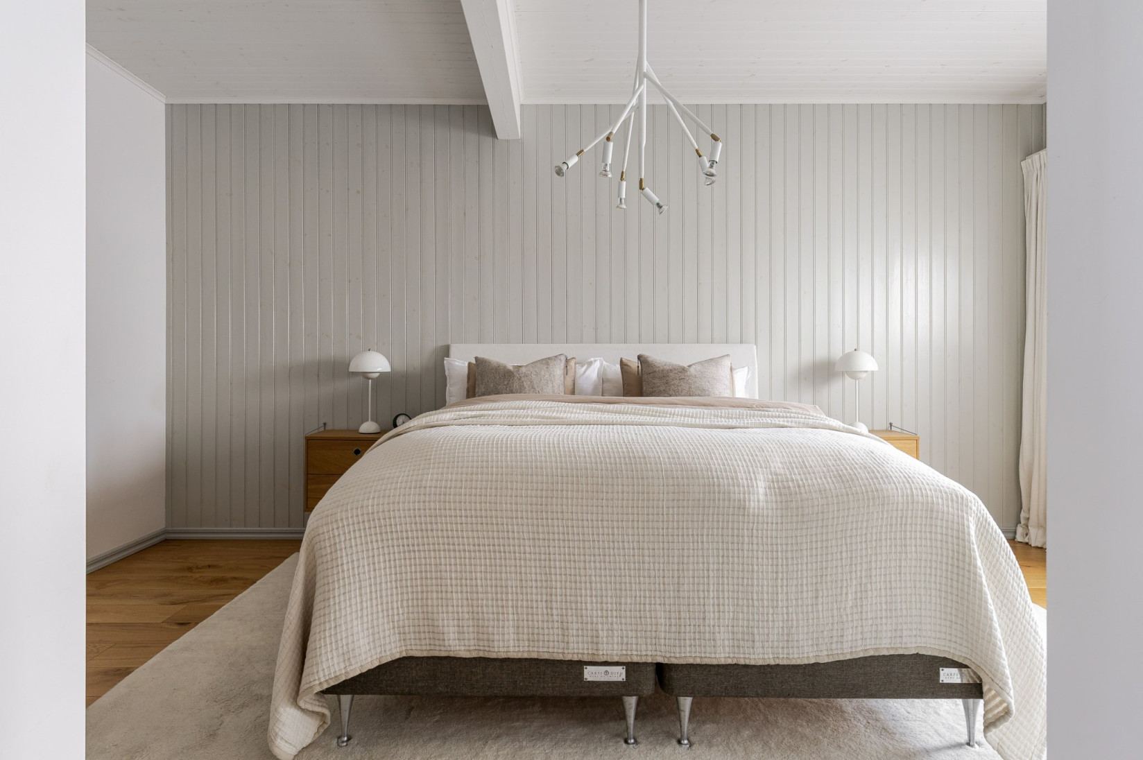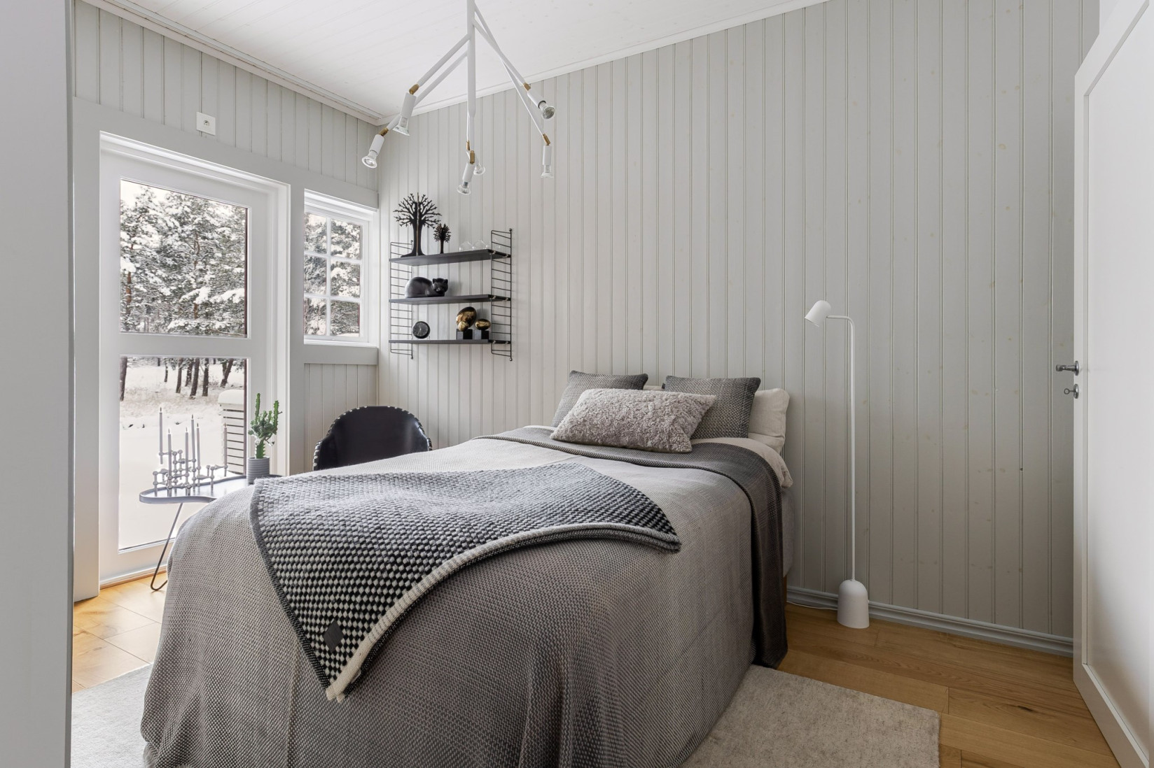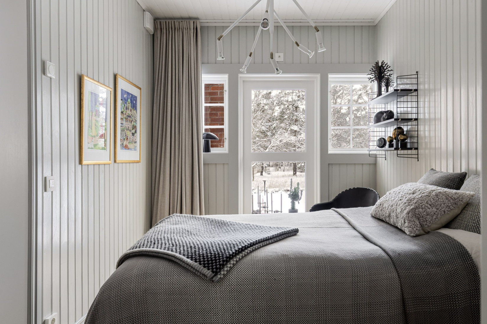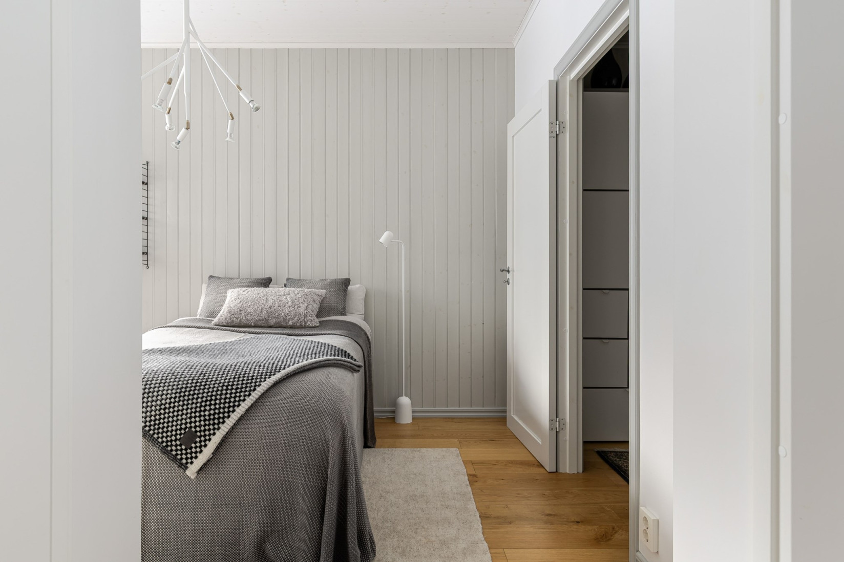 Det andra sovrummet passar lika bra för barn, gäster eller tonåring, med ljus från tre fönsterpartier, varav ett i full höjd. Härifrån nås en generös klädkammare som även lämpar sig för arbetsplats, läshörna eller extra sovplats.