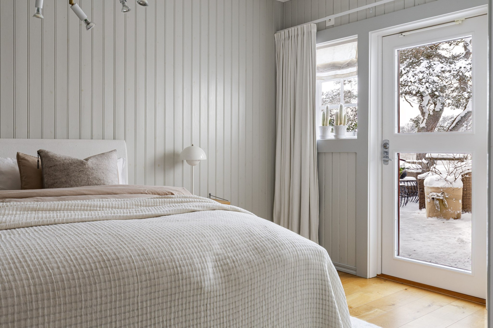 I den mer privata delen av bostaden leder dubbeldörrar vidare till det största sovrummet. Rummet erbjuder generösa ytor och ett rogivande ljus, med direkt access till terrassen och den omgivande utemiljön – en vy som sätter tonen för dagen redan från morgonen.