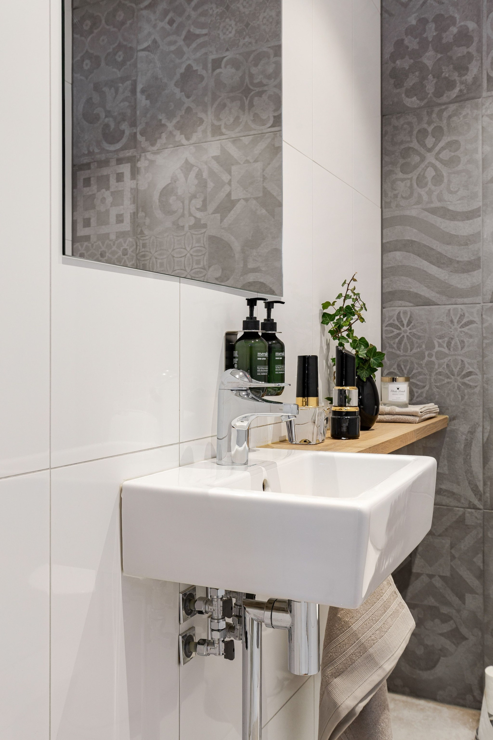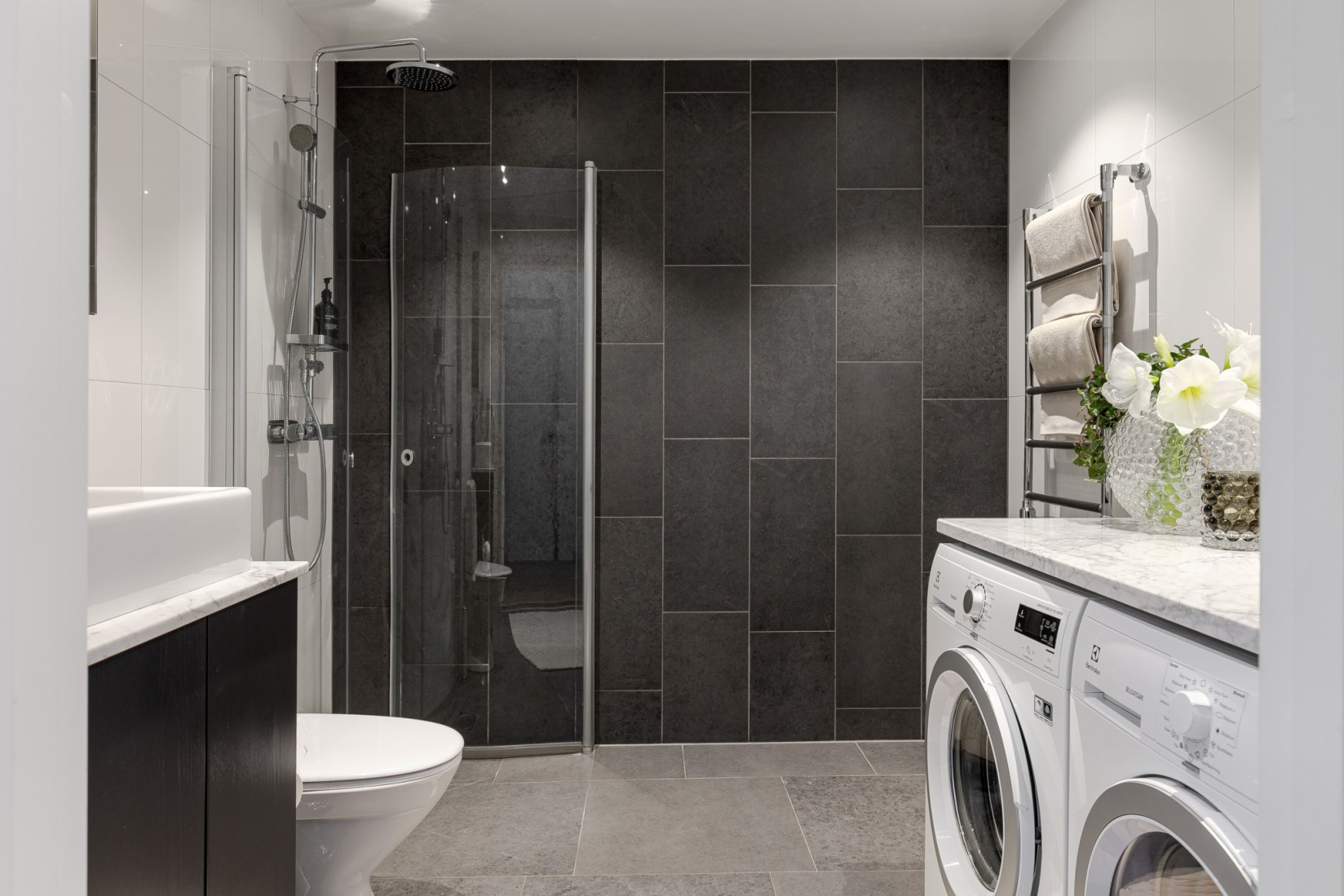 Badrummet är rymligt och genomarbetat med inredning från Kvänum. Väggarna kläs av breda, kakelplattor i lodrätt sättning som ger ett elegant uttryck. Här finns kommod, spegelskåp, takdusch, vikbara glasväggar, handdukstork samt tvättmaskin och torktumlare. En avlastningsyta i marmor, golvvärme och infälld belysning fulländar rummet.