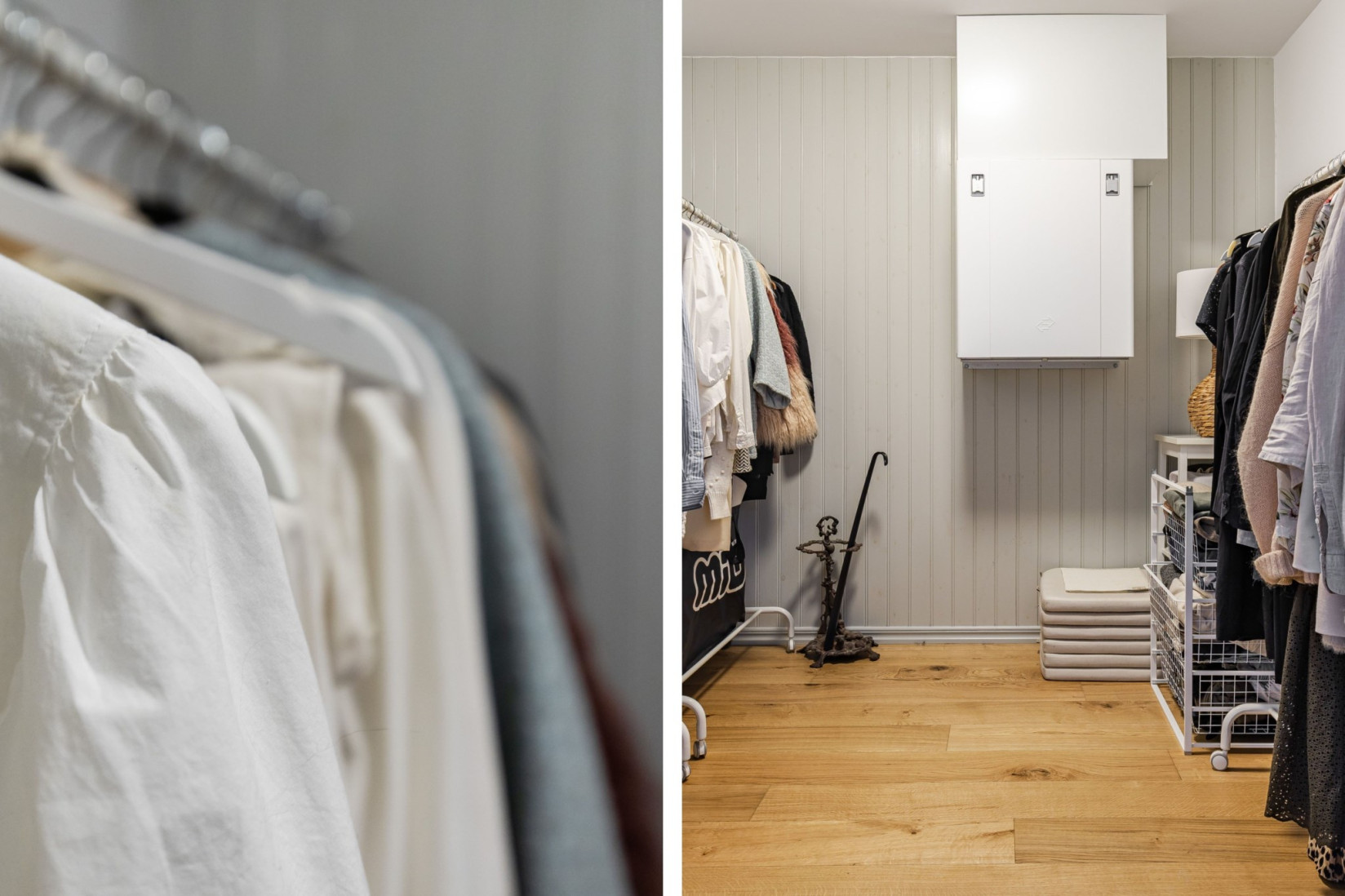 Hallen erbjuder plats för ytterkläder och skor, och för den som önskar en mer avskalad entré finns en rymlig klädkammare, smart inredd för effektiv förvaring. I anslutning nås gästtoaletten, helkaklad och inredd med inredning från Kvänum.