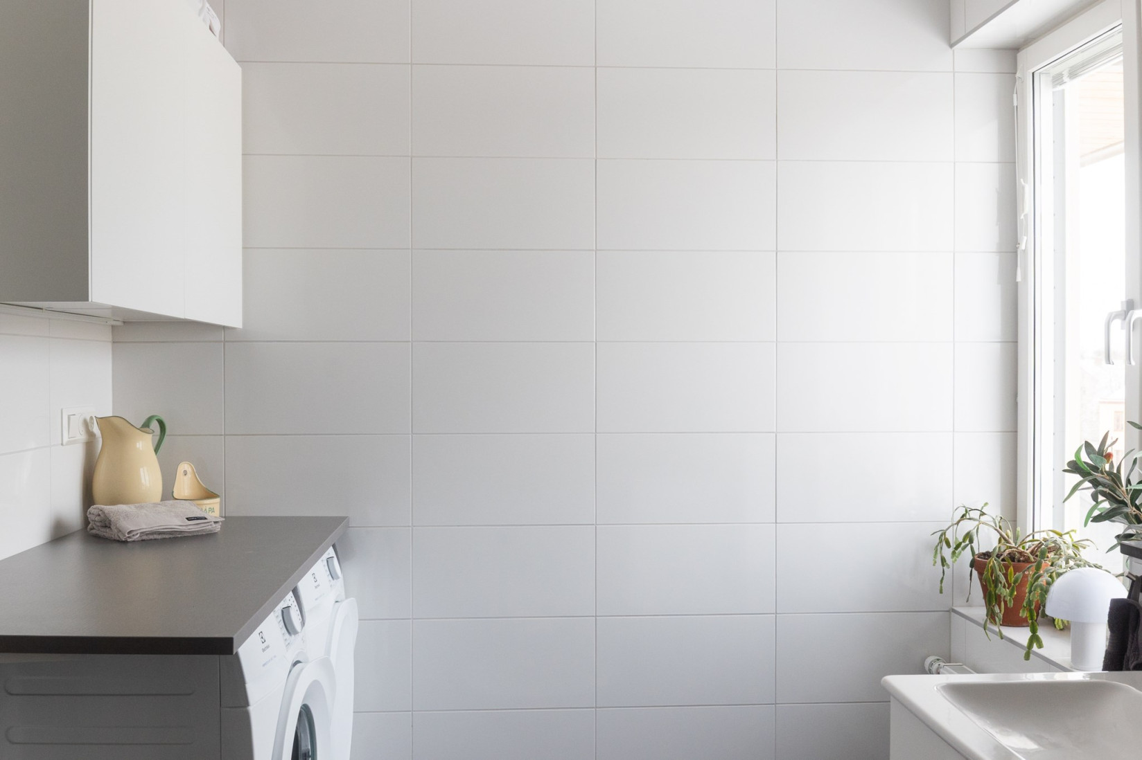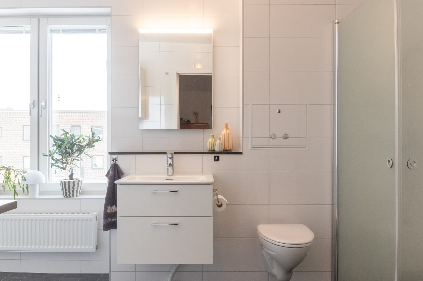 Badrummet är väl tilltaget och helkaklat i tidlösa materialval. Utrustningen består av dusch med infällbara glasväggar, kommod, handdukstork och vägghängd toalett skapas en praktisk och trivsam helhet. Tvättmaskin och torktumlare är snyggt integrerade under arbetsbänk, och fönstret släpper in naturligt ljus samt gör vädring enkel.