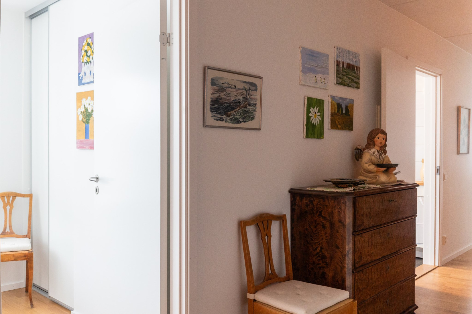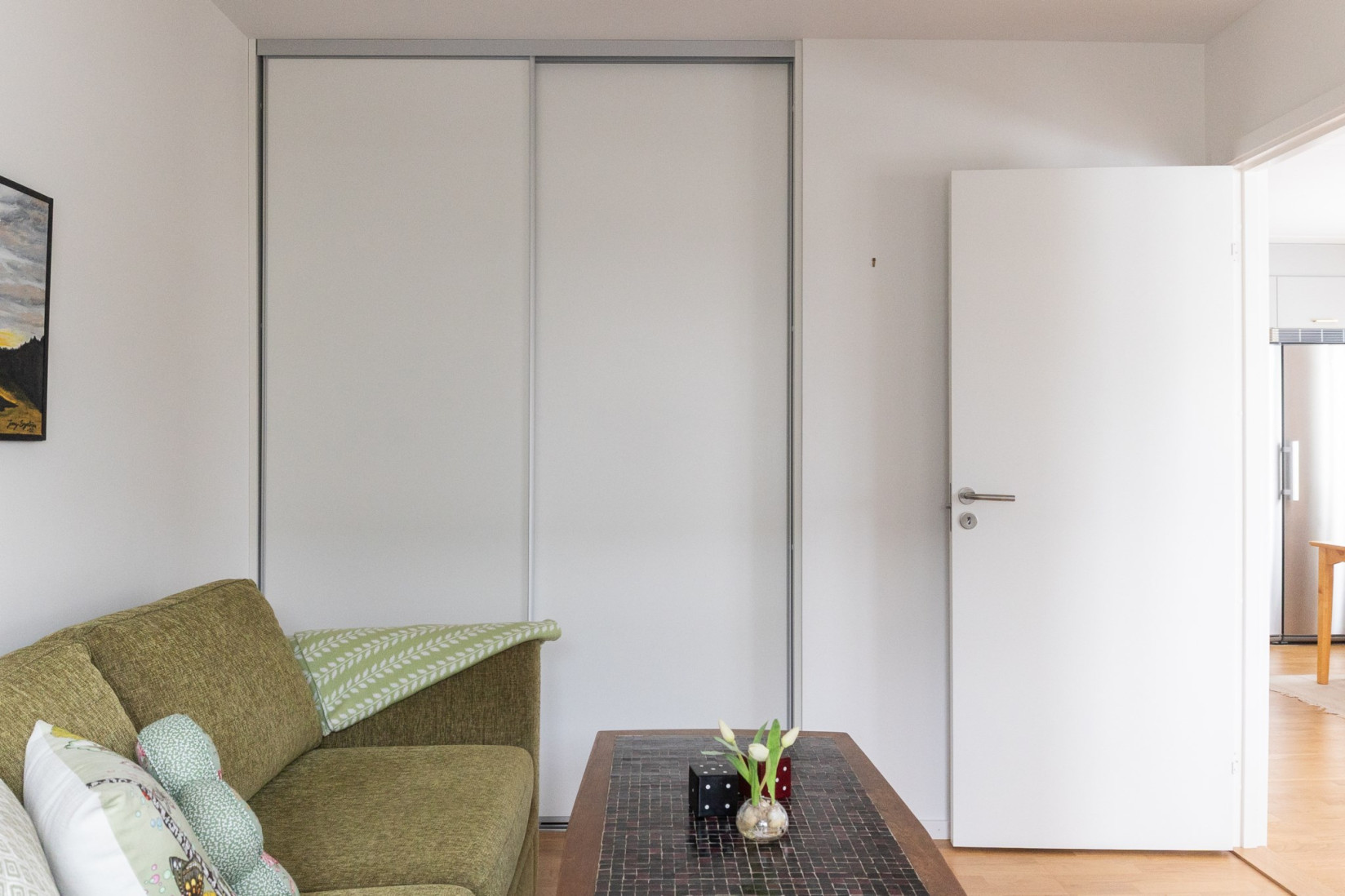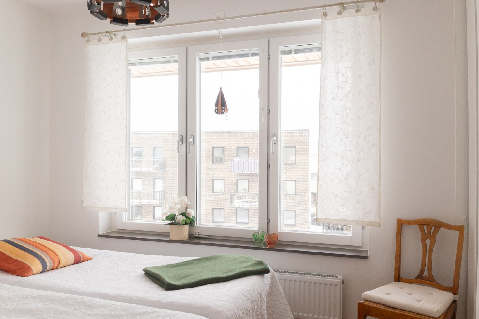 Bostaden rymmer två stora sovrum placerade i varsin ände, vilket ger en genomgående och välbalanserad planlösning. Det ena nås direkt från hallen, det andra från vardagsrummet, båda med skjutgarderober som bidrar till ett ordnat intryck. För den som inte behöver två sovrum passar det ena lika bra som kontor, gästrum eller barnrum – ett rum som enkelt anpassas efter livets olika skeden.