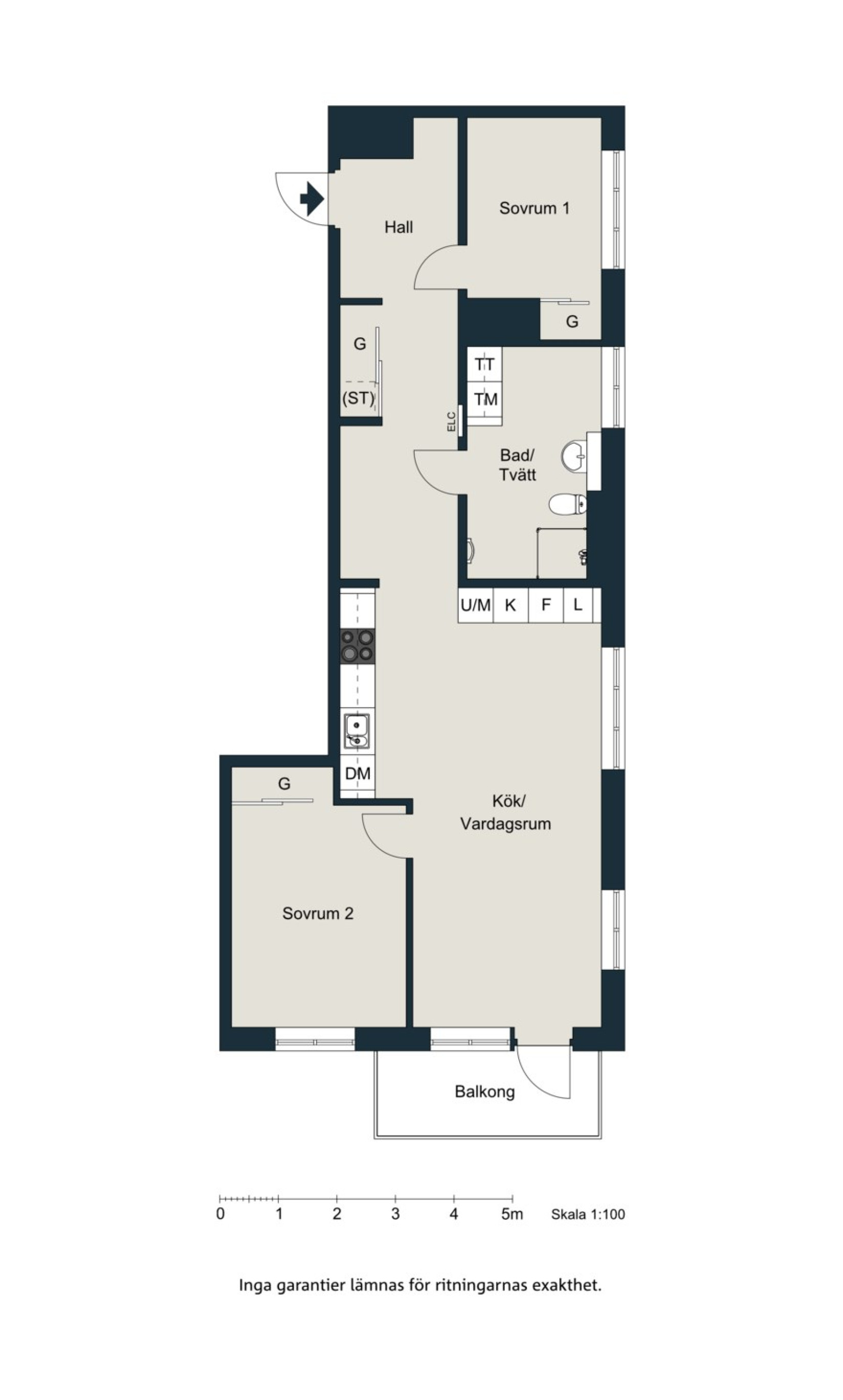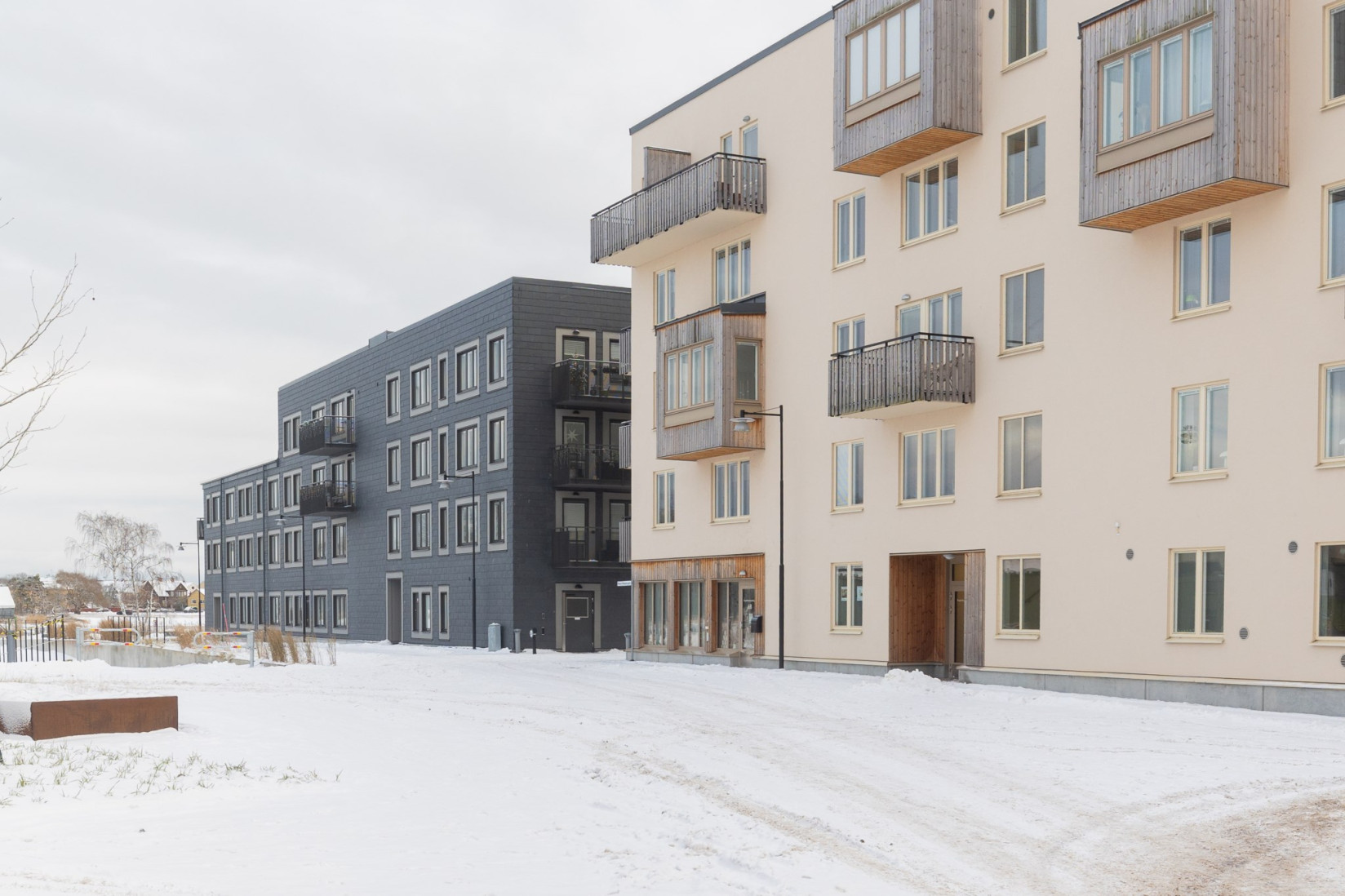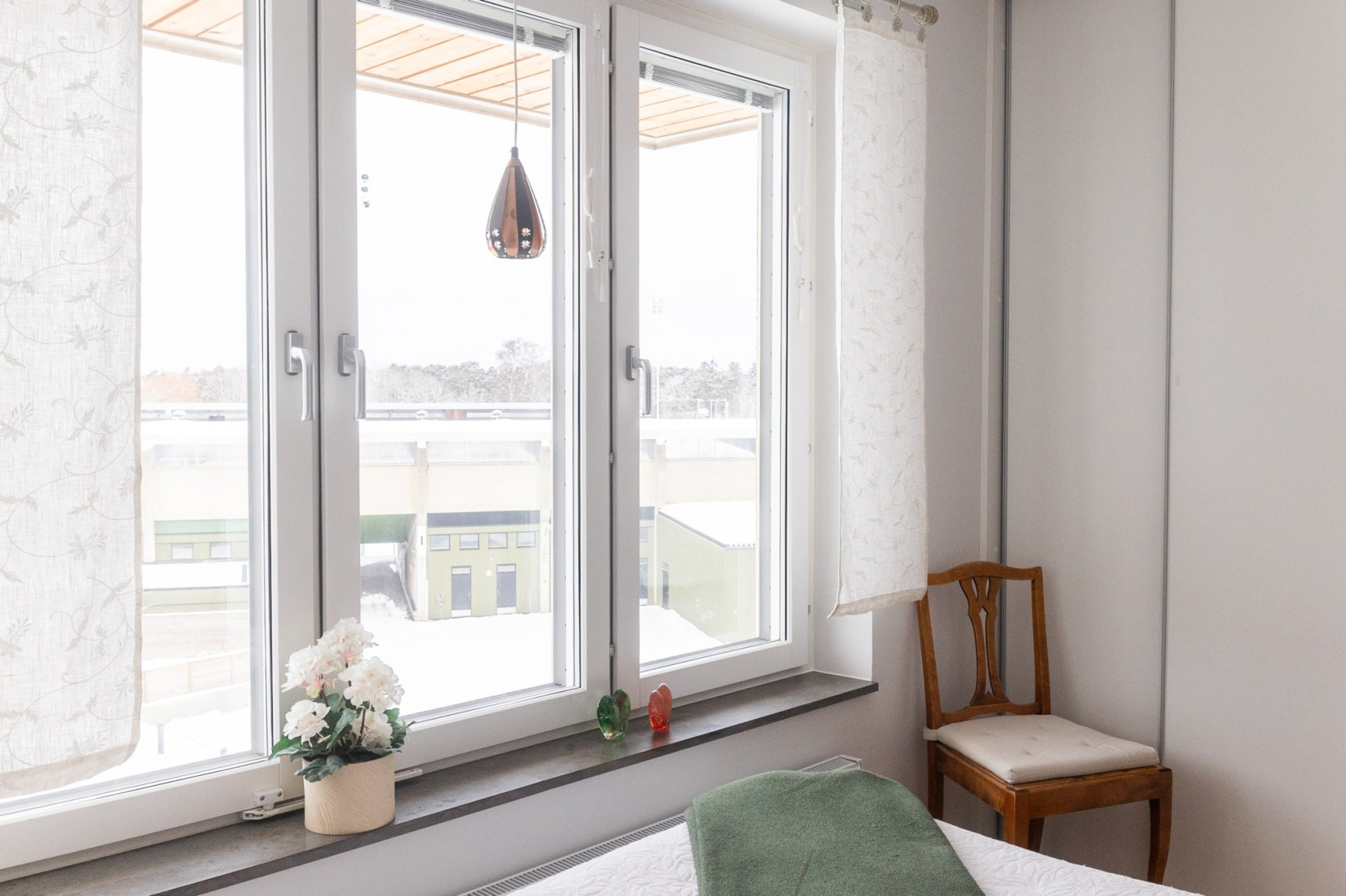 Bostaden rymmer två stora sovrum placerade i varsin ände, vilket ger en genomgående och välbalanserad planlösning. Det ena nås direkt från hallen, det andra från vardagsrummet, båda med skjutgarderober som bidrar till ett ordnat intryck. För den som inte behöver två sovrum passar det ena lika bra som kontor, gästrum eller barnrum – ett rum som enkelt anpassas efter livets olika skeden.